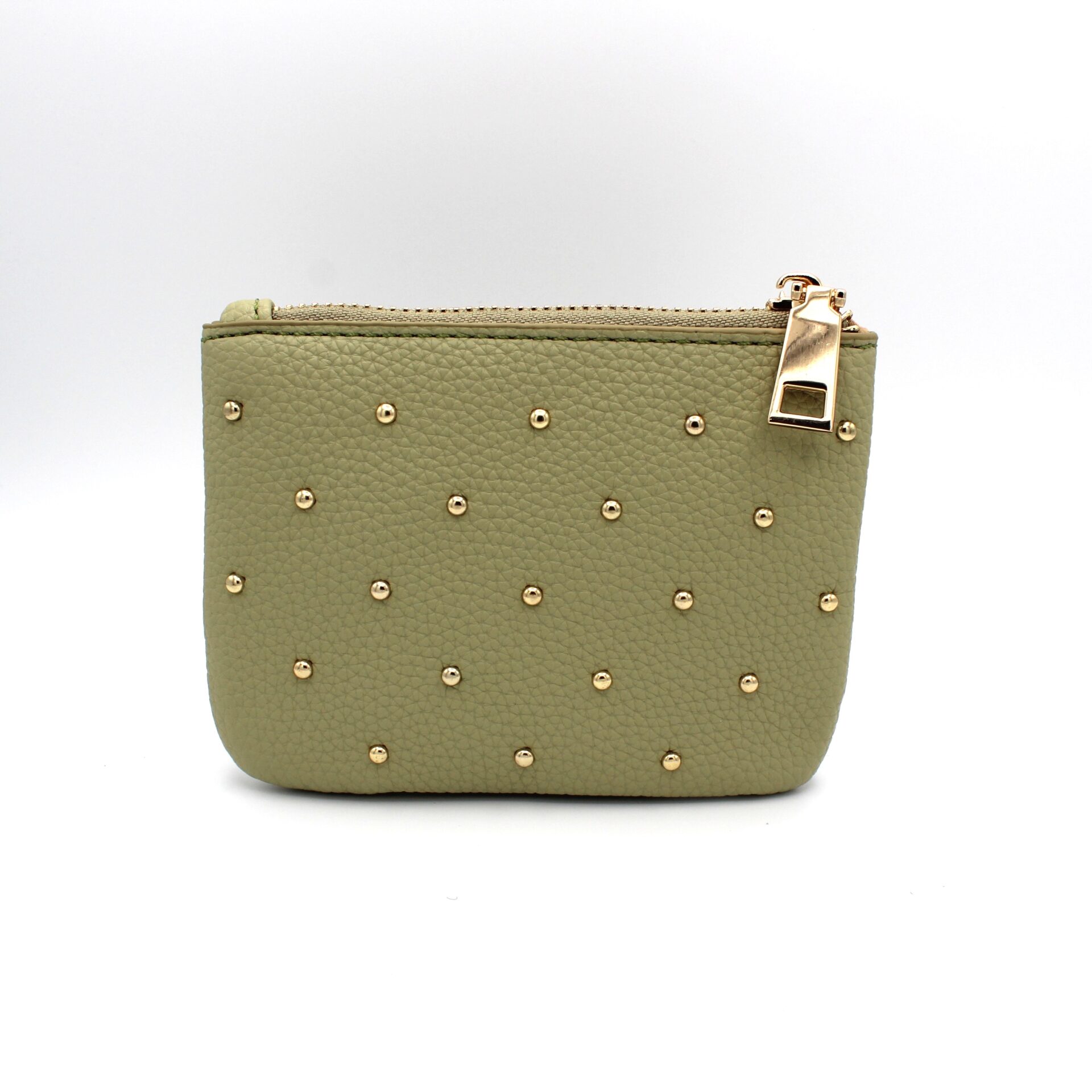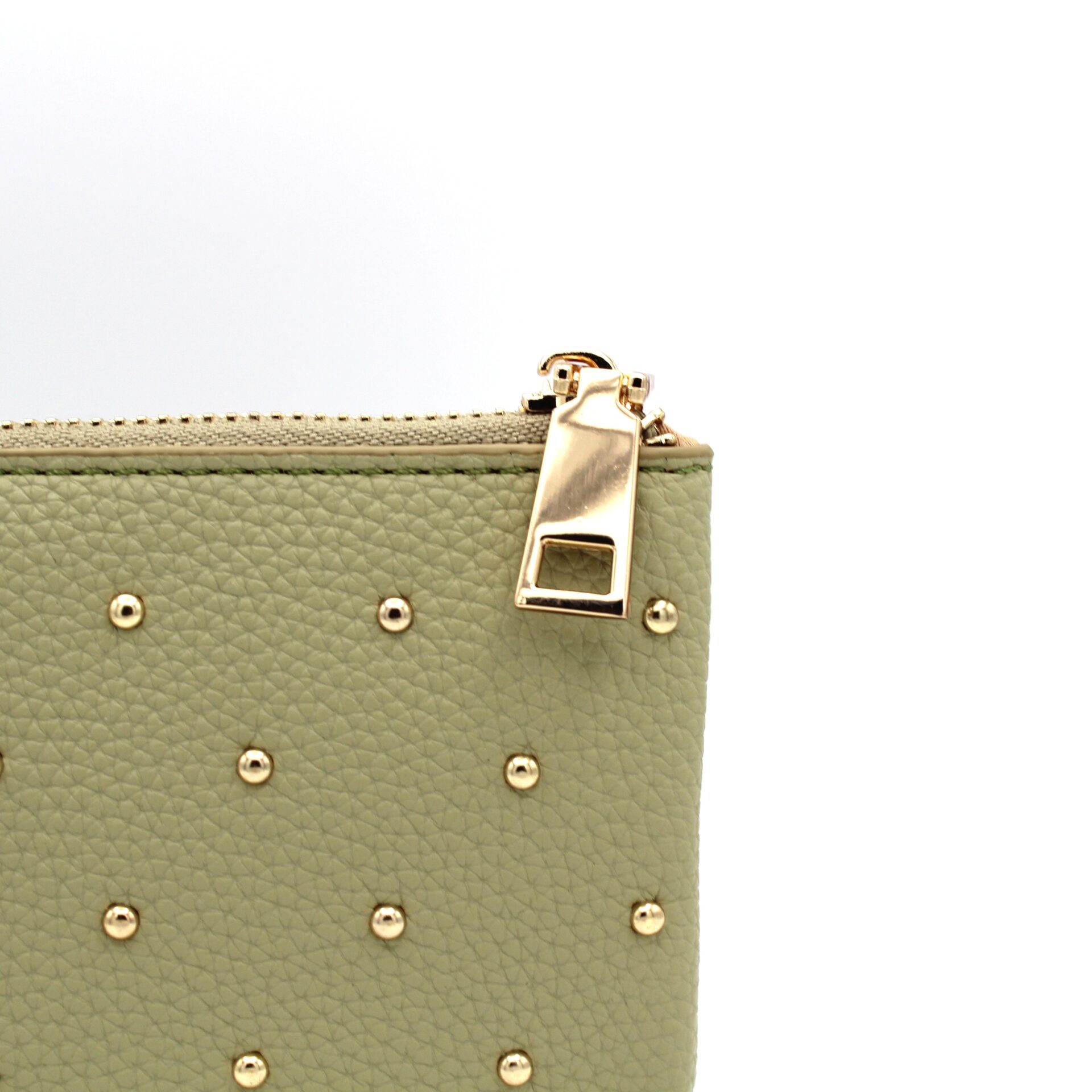 Monedero de piel en tono verde agua. Decoración con tachuelas. Cremallera dorada en la parte superior.