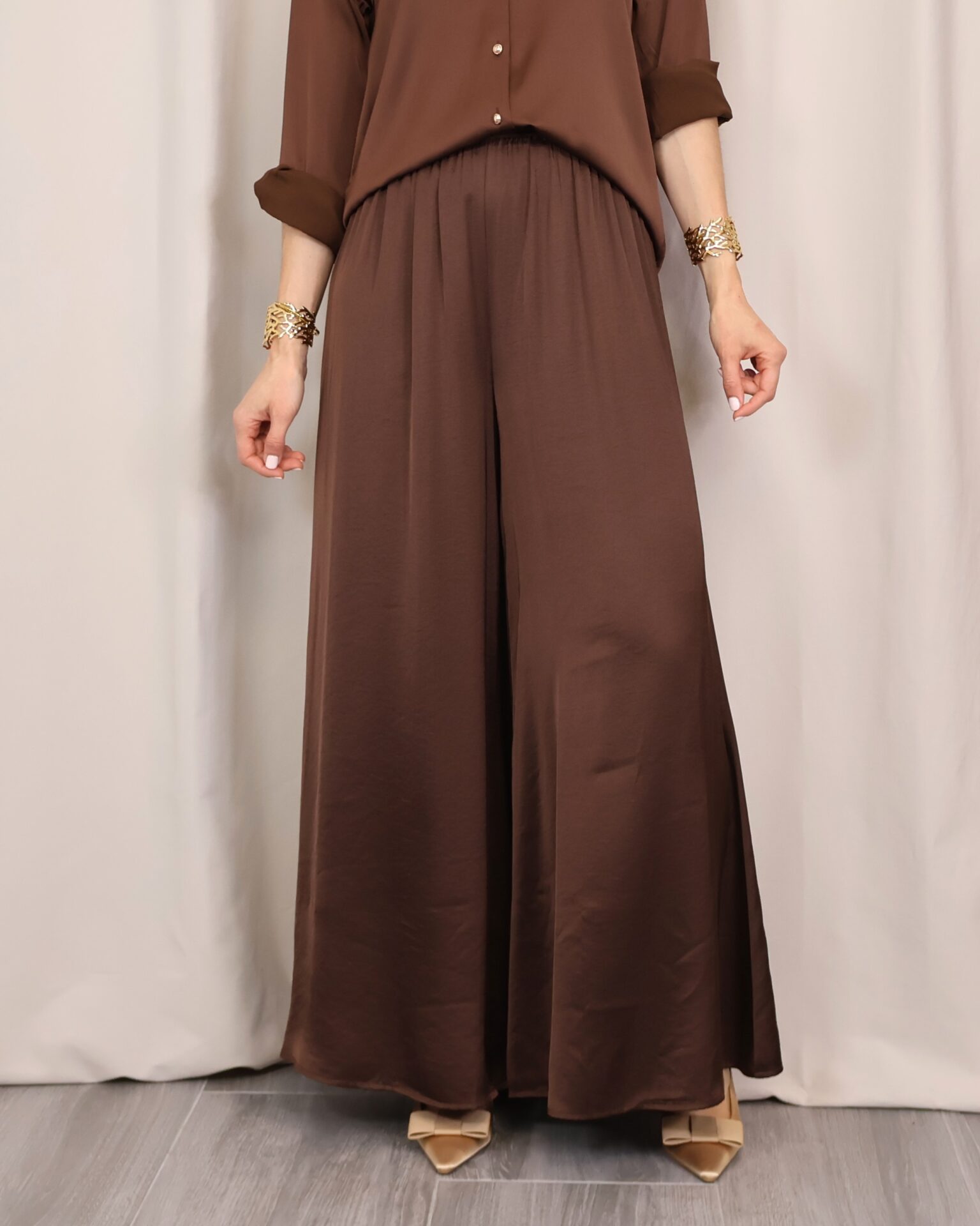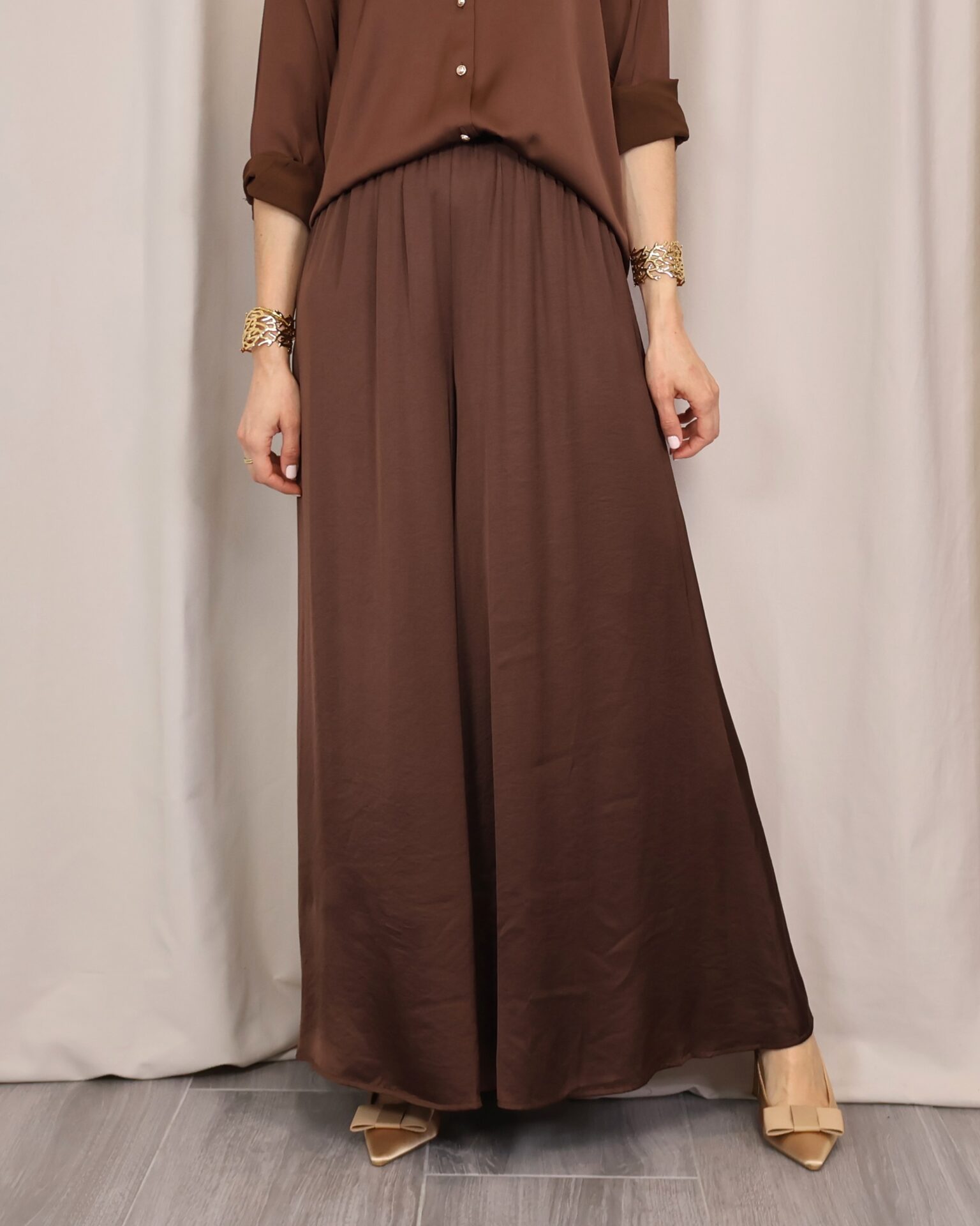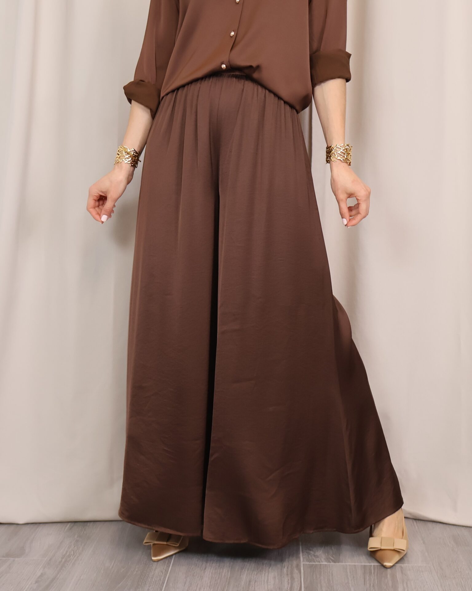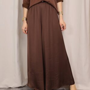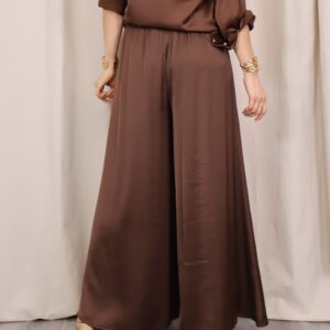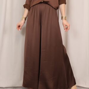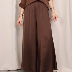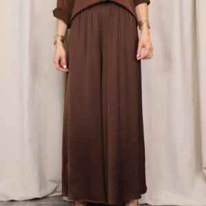 Pantalón palazzo satinado en elegante tono marrón chocolate, una prenda fluida y sofisticada perfecta para cualquier ocasión. Su diseño de talla única se adapta cómodamente a diferentes siluetas gracias a la goma elástica en todo el contorno de la cintura, garantizando un ajuste confortable y favorecedor. El acabado satinado aporta un toque de brillo sutil, ideal para elevar tanto looks casuales como más arreglados.