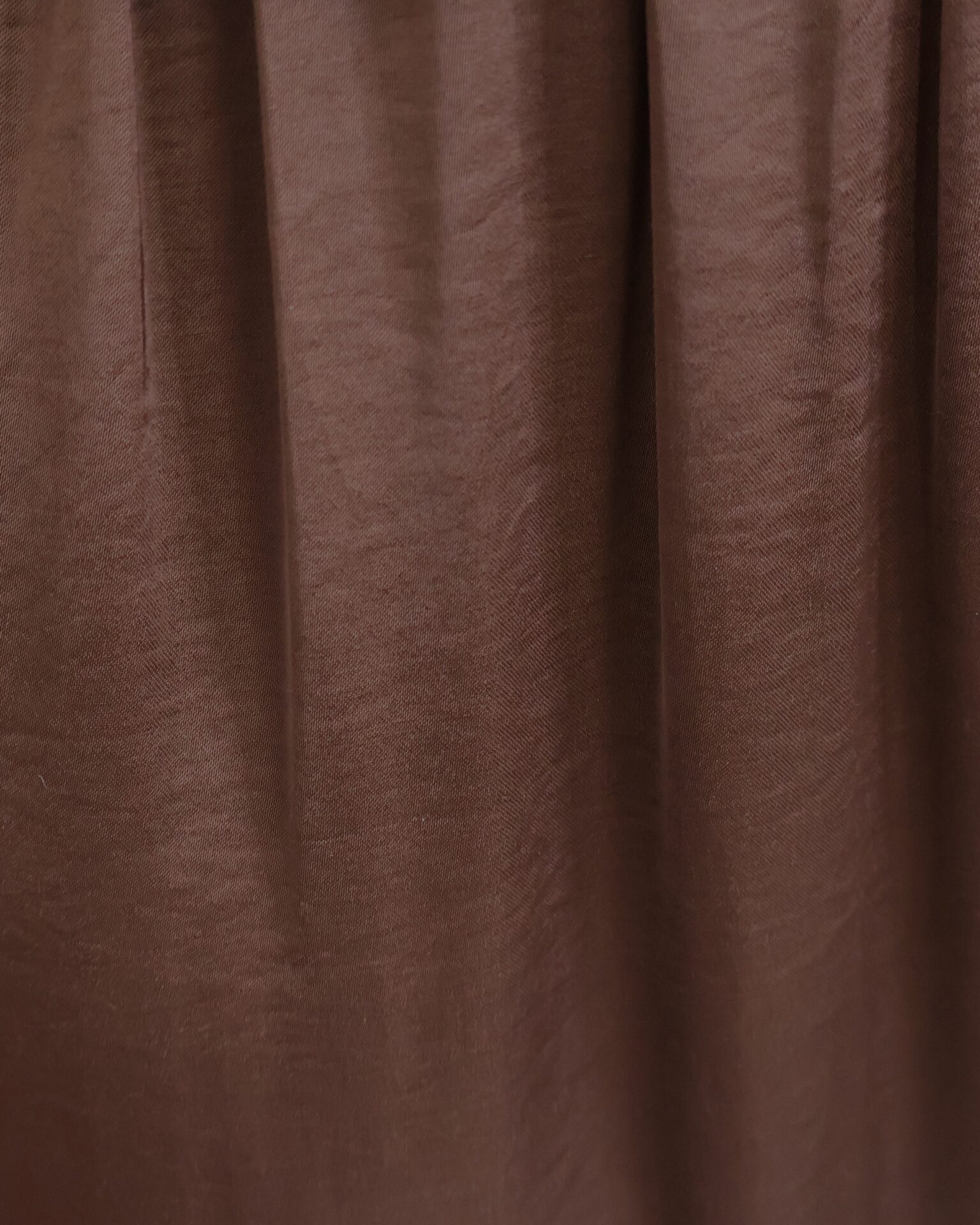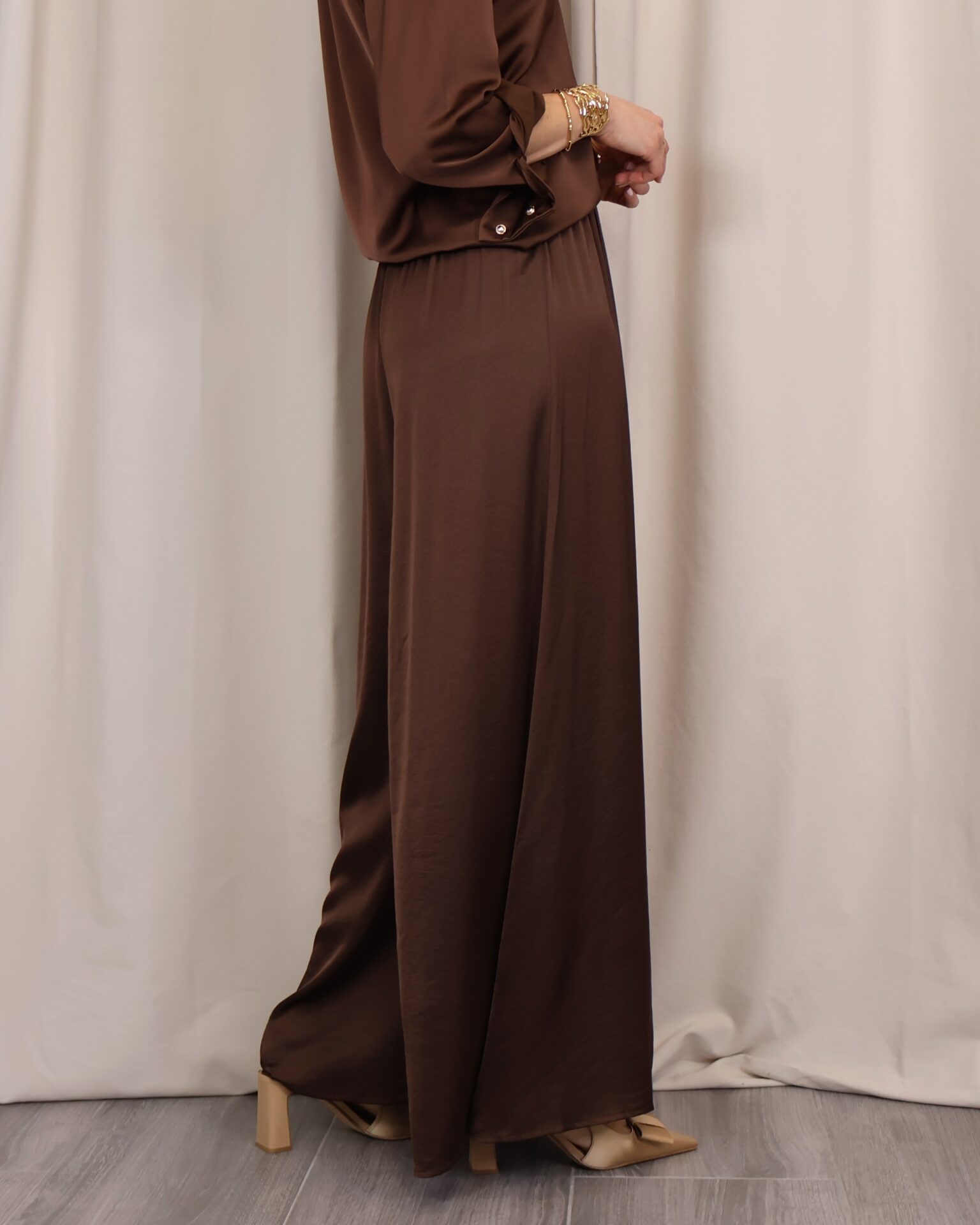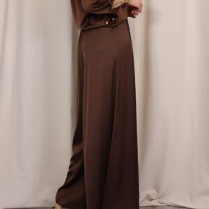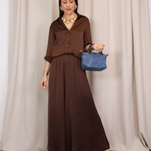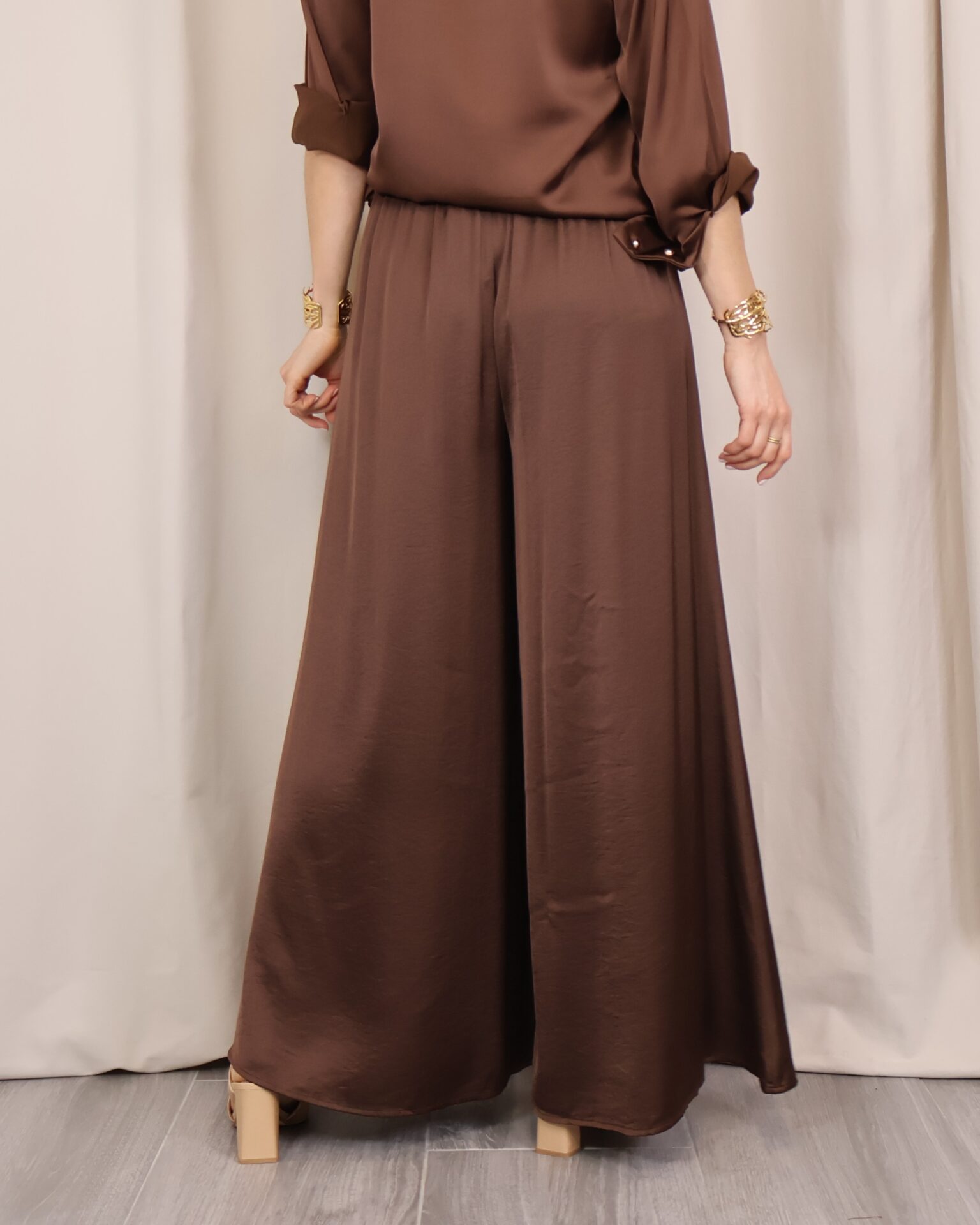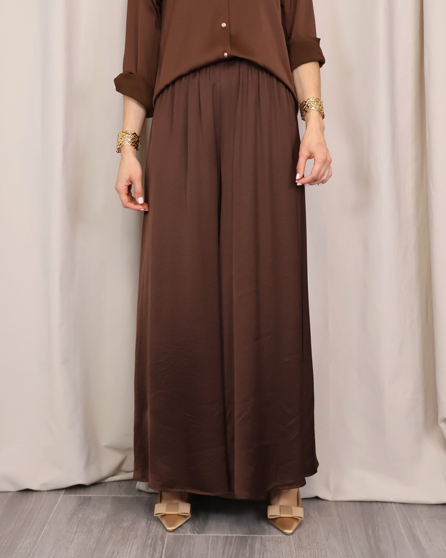 Pantalón palazzo satinado en elegante tono marrón chocolate, una prenda fluida y sofisticada perfecta para cualquier ocasión. Su diseño de talla única se adapta cómodamente a diferentes siluetas gracias a la goma elástica en todo el contorno de la cintura, garantizando un ajuste confortable y favorecedor. El acabado satinado aporta un toque de brillo sutil, ideal para elevar tanto looks casuales como más arreglados.