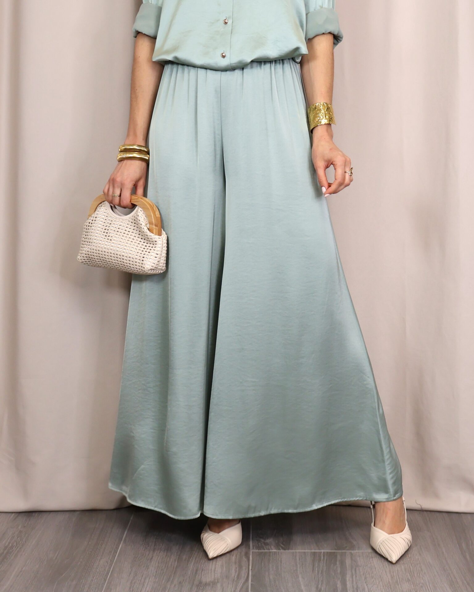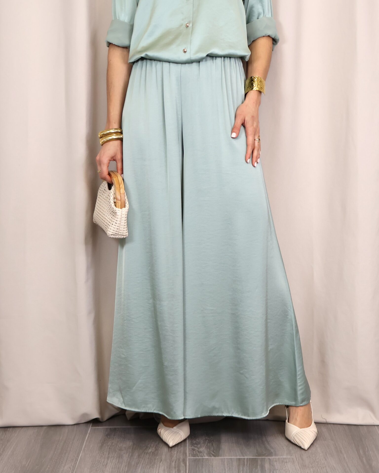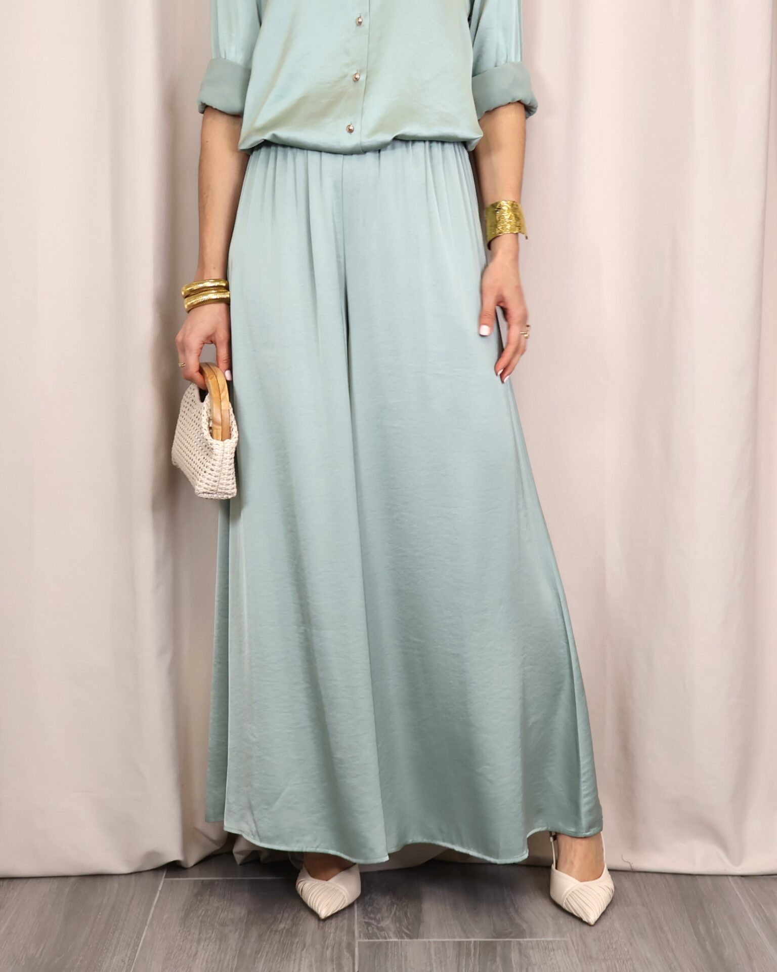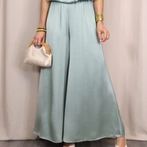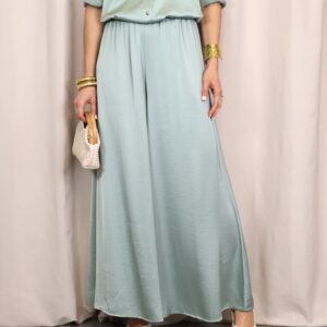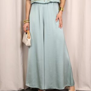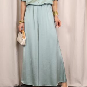 Pantalón palazzo satinado en elegante tono verde agua, una prenda fluida y sofisticada perfecta para cualquier ocasión. Su diseño de talla única se adapta cómodamente a diferentes siluetas gracias a la goma elástica en todo el contorno de la cintura, garantizando un ajuste confortable y favorecedor. El acabado satinado aporta un toque de brillo sutil, ideal para elevar tanto looks casuales como más arreglados.