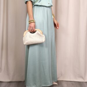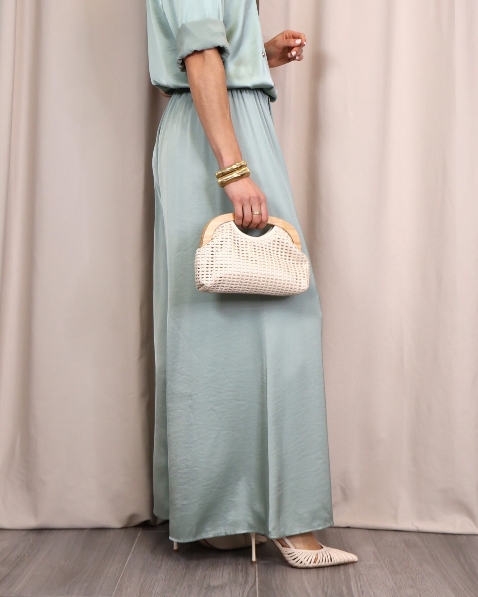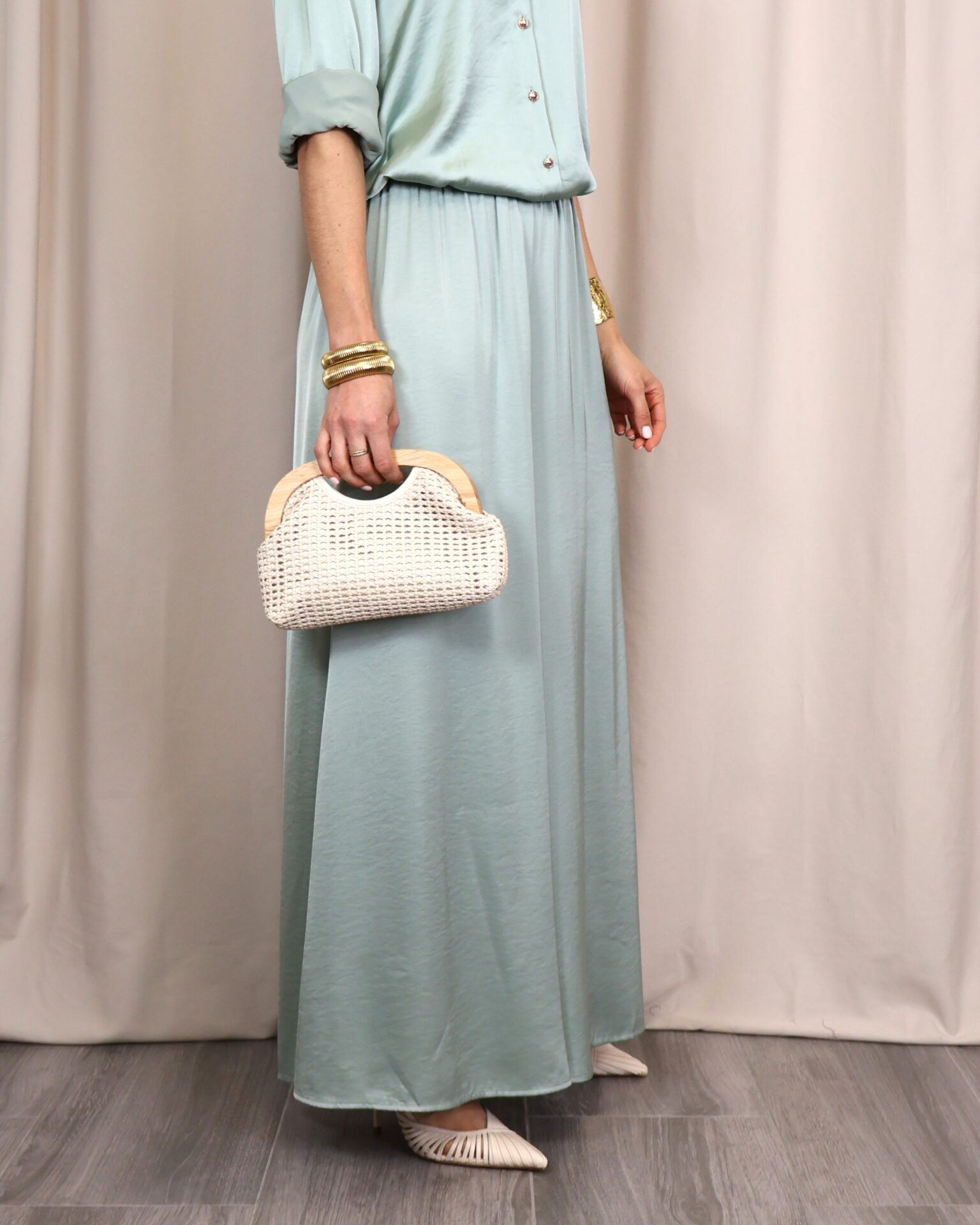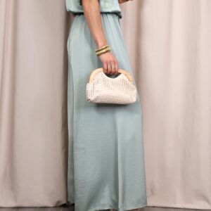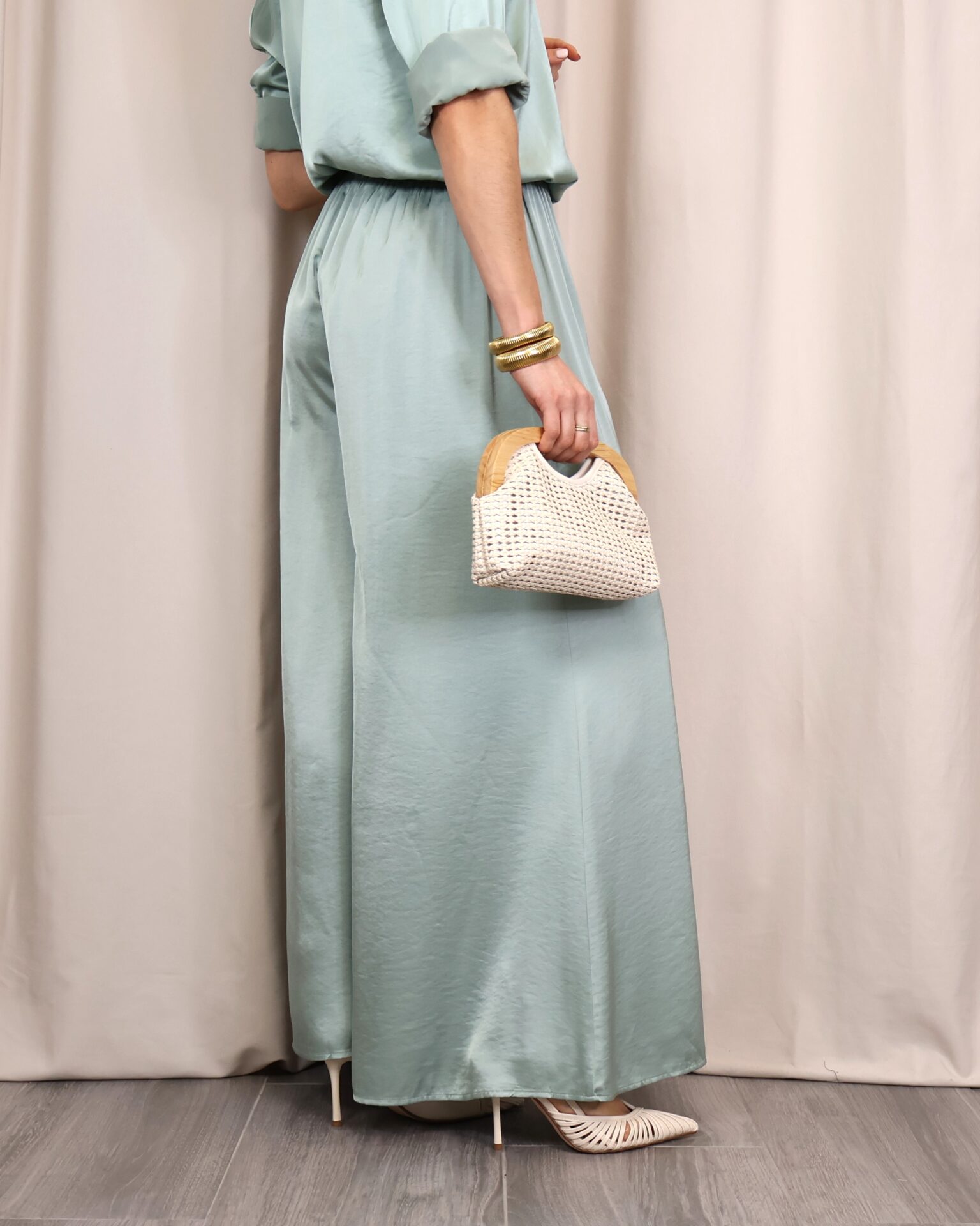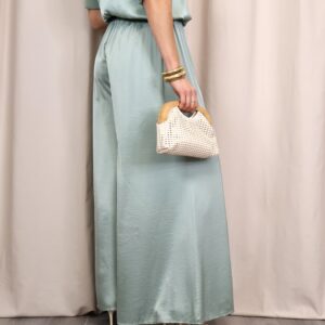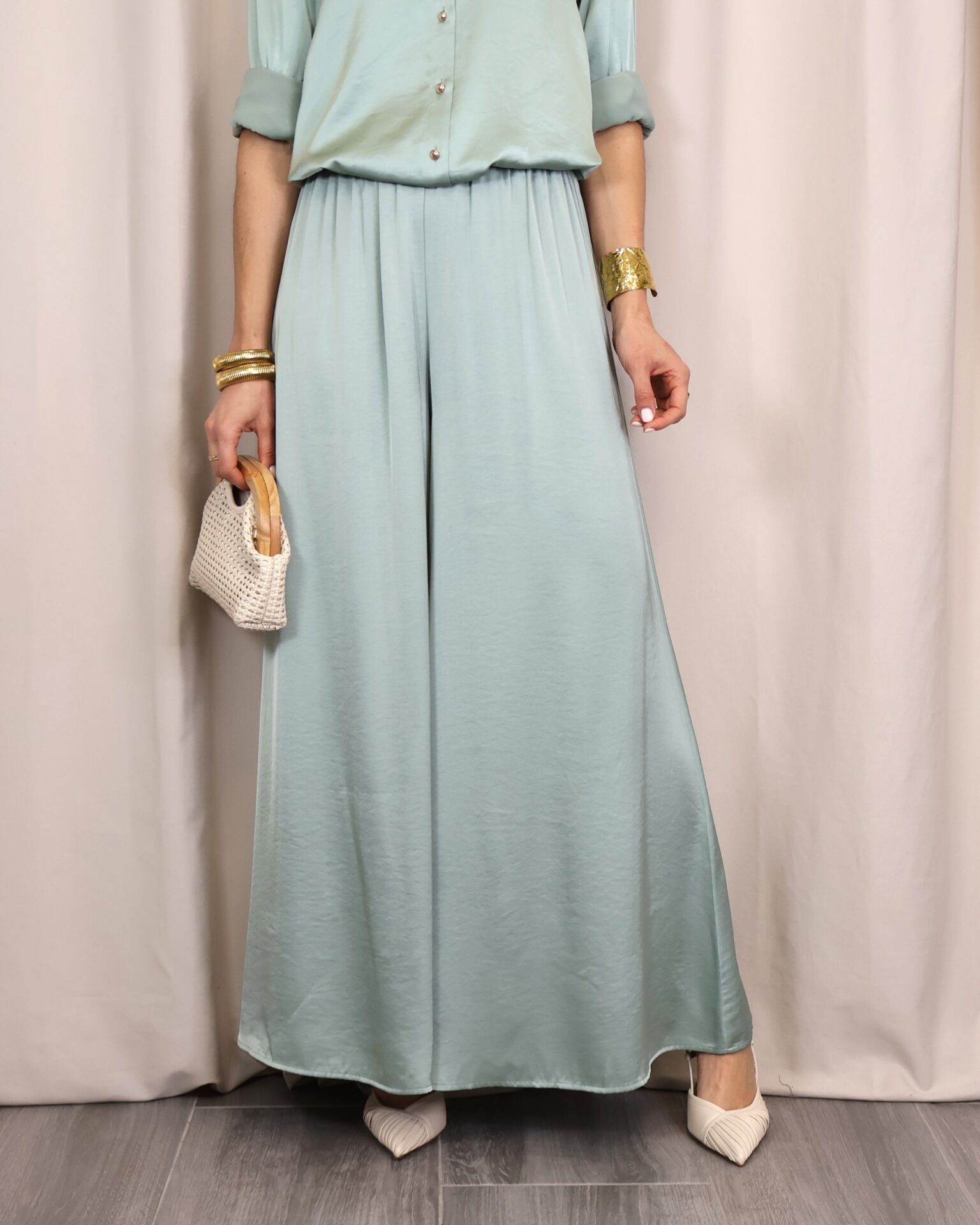 Pantalón palazzo satinado en elegante tono verde agua, una prenda fluida y sofisticada perfecta para cualquier ocasión. Su diseño de talla única se adapta cómodamente a diferentes siluetas gracias a la goma elástica en todo el contorno de la cintura, garantizando un ajuste confortable y favorecedor. El acabado satinado aporta un toque de brillo sutil, ideal para elevar tanto looks casuales como más arreglados.