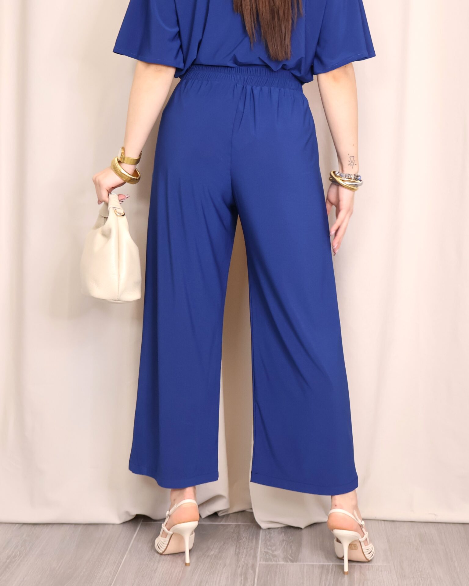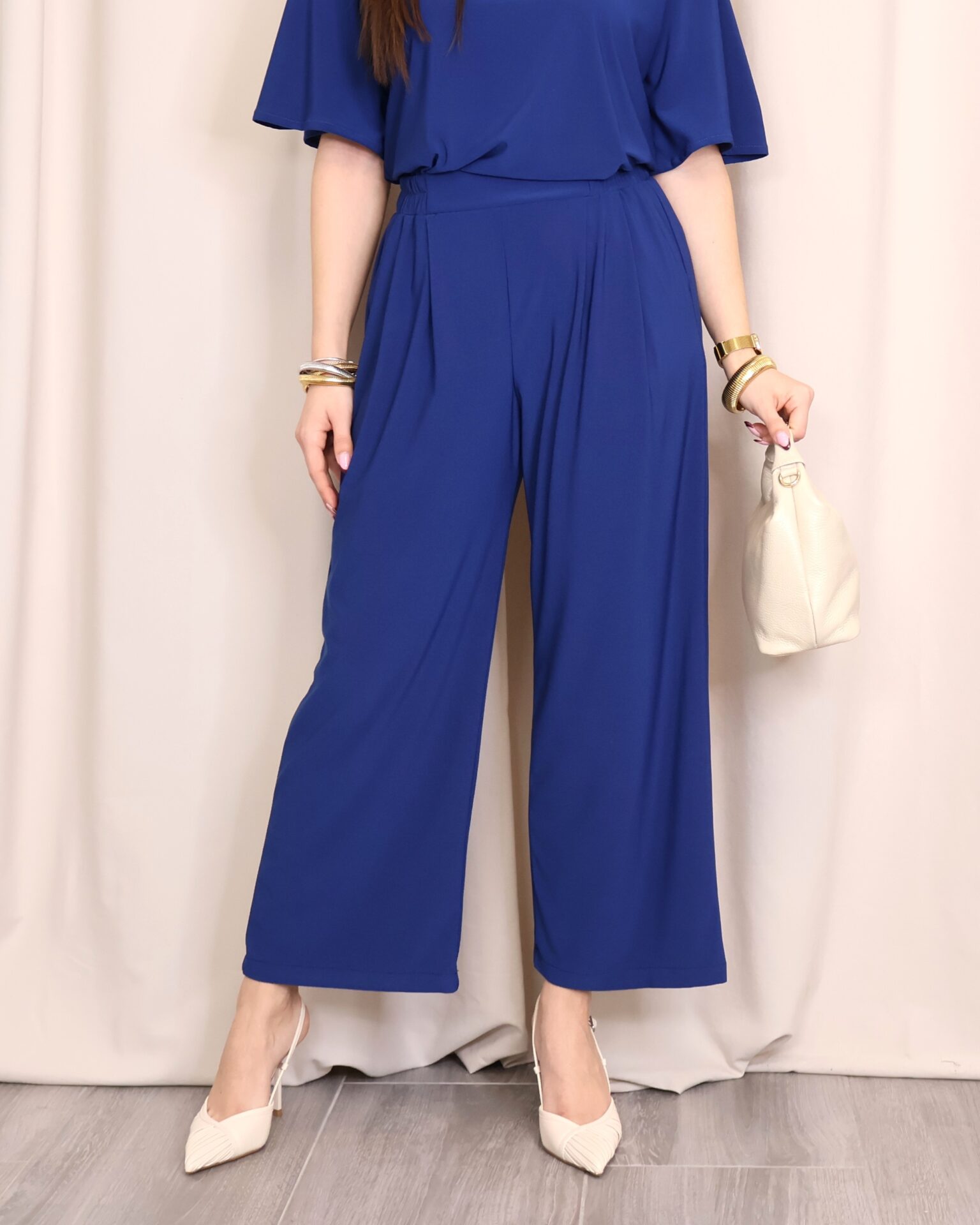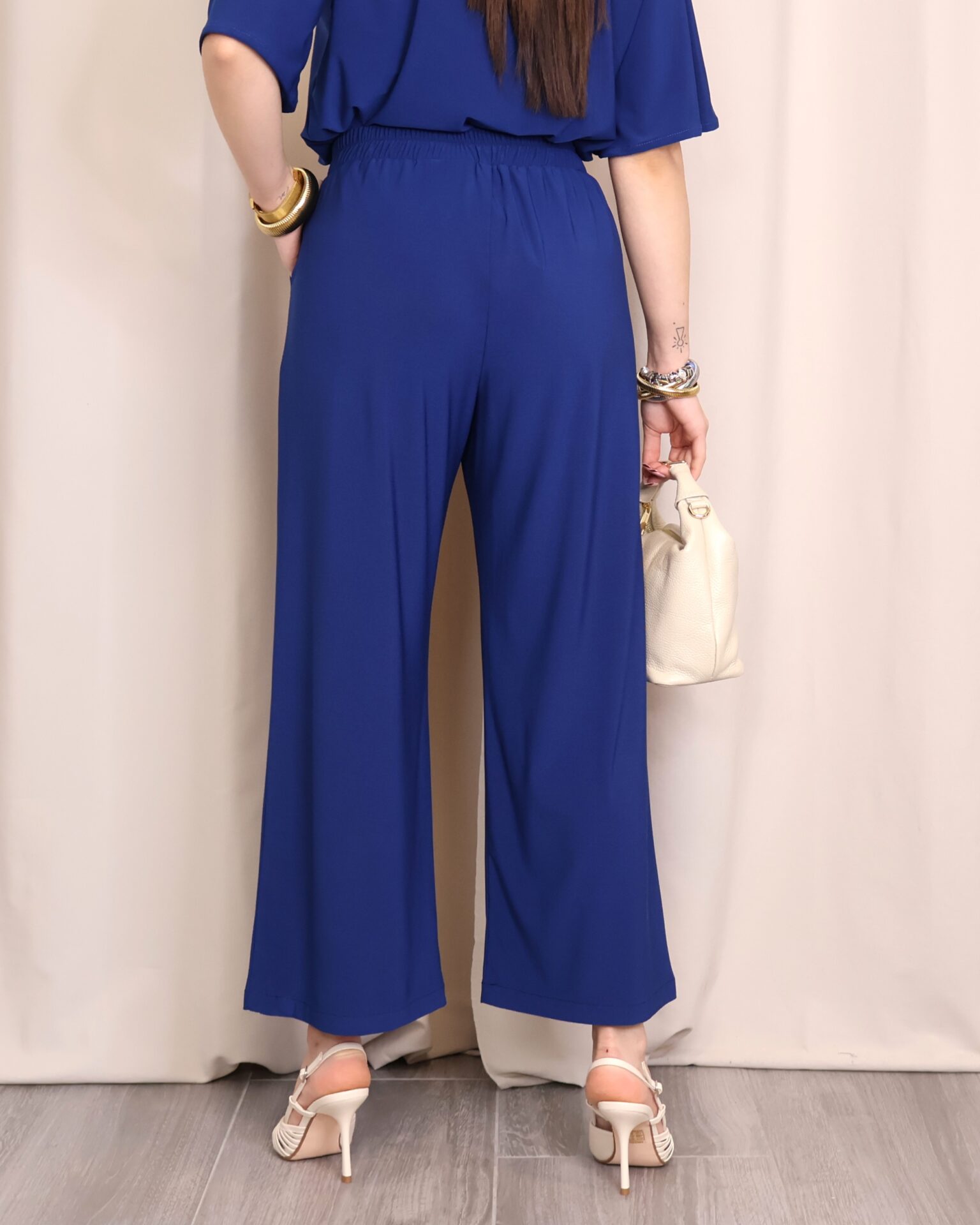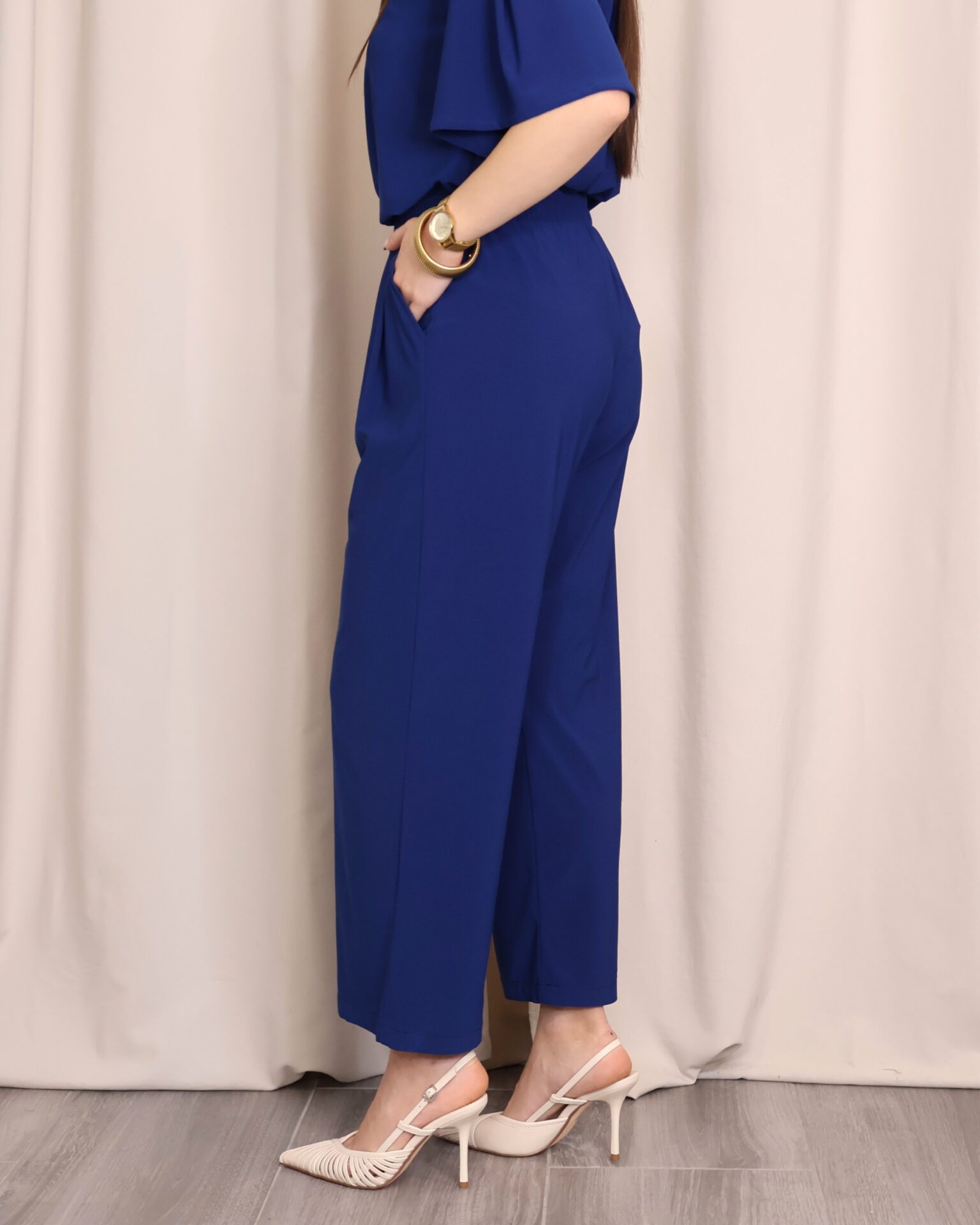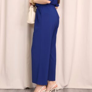 Pantalón de corte amplio y fluido, confeccionado en un tejido suave que aporta caída y elegancia. En un favorecedor color azul índigo, es una prenda versátil y fácil de combinar para cualquier ocasión. Diseñado con cintura lisa en la parte delantera y goma elástica en la parte trasera, se adapta cómodamente a la silueta ofreciendo un ajuste perfecto sin renunciar al confort. Incorpora bolsillos laterales que aportan funcionalidad y un toque desenfadado. Su pernera ancha y largo tobillero estilizan la figura, convirtiéndolo en una opción ideal tanto para looks diarios como para estilismos más sofisticados.