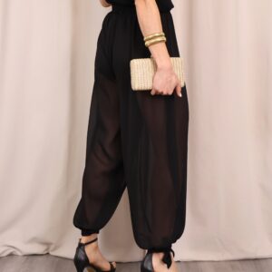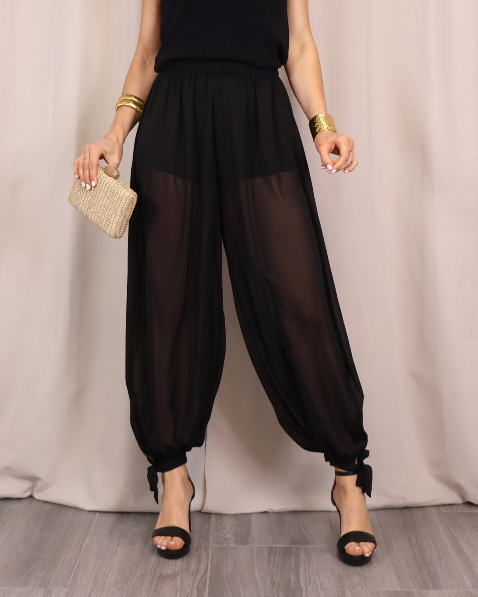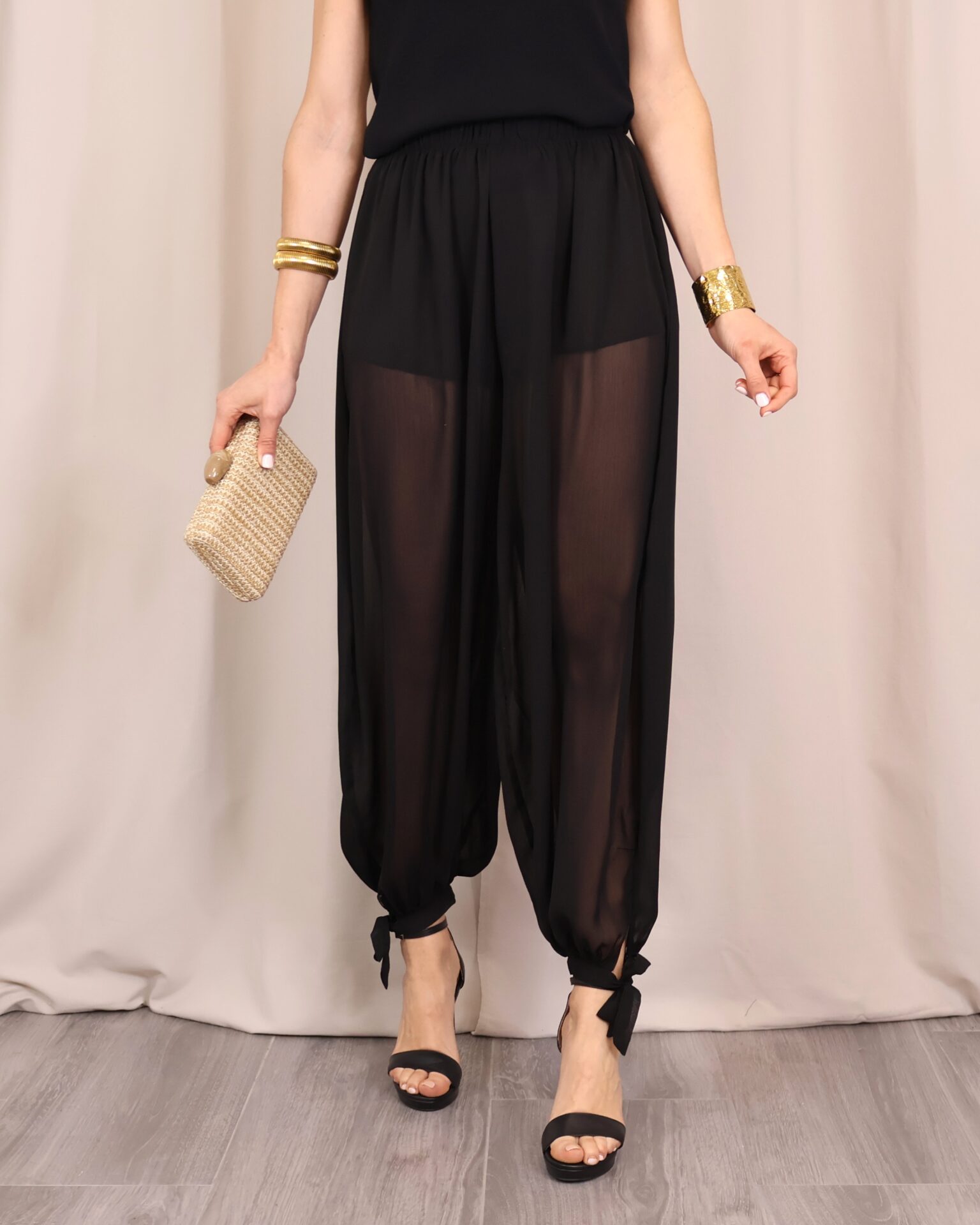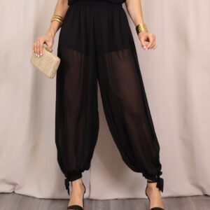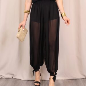 Pantalón bombacho en color negro tipo gasa, con un diseño ligero y fluido que aporta movimiento y elegancia. Es semitransparente e incorpora forro corto interior para mayor comodidad, además de cintura elástica y lazada en el tobillo que añade un toque original y ajustable. Una prenda versátil con estilo desenfadado y actual.