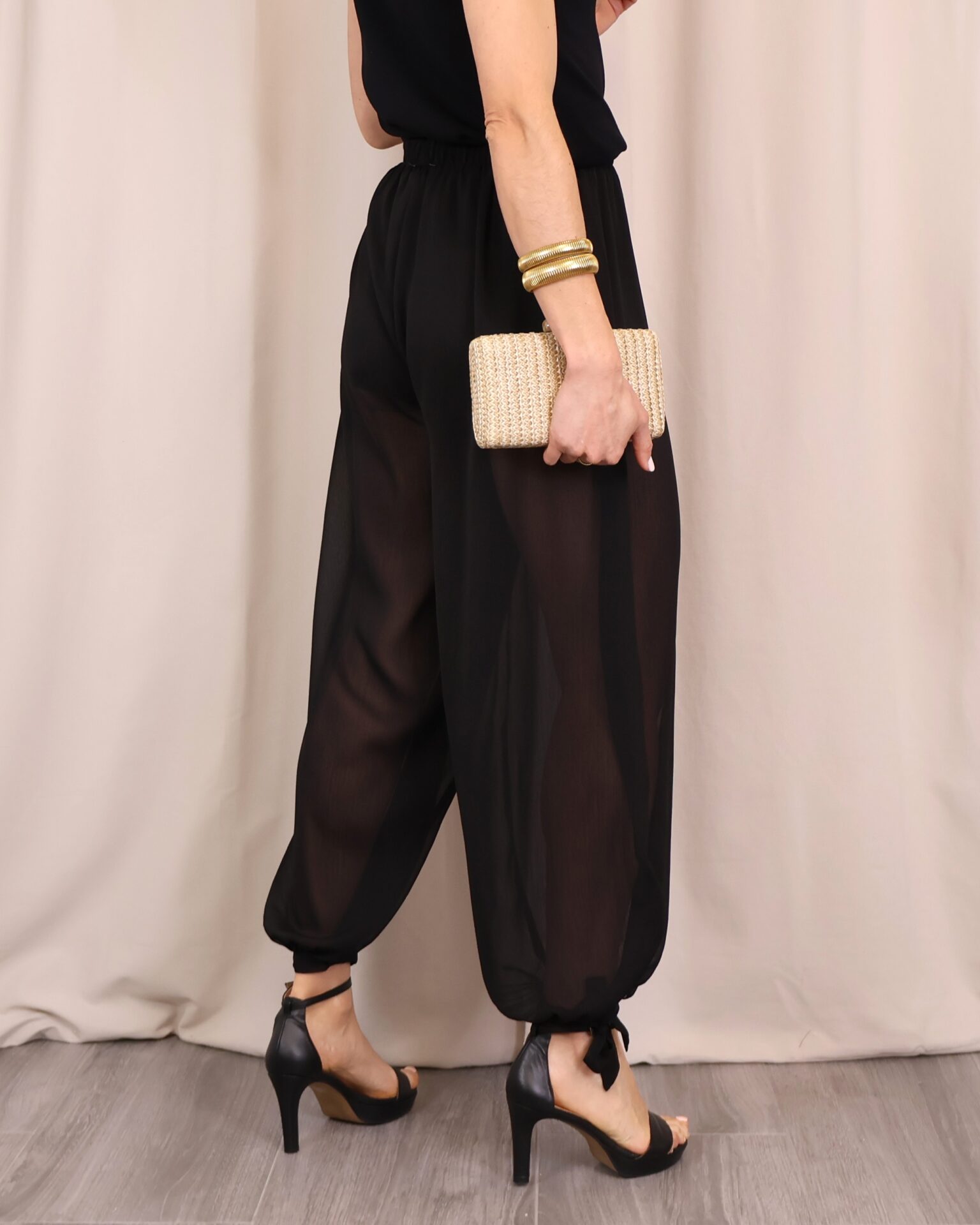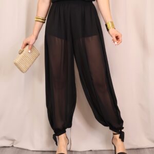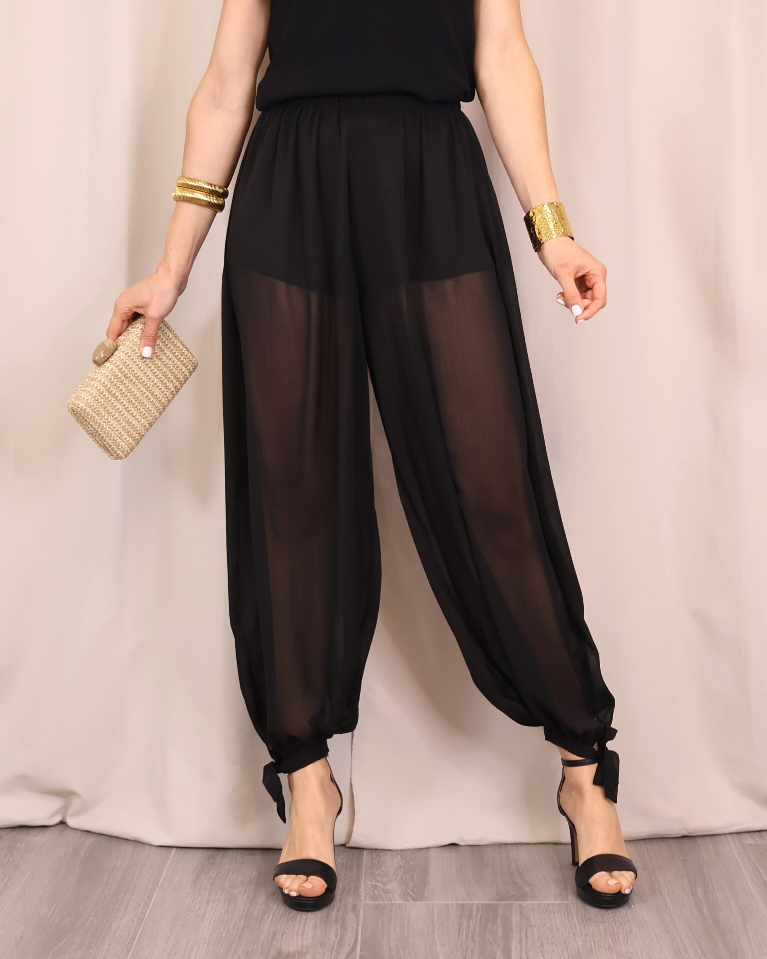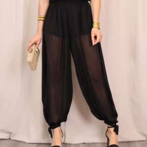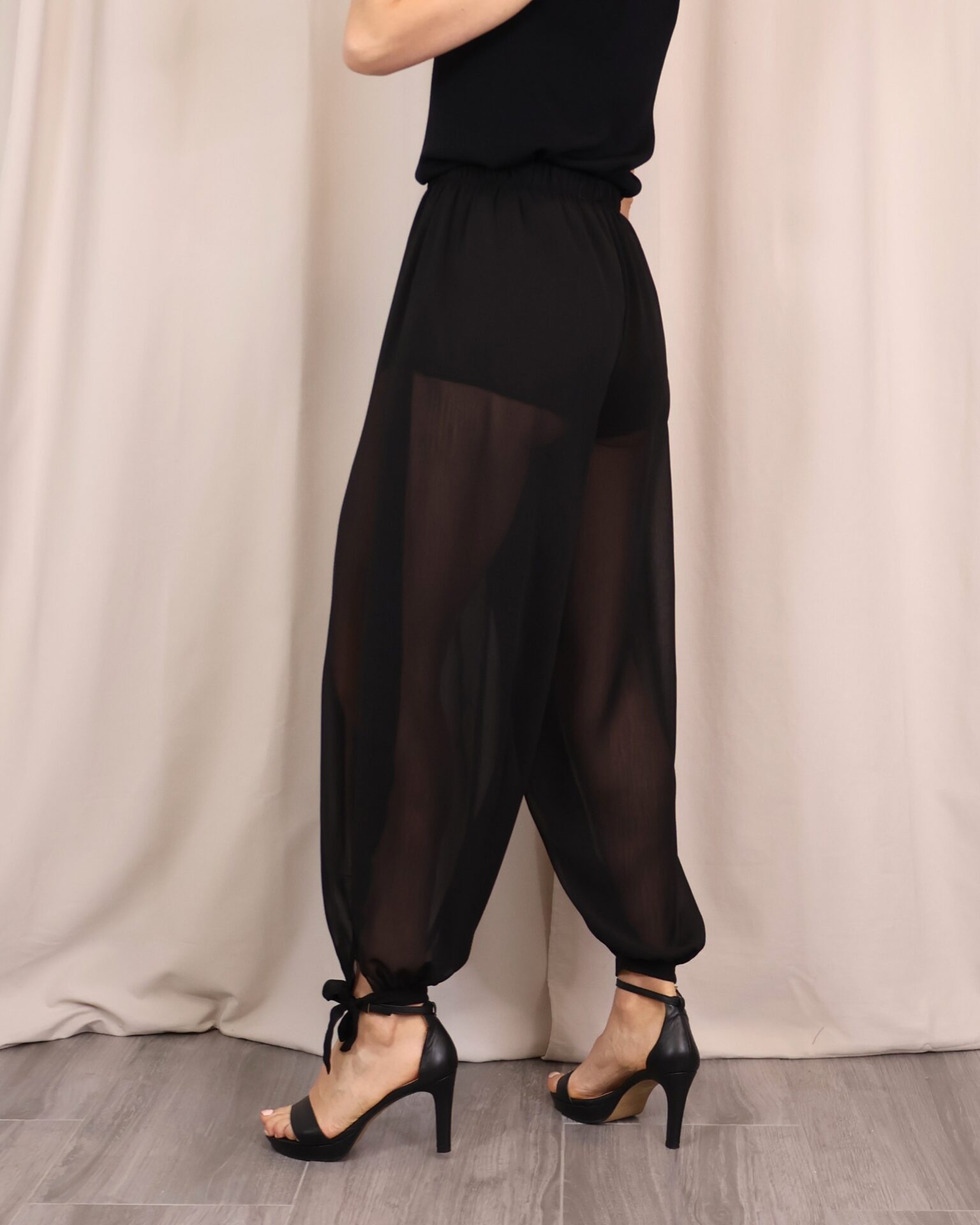 Pantalón bombacho en color negro tipo gasa, con un diseño ligero y fluido que aporta movimiento y elegancia. Es semitransparente e incorpora forro corto interior para mayor comodidad, además de cintura elástica y lazada en el tobillo que añade un toque original y ajustable. Una prenda versátil con estilo desenfadado y actual.