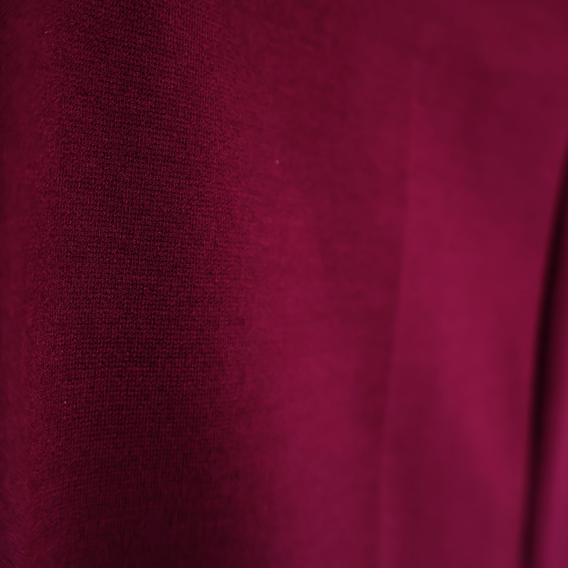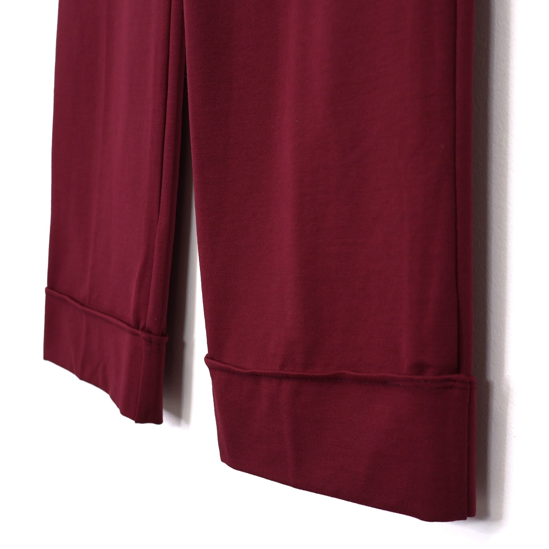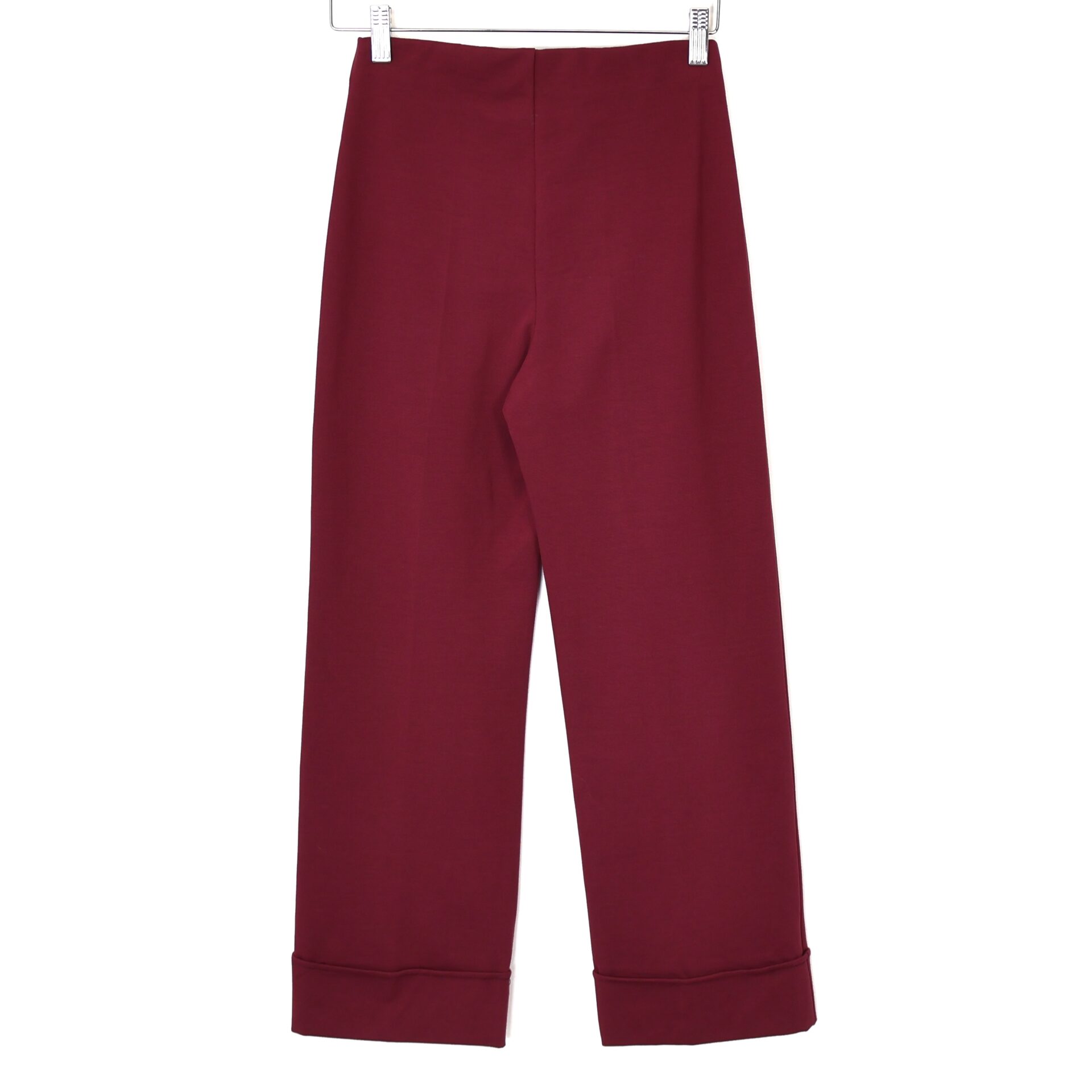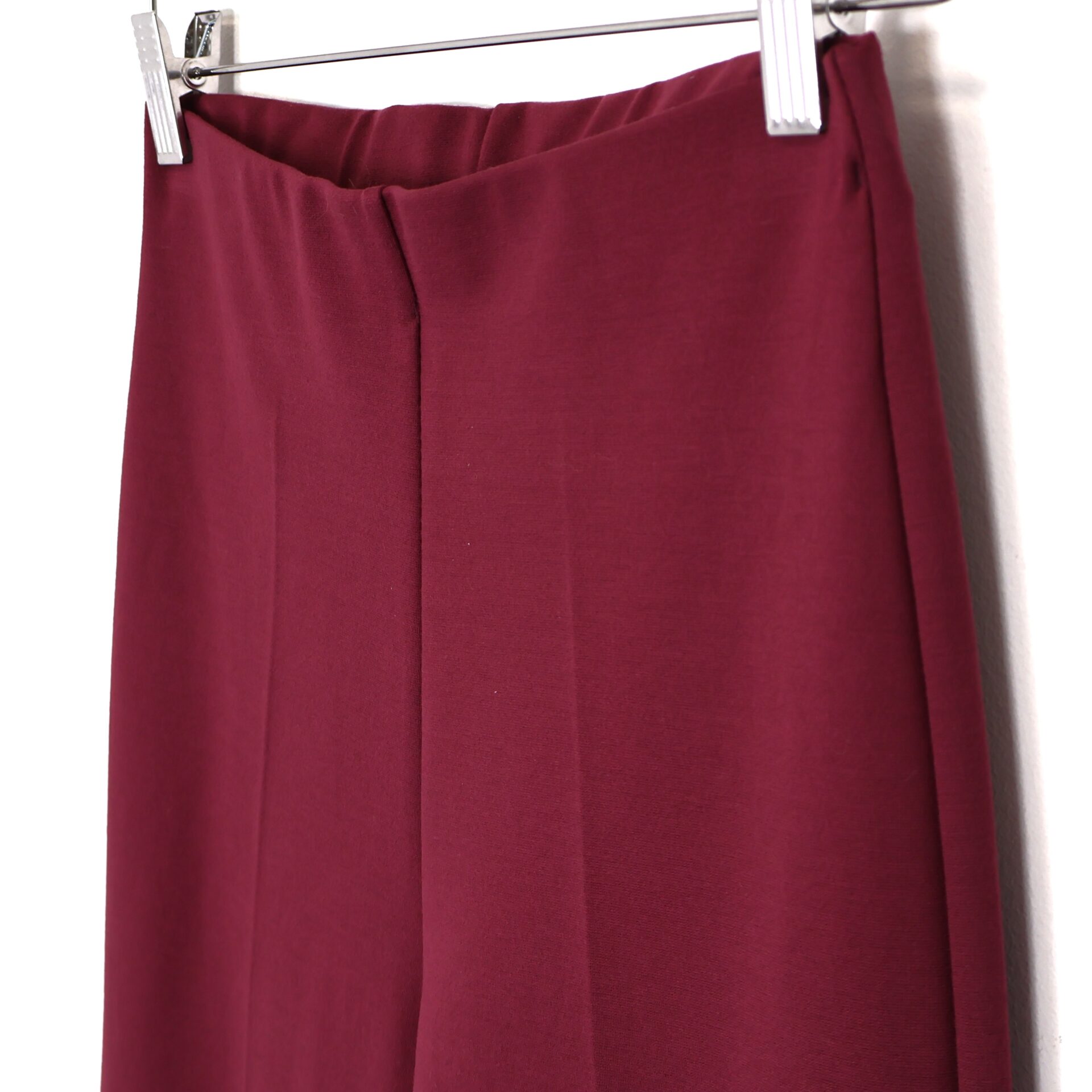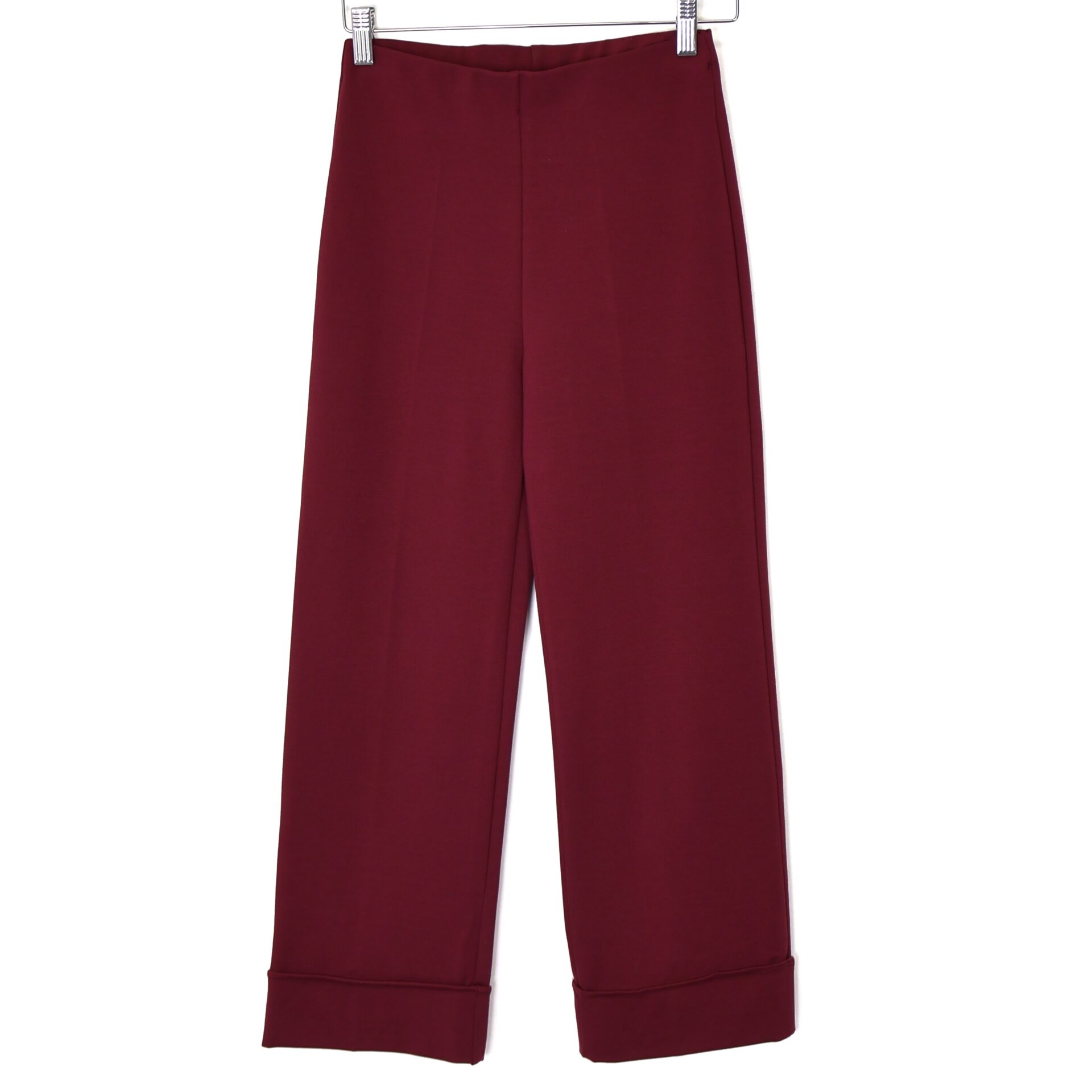 Pantalón burdeos de corte cropped y tiro alto. Detalle de doblez en el bajo. Goma en todo el contorno de la cintura.