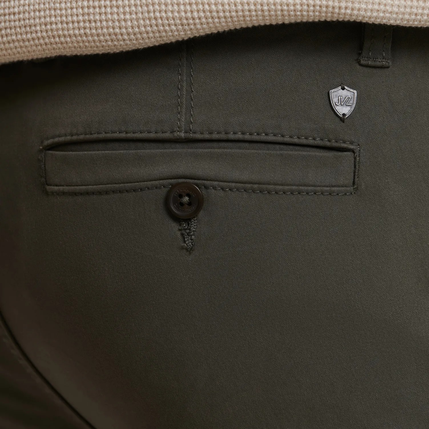 • Bolsillos traseros de vivo con cierre de botón.