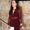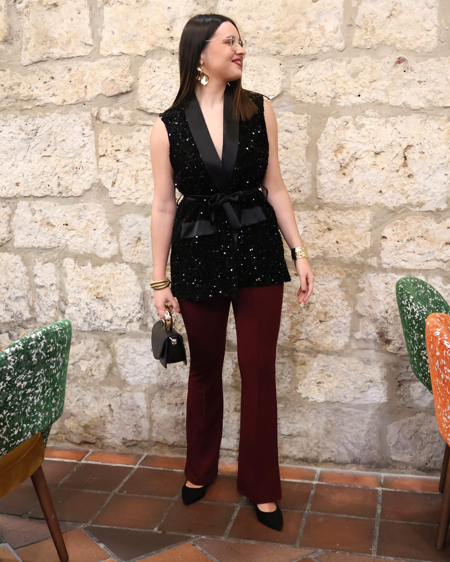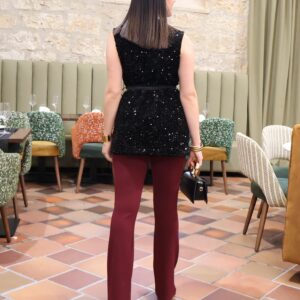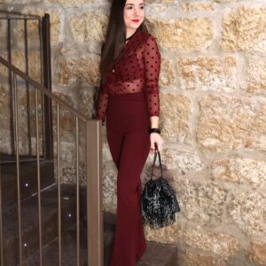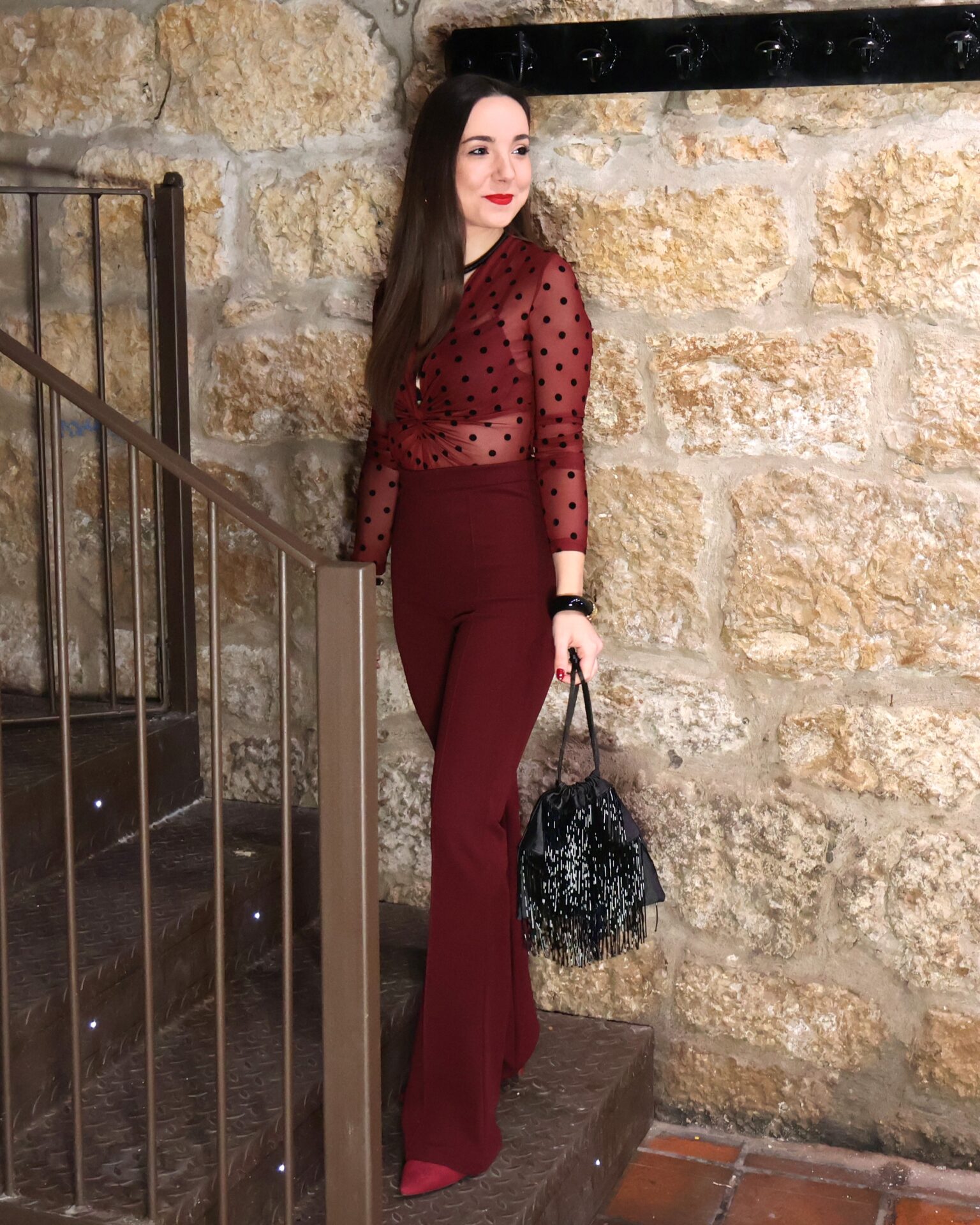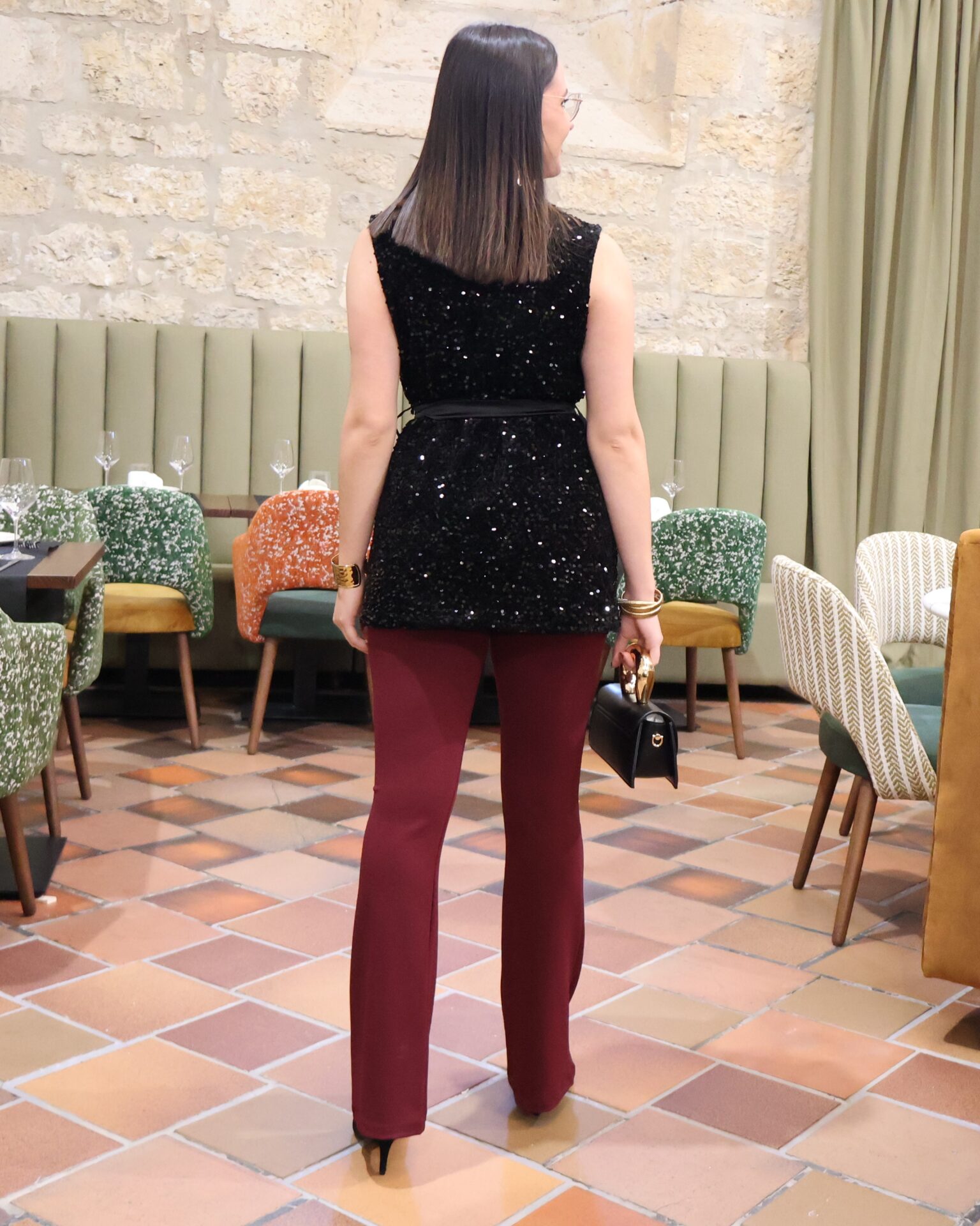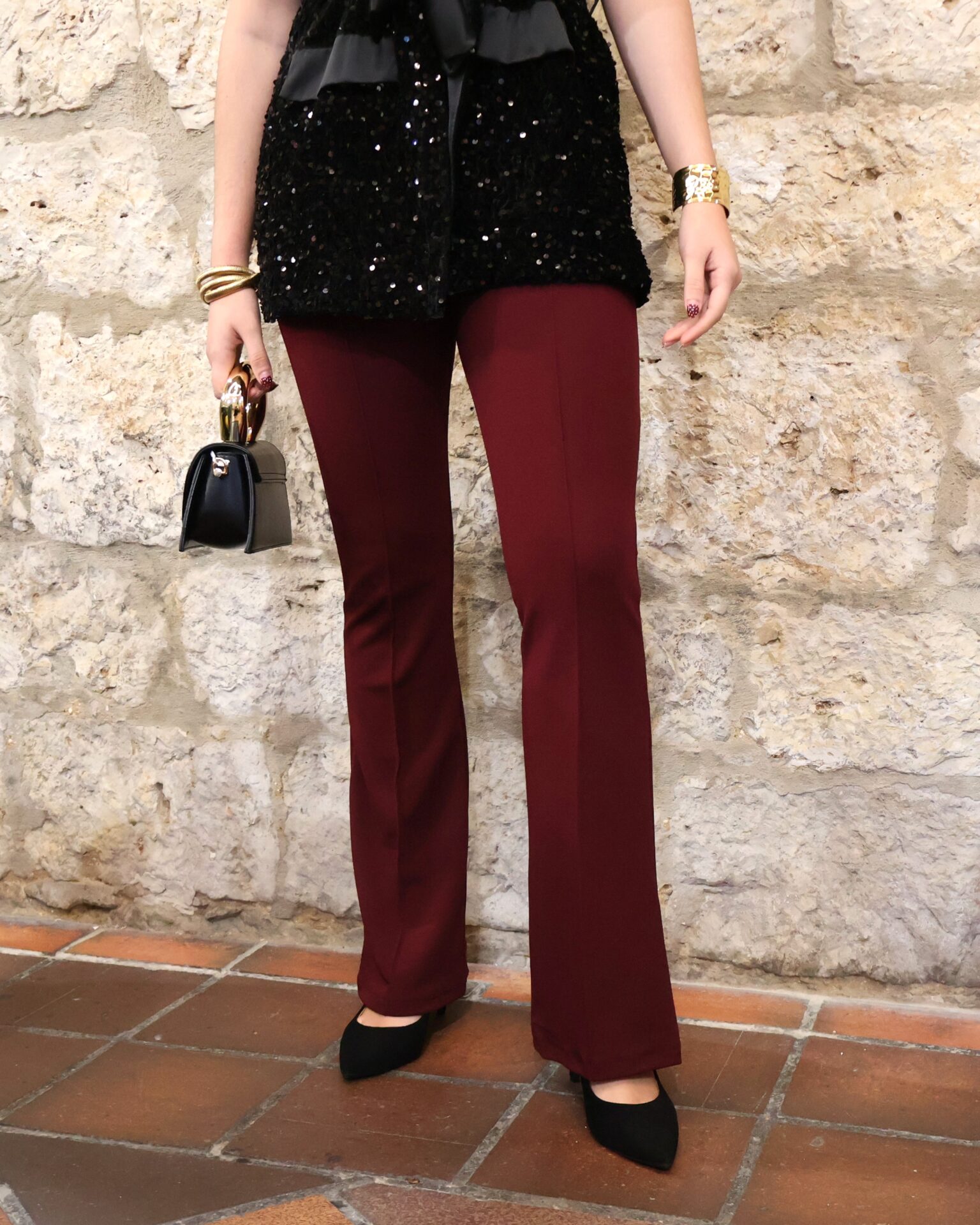 Pantalón elástico acampanado color burdeos. Detalle de bolsillos traseros decorativos. Tiro alto. Cierre lateral con cremallera invisible.