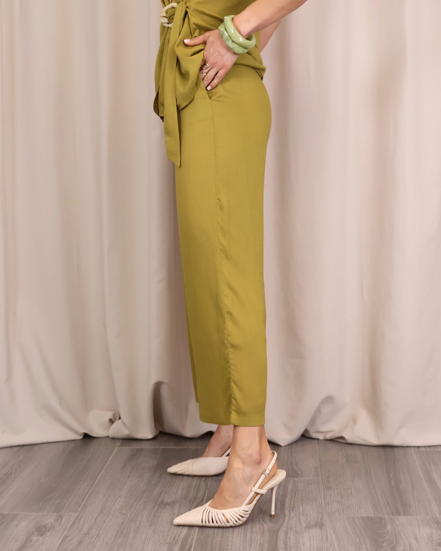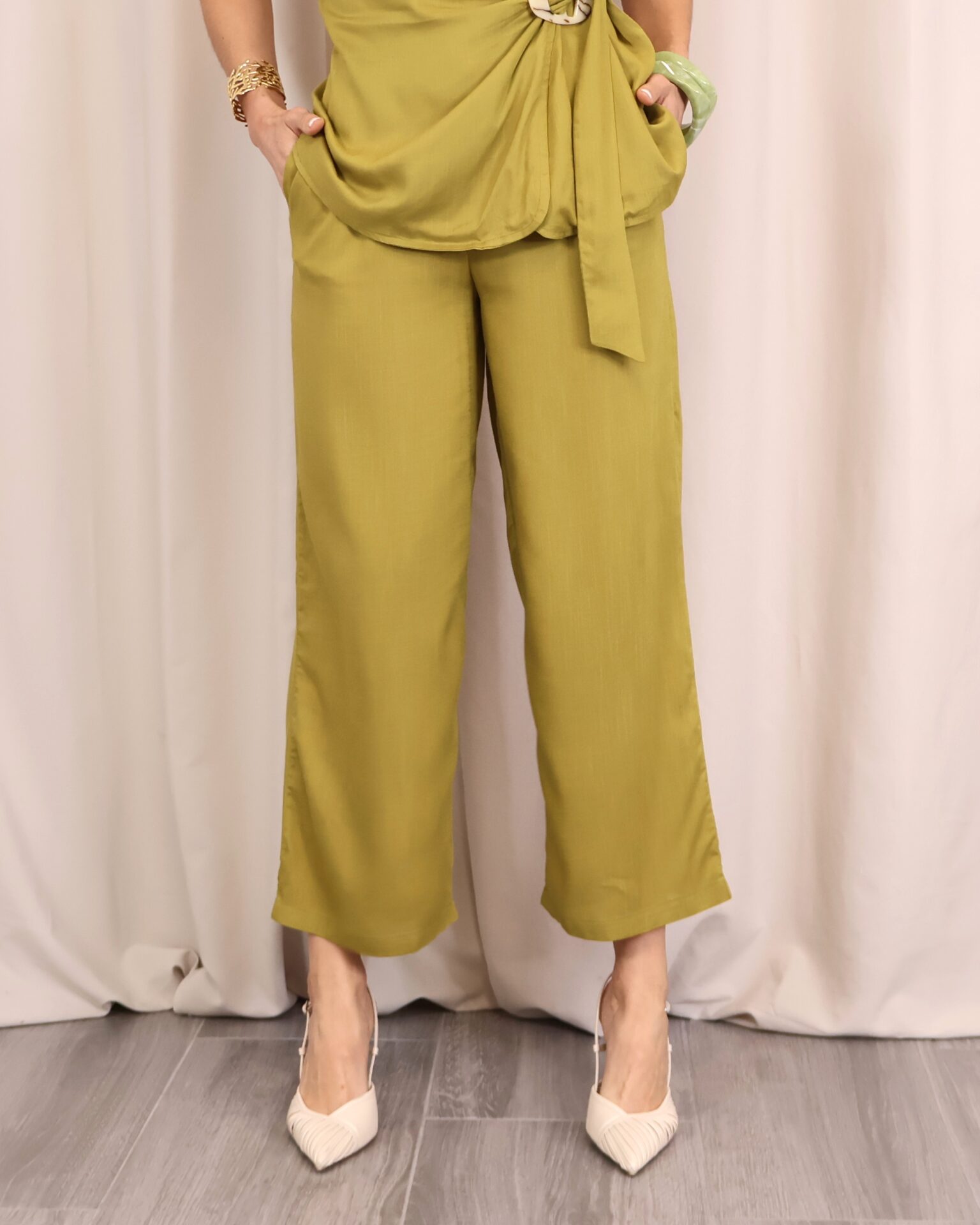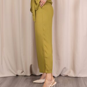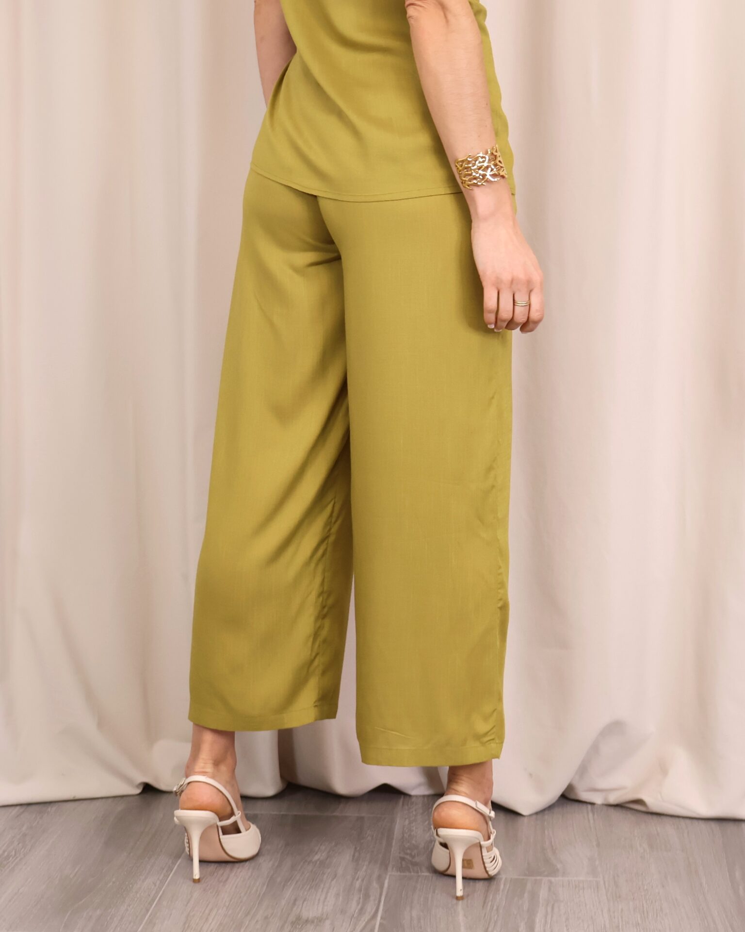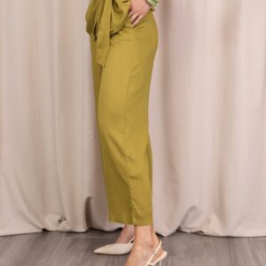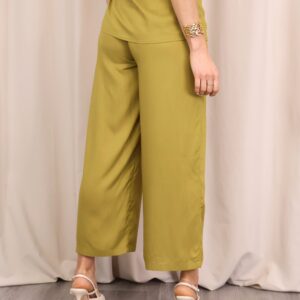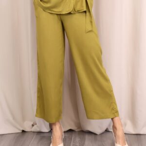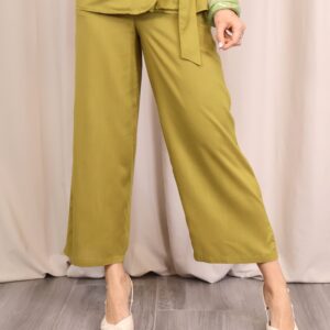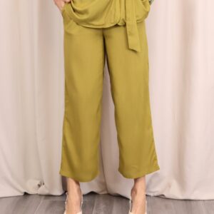 Pantalón de corte recto y amplio en verde lima, confeccionado en un tejido ligero y cómodo. Su diseño de tiro medio-alto estiliza la figura, mientras que la pernera ancha aporta libertad de movimiento. Incorpora cintura con goma en la parte trasera para un ajuste más cómodo y favorecedor, además de un cordón decorativo que añade un toque actual. Perfecto para combinar con la blusa a juego o con otras prendas para crear looks versátiles.