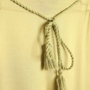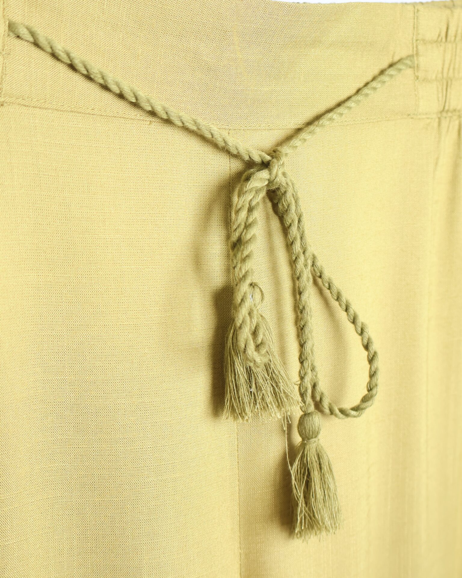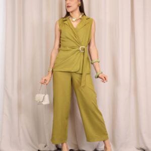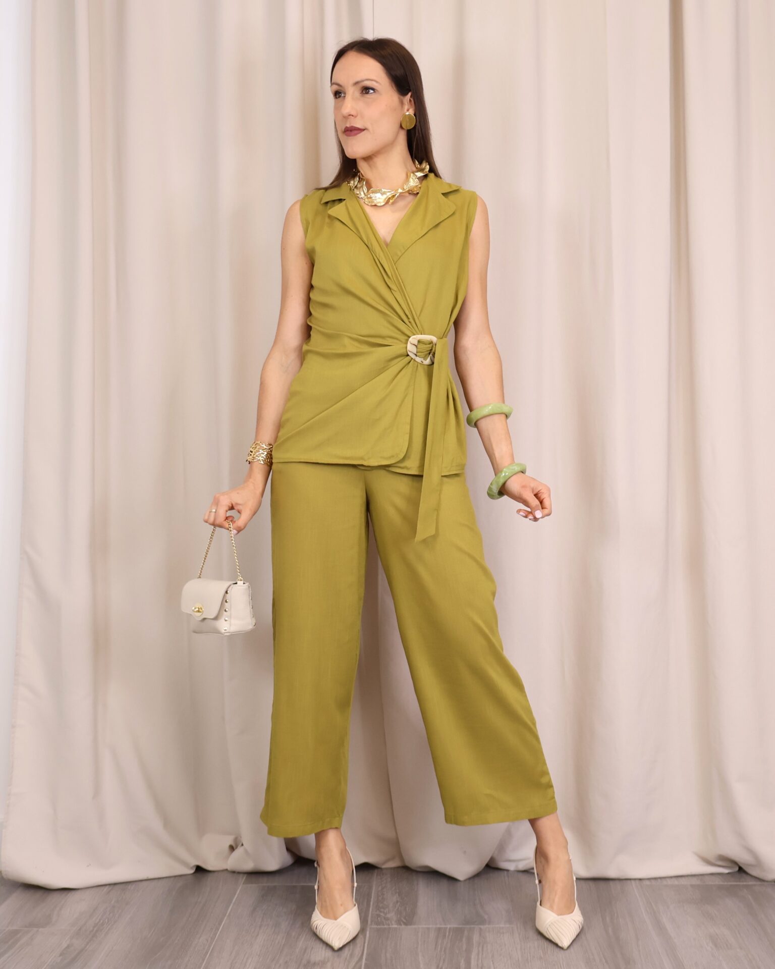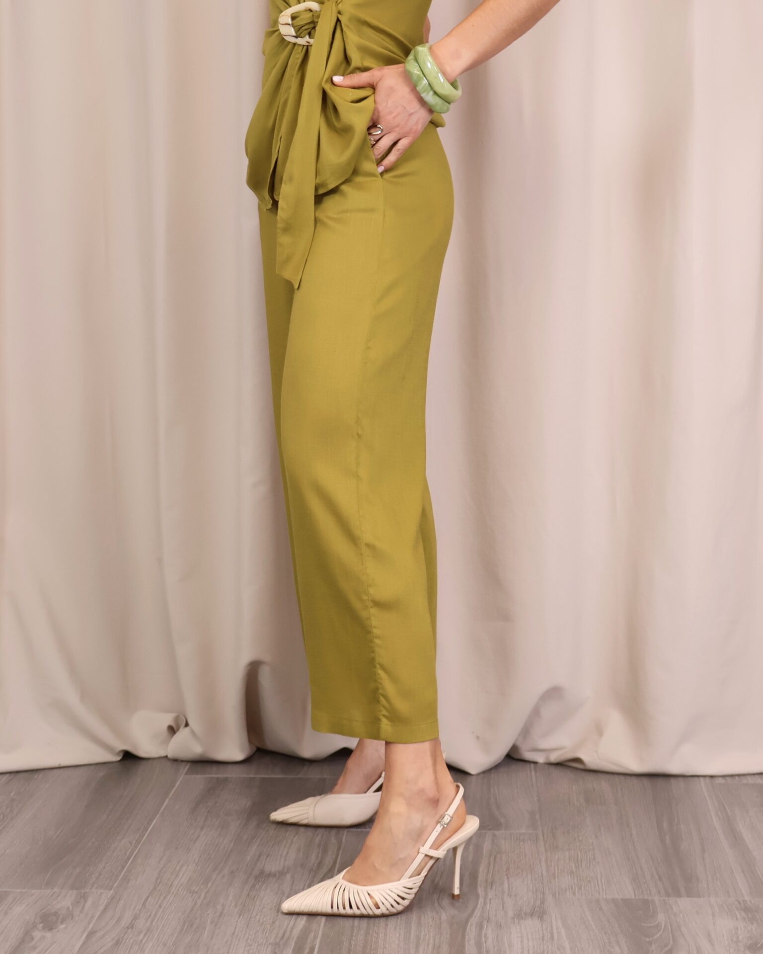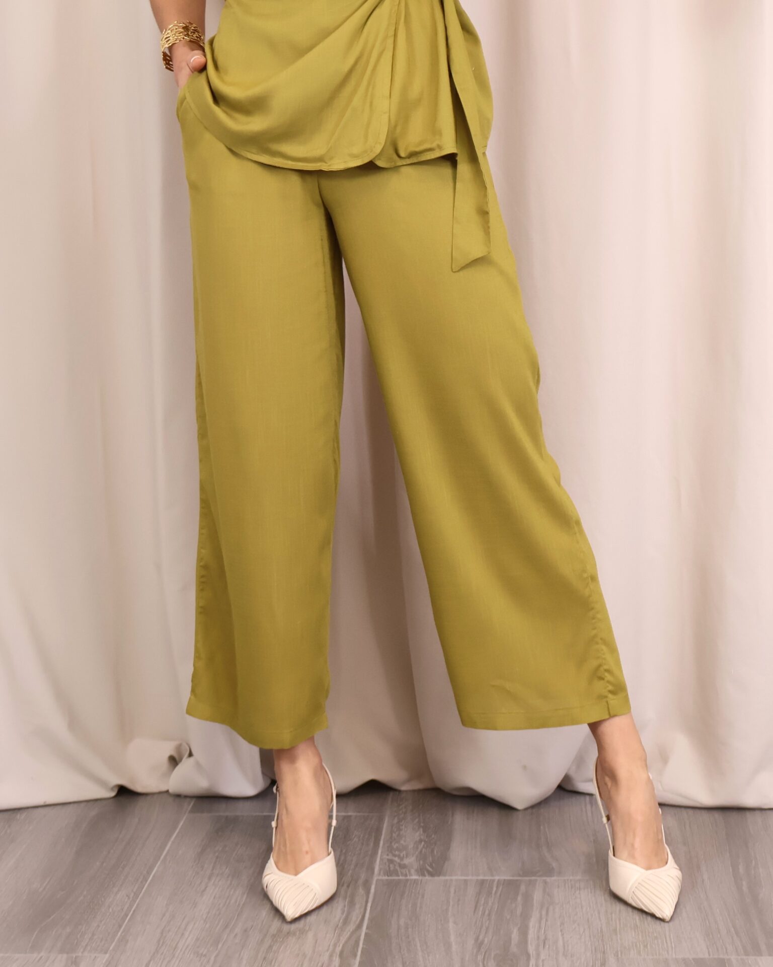 Pantalón de corte recto y amplio en verde lima, confeccionado en un tejido ligero y cómodo. Su diseño de tiro medio-alto estiliza la figura, mientras que la pernera ancha aporta libertad de movimiento. Incorpora cintura con goma en la parte trasera para un ajuste más cómodo y favorecedor, además de un cordón decorativo que añade un toque actual. Perfecto para combinar con la blusa a juego o con otras prendas para crear looks versátiles.