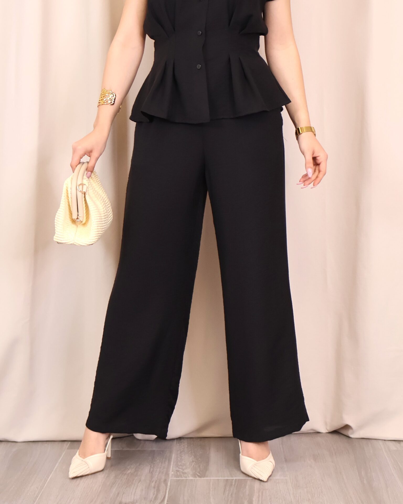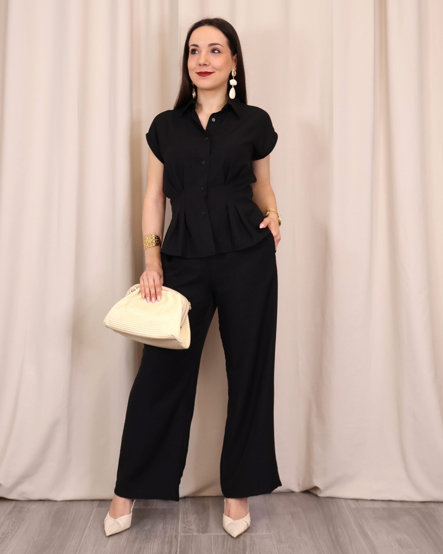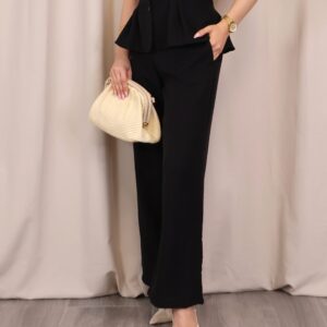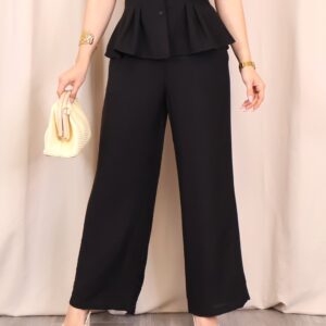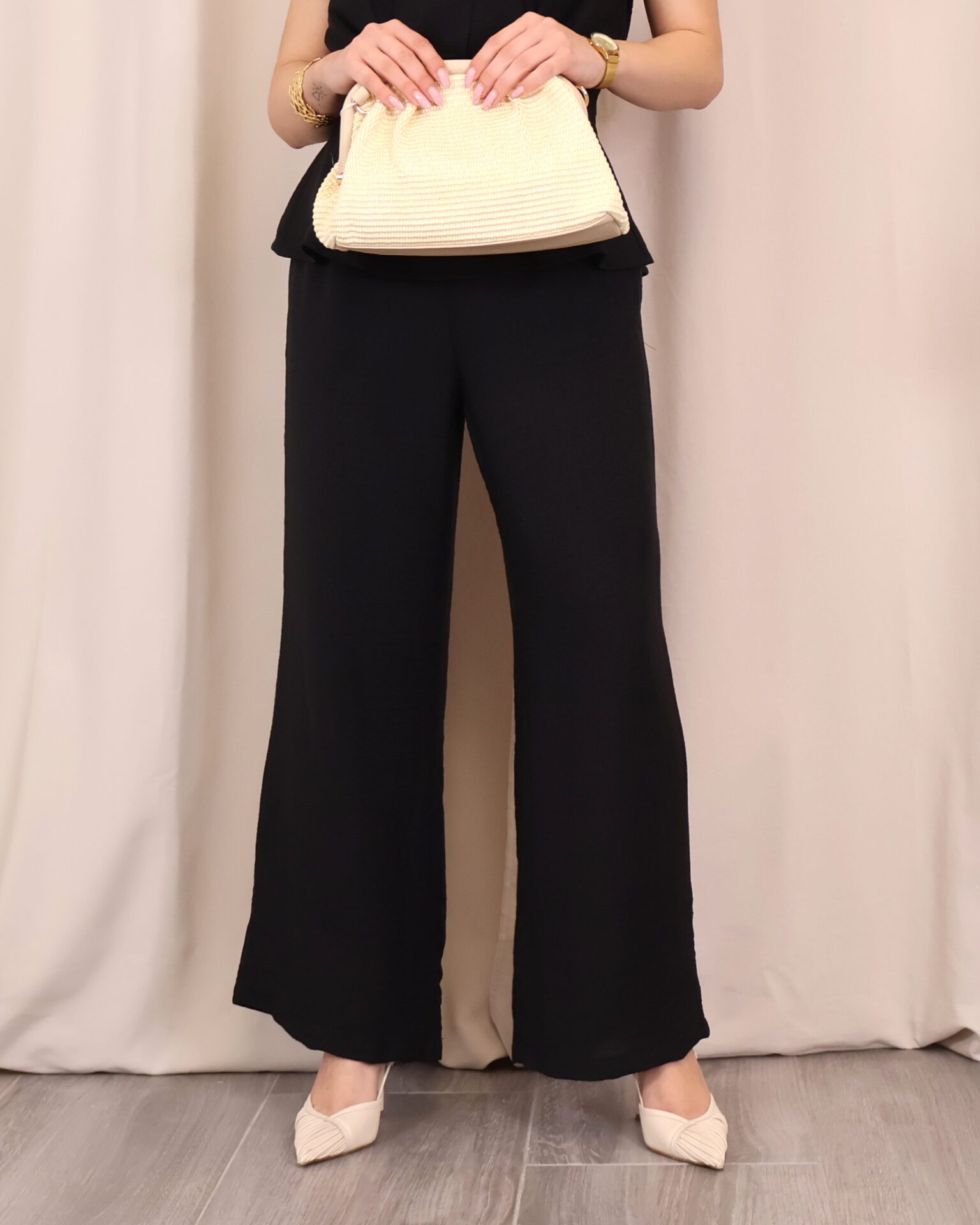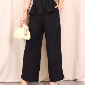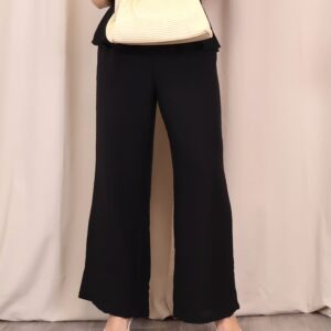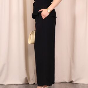 Pantalón de mujer en color negro, de tiro medio-alto con cintura elástica y ajuste mediante cordón, que garantiza confort durante todo el día. Incorpora goma en la parte trasera de la cintura para un mejor ajuste y mayor comodidad. Su diseño de pierna ancha estiliza la figura y aporta un aire sofisticado y moderno. Además, cuenta con prácticos bolsillos laterales que lo hacen aún más funcional. Ideal para crear conjuntos coordinados o combinar con prendas básicas.