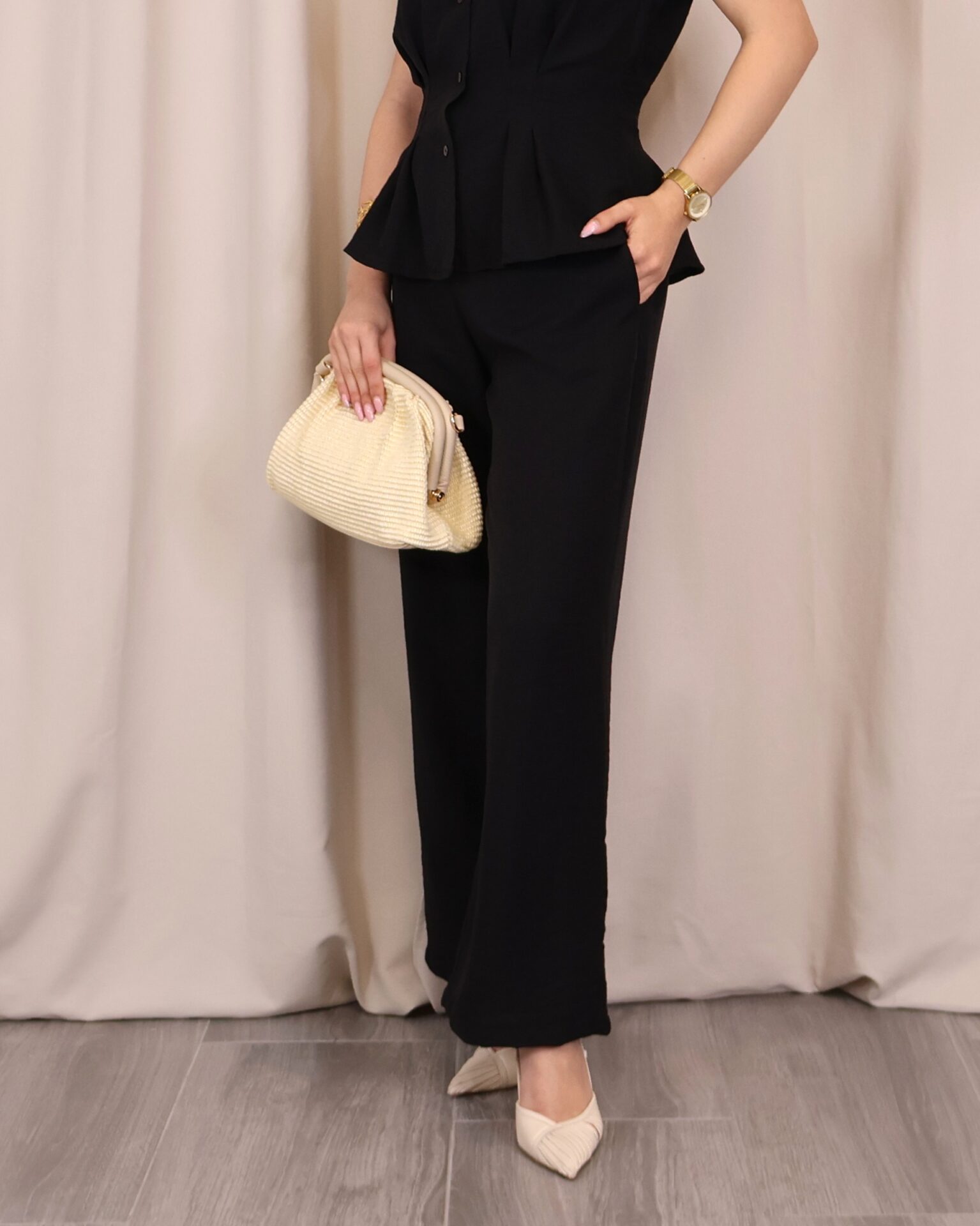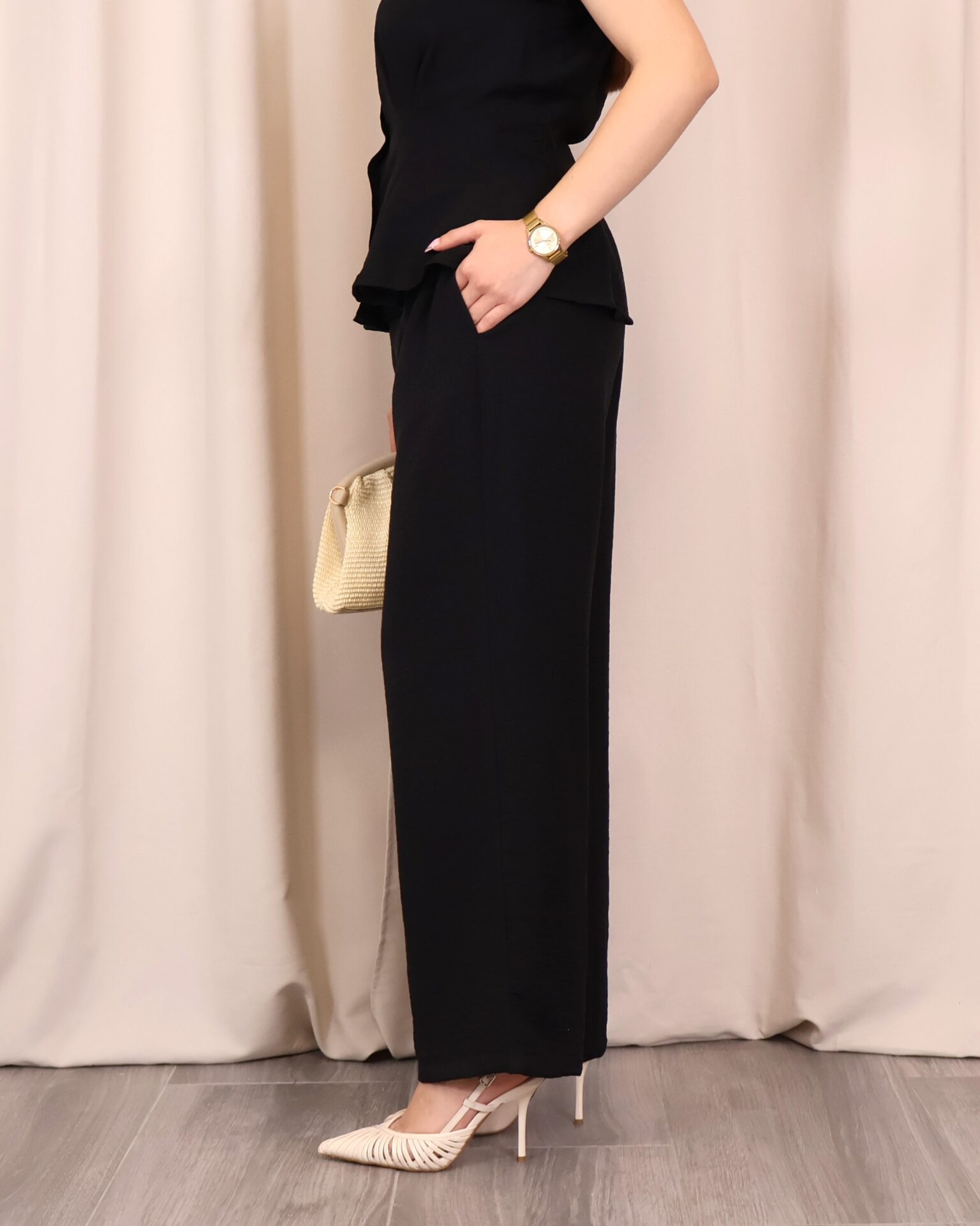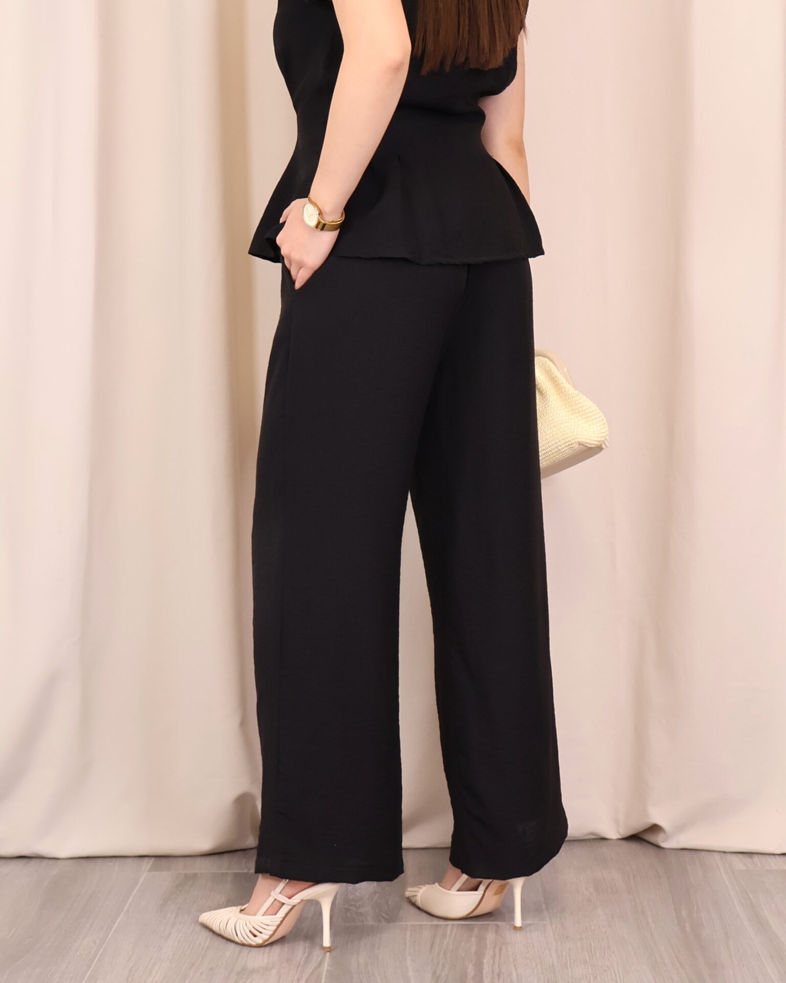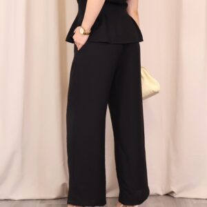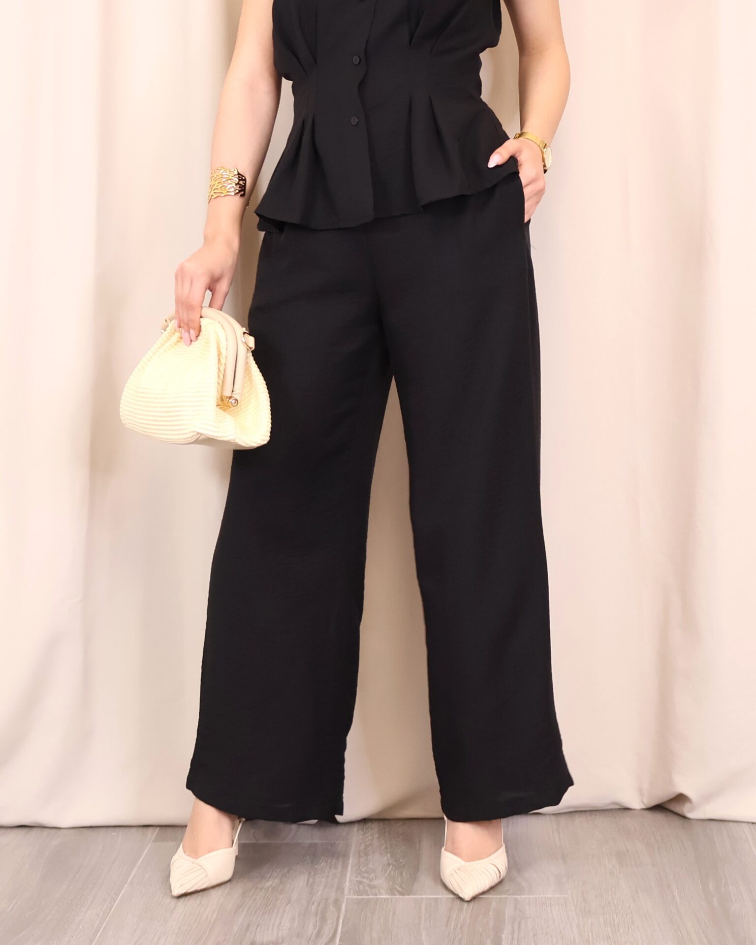 Pantalón de mujer en color negro, de tiro medio-alto con cintura elástica y ajuste mediante cordón, que garantiza confort durante todo el día. Incorpora goma en la parte trasera de la cintura para un mejor ajuste y mayor comodidad. Su diseño de pierna ancha estiliza la figura y aporta un aire sofisticado y moderno. Además, cuenta con prácticos bolsillos laterales que lo hacen aún más funcional. Ideal para crear conjuntos coordinados o combinar con prendas básicas.