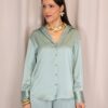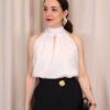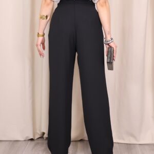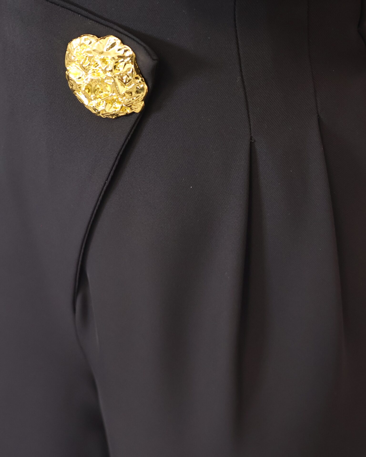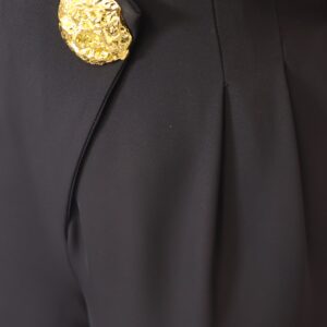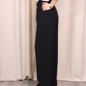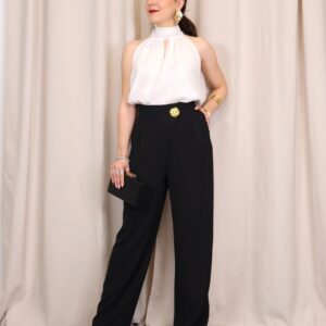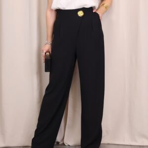 Pantalón de corte recto que destaca por su caída impecable y su capacidad para estilizar la silueta gracias a su favorecedor diseño de tiro alto. Su línea recta y fluida garantiza máxima comodidad sin renunciar a la elegancia, convirtiéndolo en una prenda versátil para cualquier ocasión. Incorpora un exclusivo botón joya dorado en la parte central, un detalle sofisticado que eleva el diseño y permite prescindir de cinturón, aportando un acabado limpio y refinado.