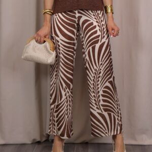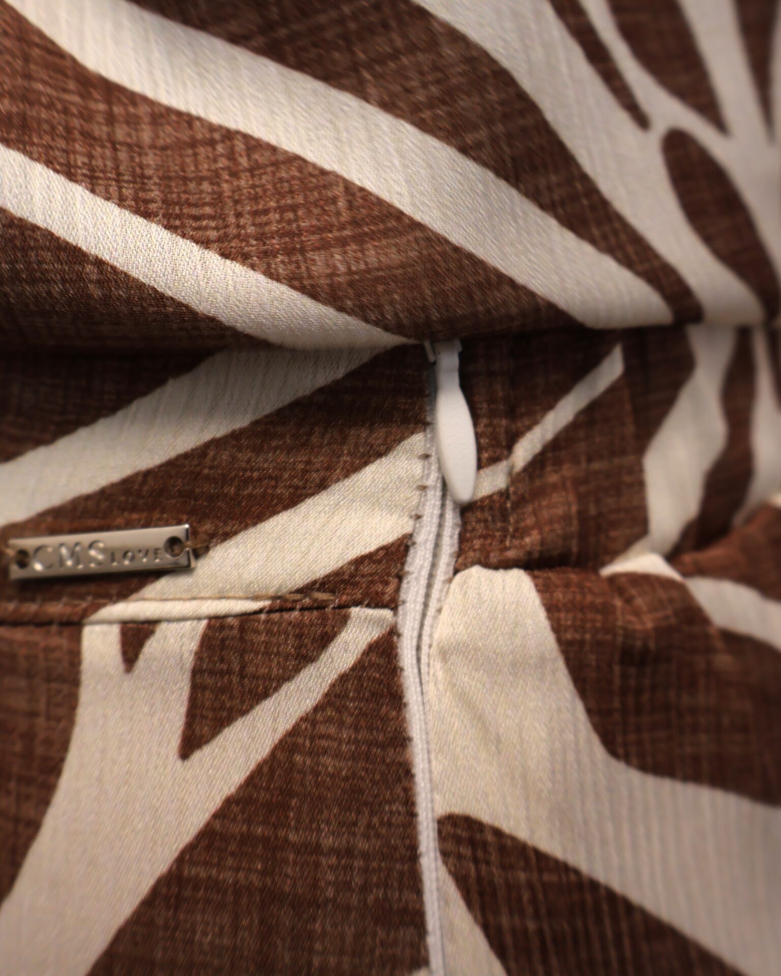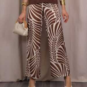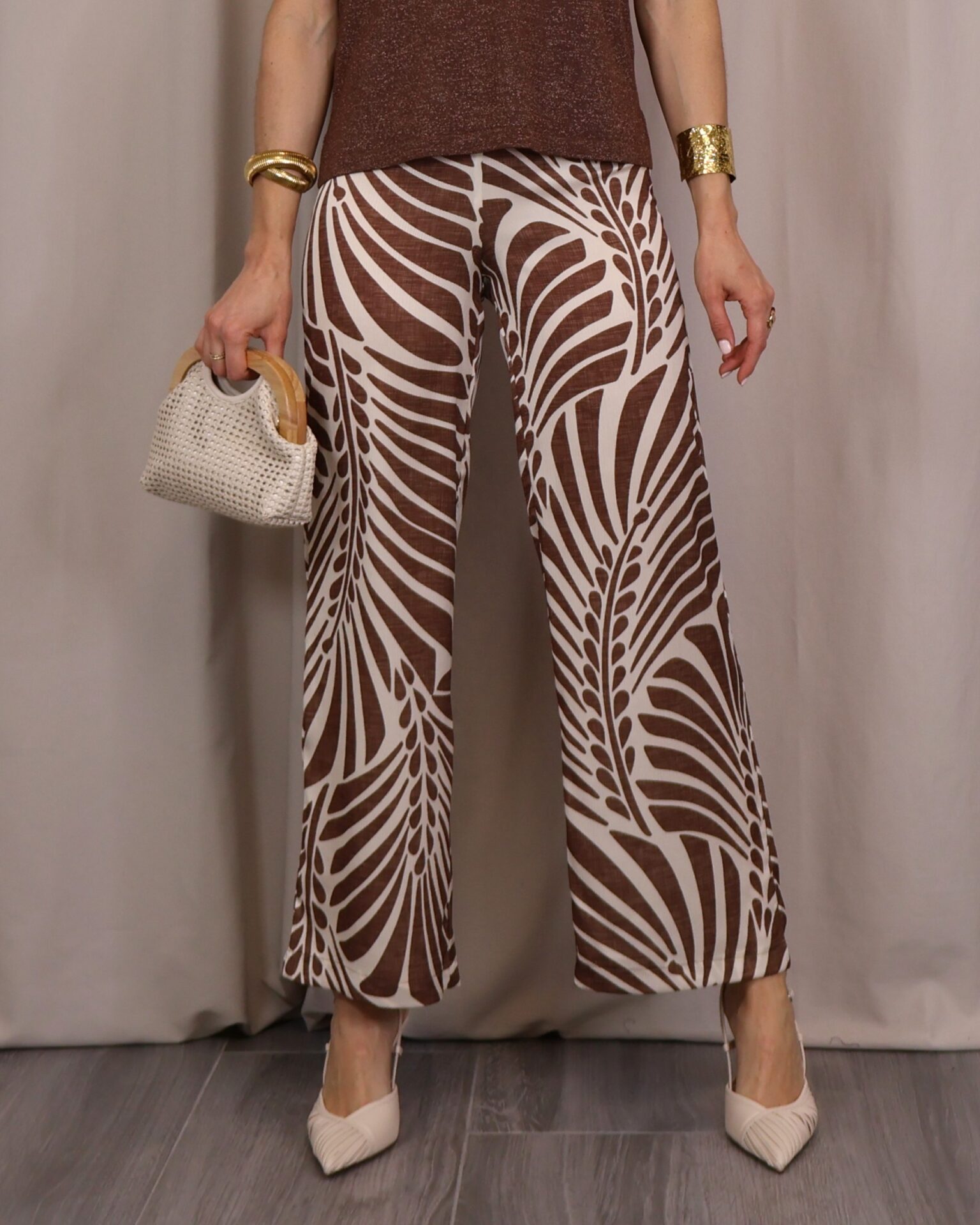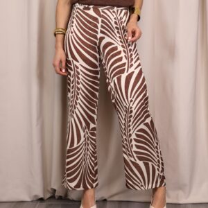 Pantalón de tiro medio con pernera recta y amplia, diseñado con un llamativo estampado de hojas en tonos marrón y blanco. Su tejido ligero y su caída elegante lo convierten en una prenda cómoda y estilosa, perfecta para cualquier ocasión. Cuenta con goma en la parte trasera de la cintura, lo que aporta mayor ajuste y comodidad, y cierre mediante cremallera lateral invisible para un acabado limpio y sofisticado.