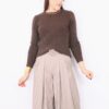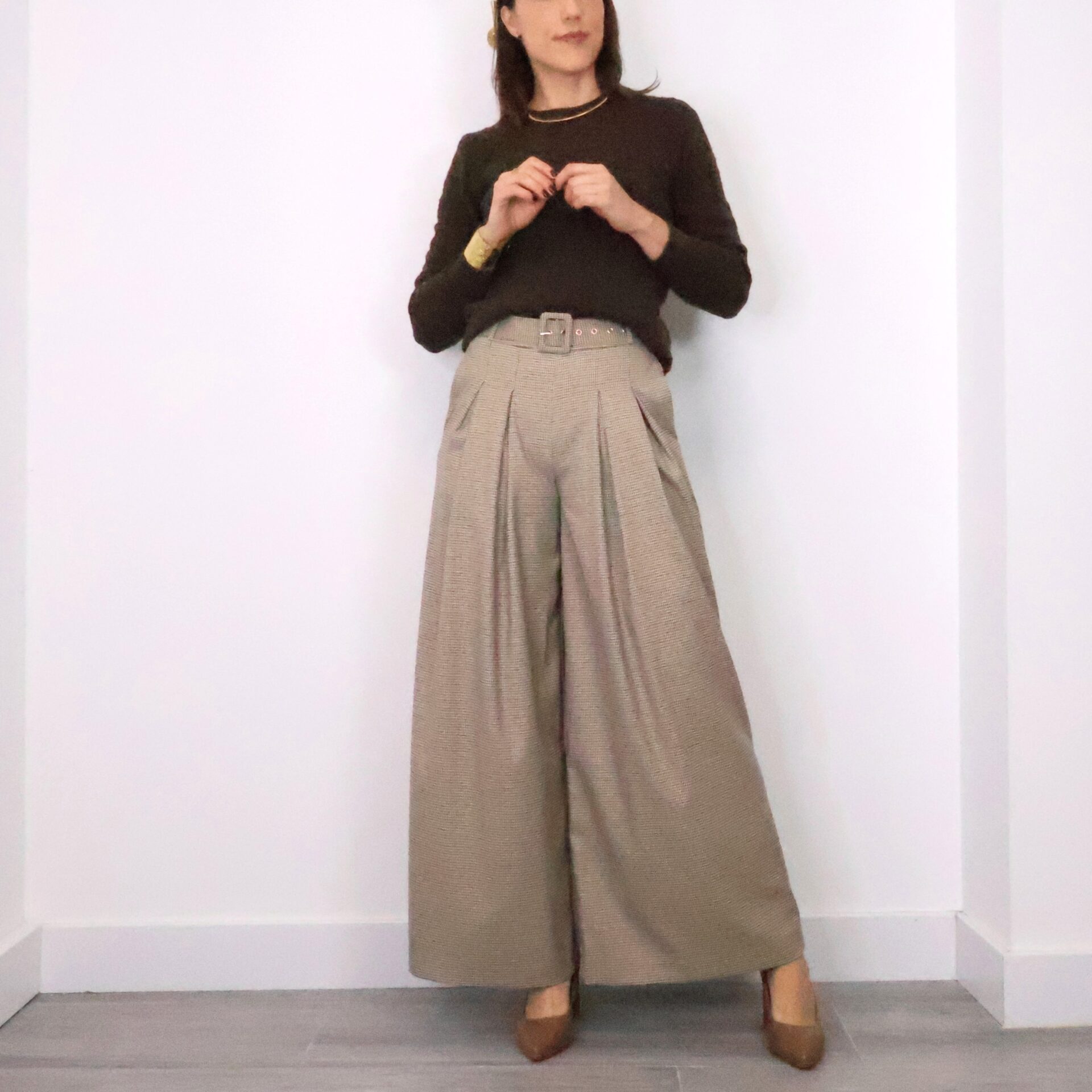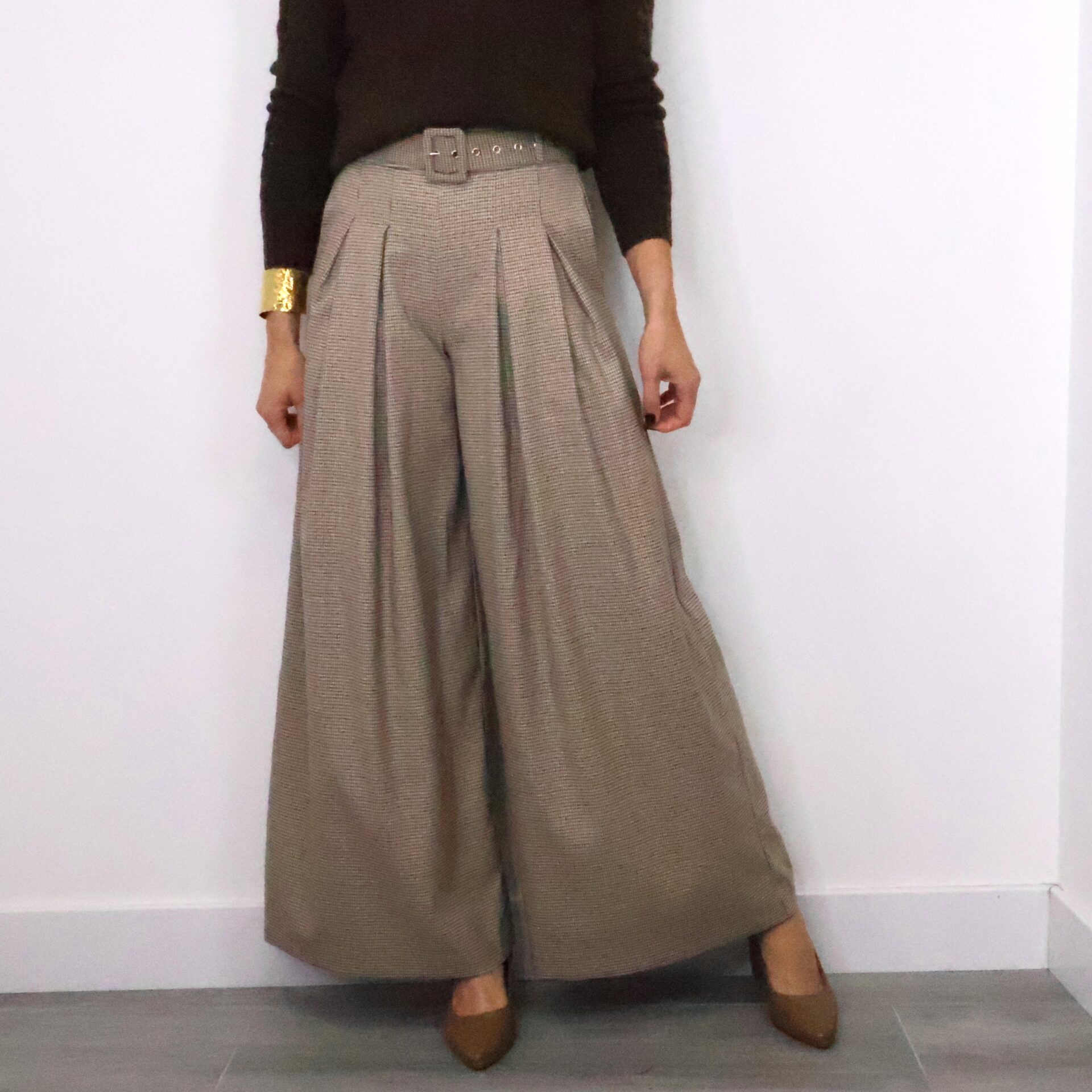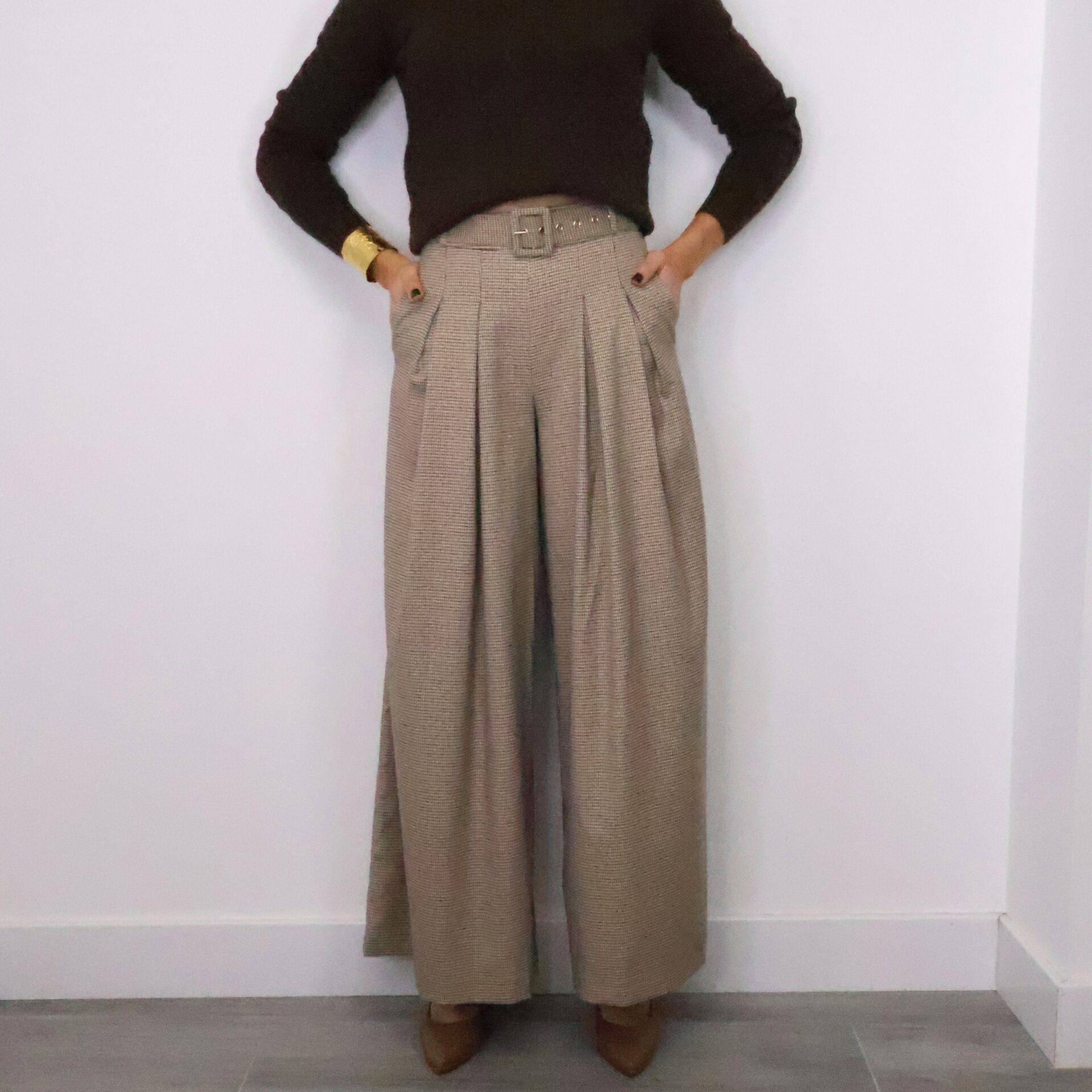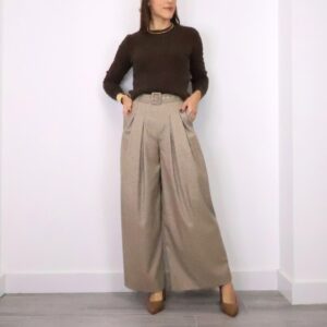 Pantalón tipo traje de corte palazzo y tiro alto con estampado de cuadros “pata de gallo” en tonos marrones y tostados. Cintura elástica gracias a la goma en la parte trasera y ajustable con cinturón con el mismo estampado, bolsillos laterales.