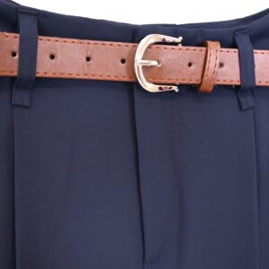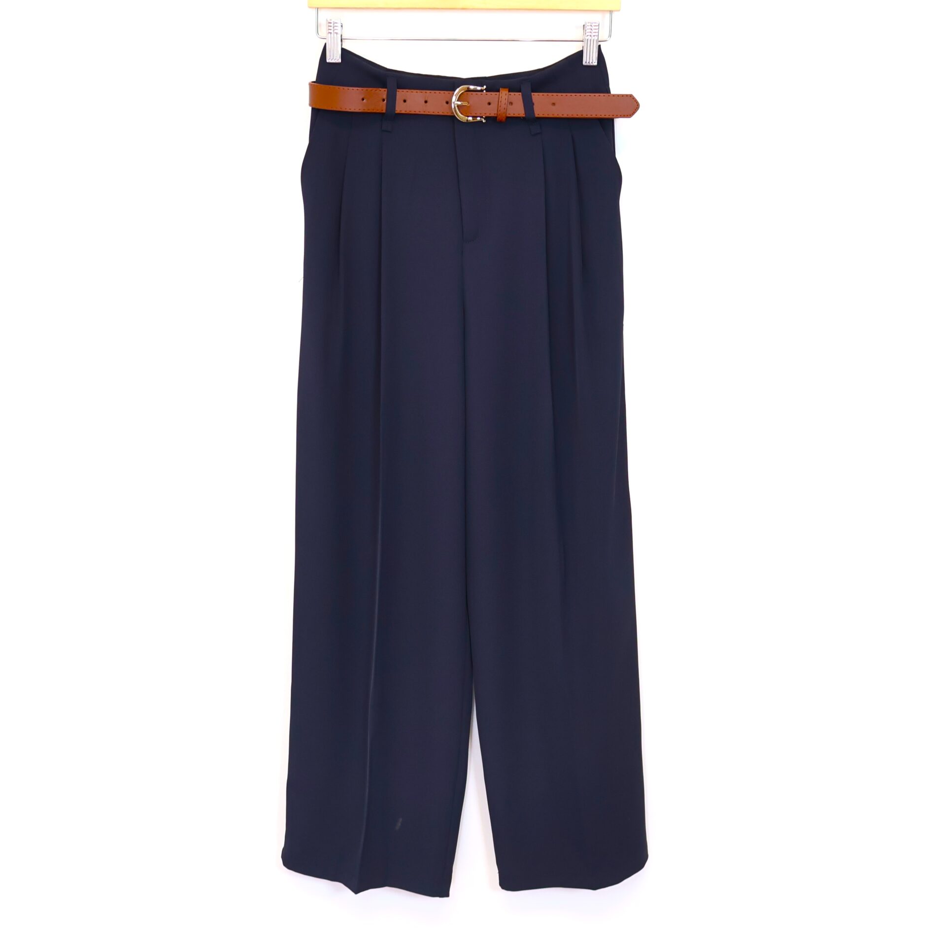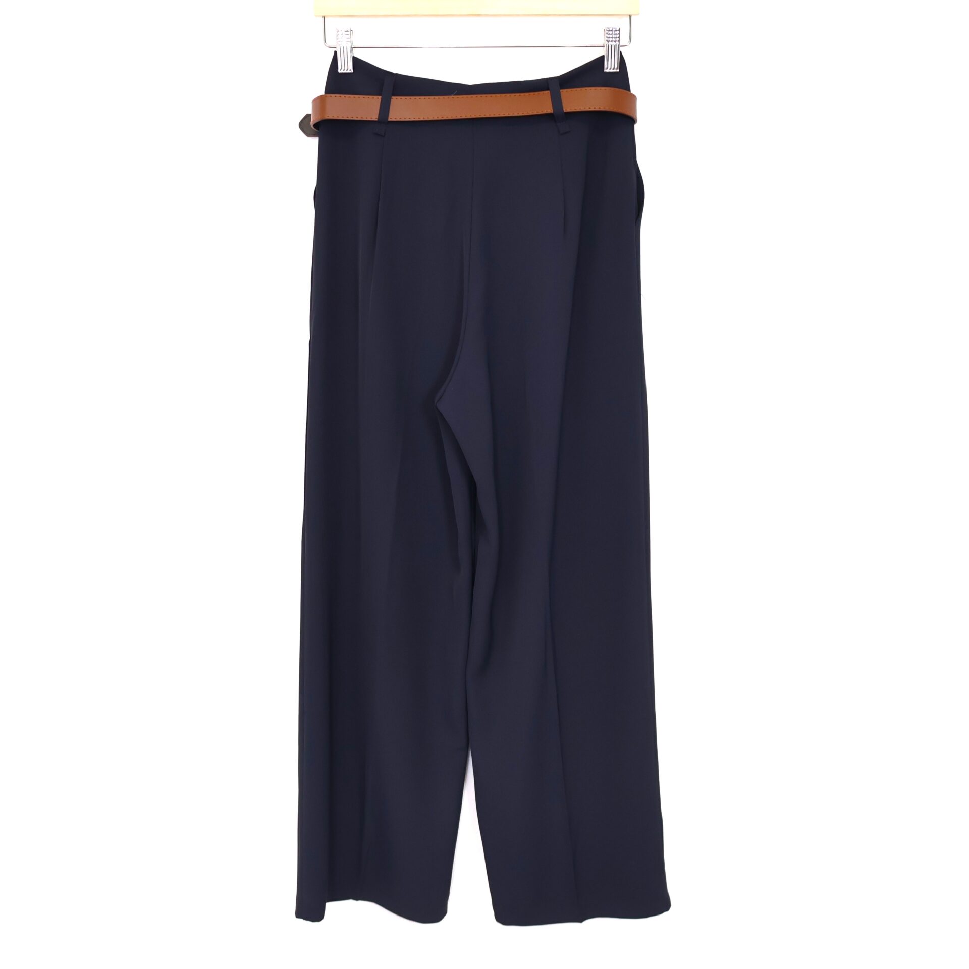 Pantalón tipo traje color azul marino de corte recto y tiro alto. Cierre con cremallera invisible metálico. 2 Bolsillos laterales. Cinturón color camel incluido.