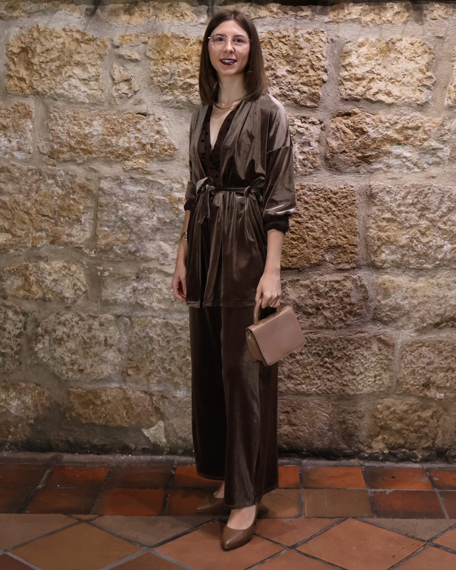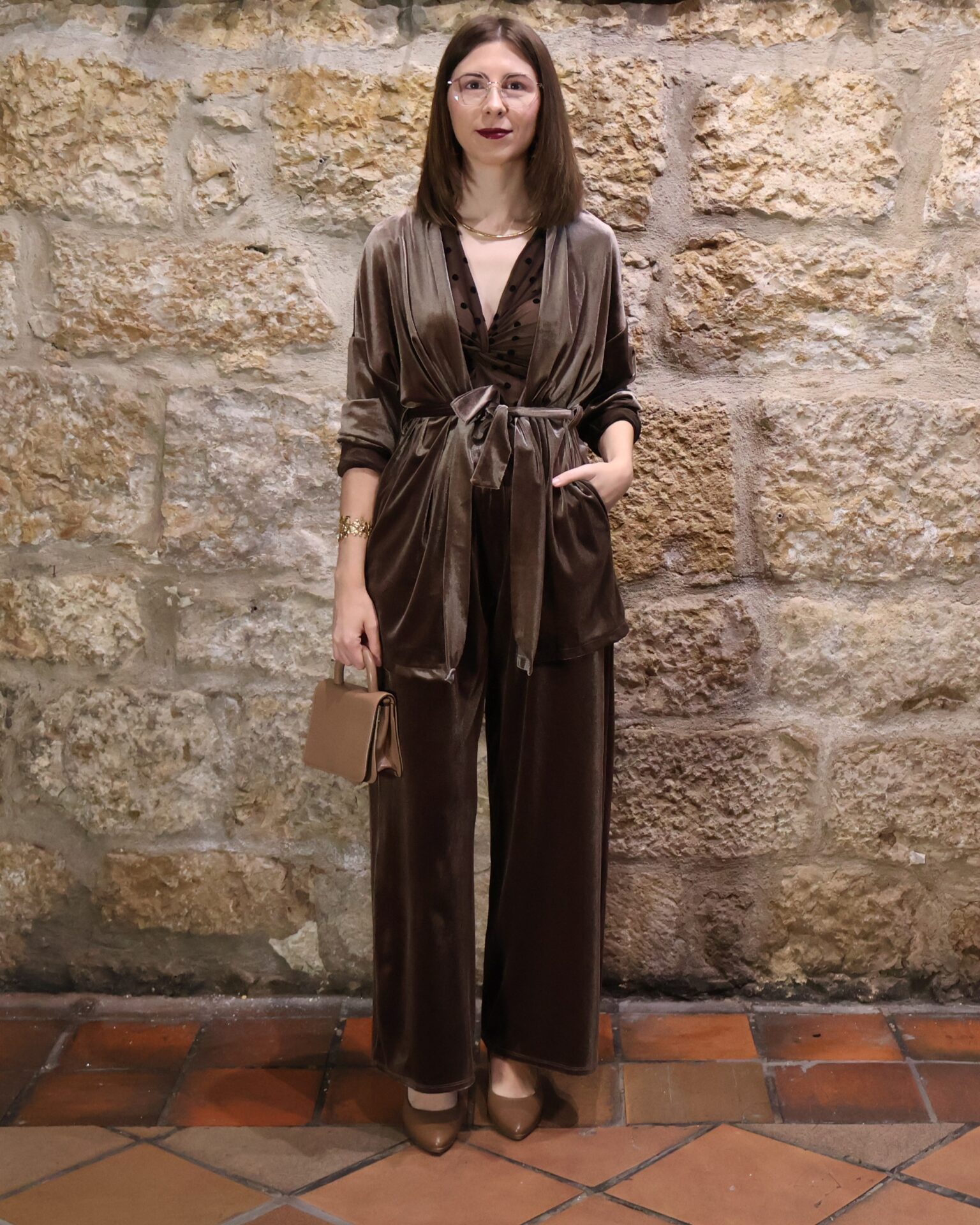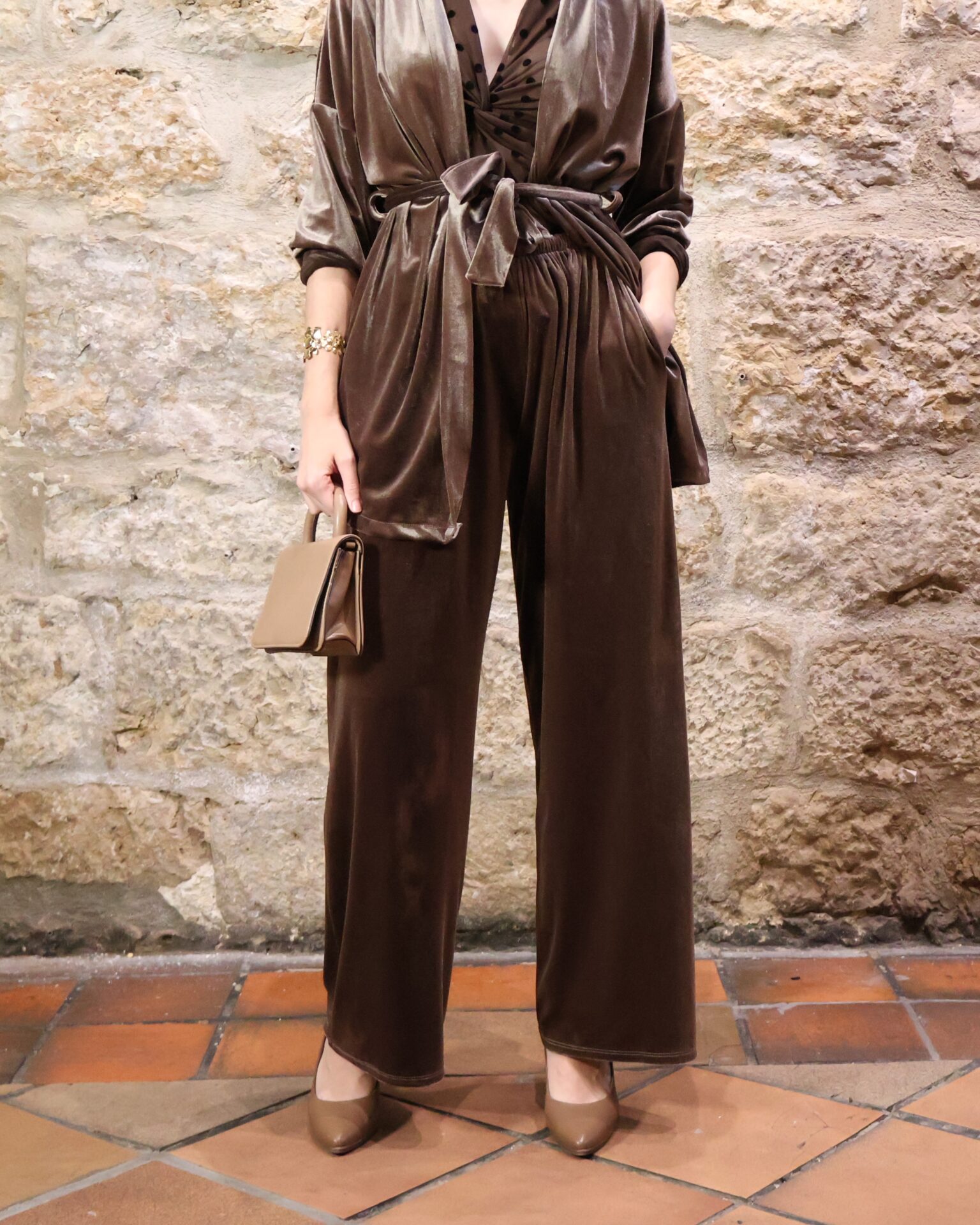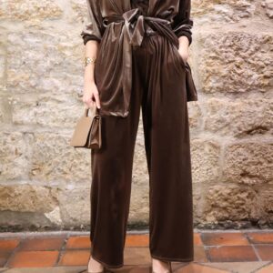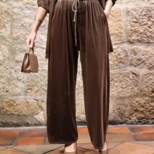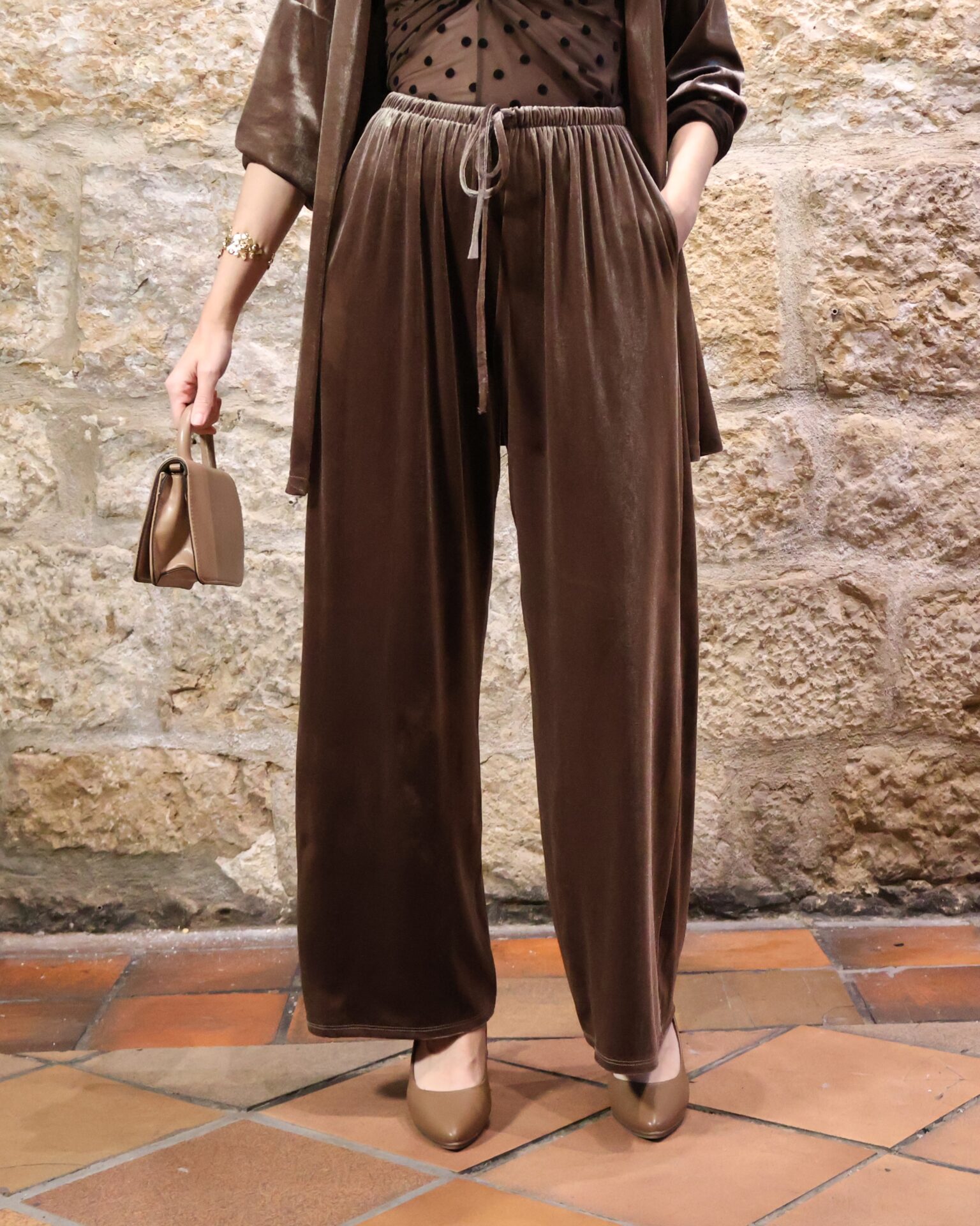 Pantalón de corte recto y fluido confeccionado en terciopelo de color taupe con cintura elástica gracias a la goma en todo el contorno y cordón ajustable del mismo tejido, lo que permite un ajuste perfecto. Con bolsillos laterales.