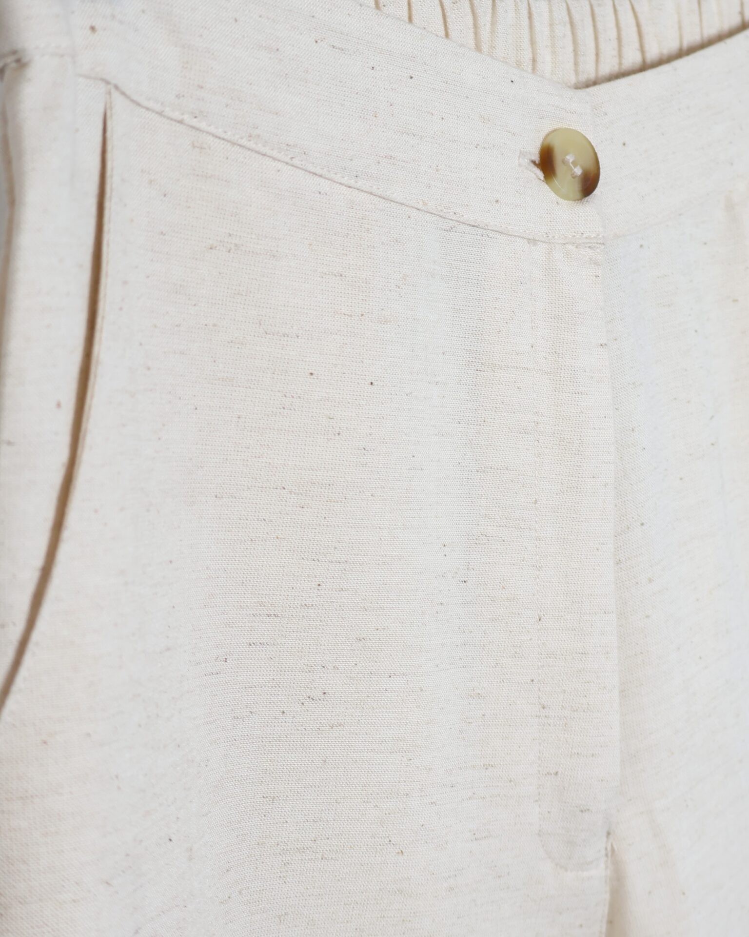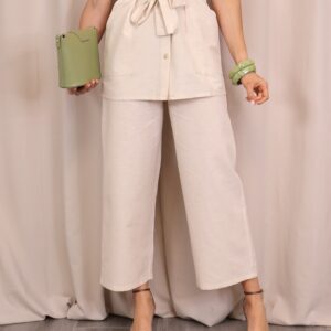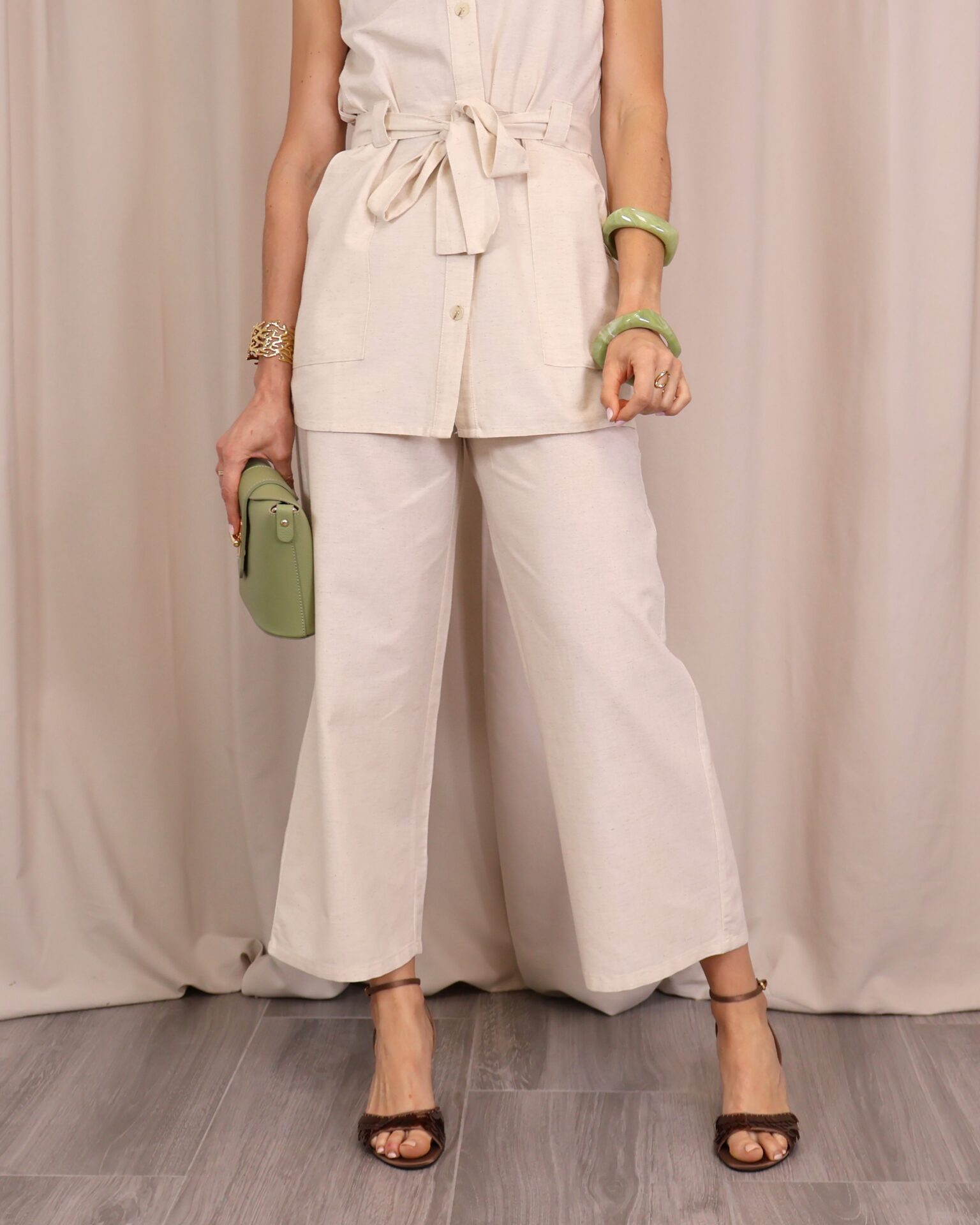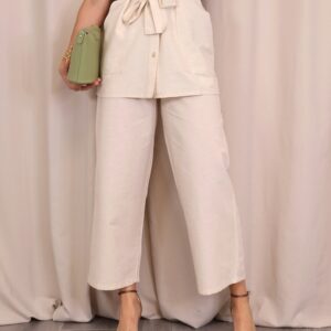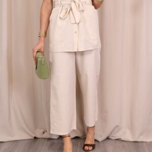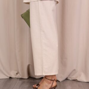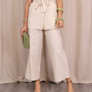 Pantalón de corte recto en tono beige, confeccionado en un tejido cómodo y ligero. Diseño de tiro medio-alto y pernera ancha que aporta fluidez y movimiento. Incorpora bolsillos laterales prácticos y cierre frontal mediante cremallera y botón. Además, cuenta con goma en la parte trasera de la cintura para un ajuste más cómodo y favorecedor. Una prenda versátil y fácil de combinar, perfecta tanto para conjuntos coordinados como para looks más informales.