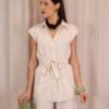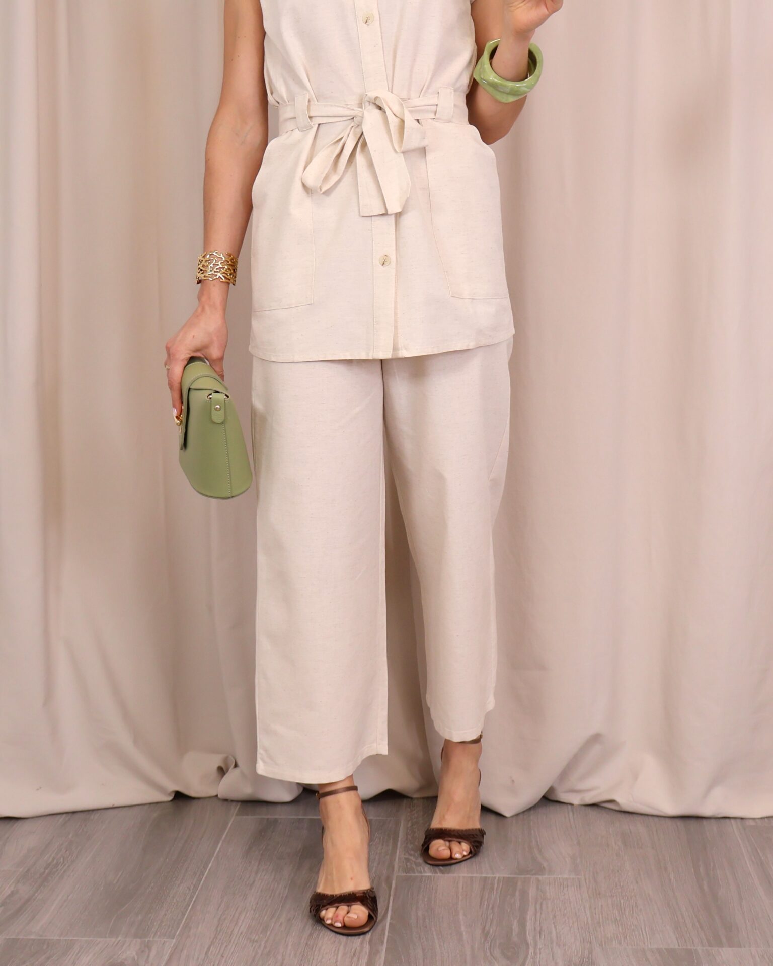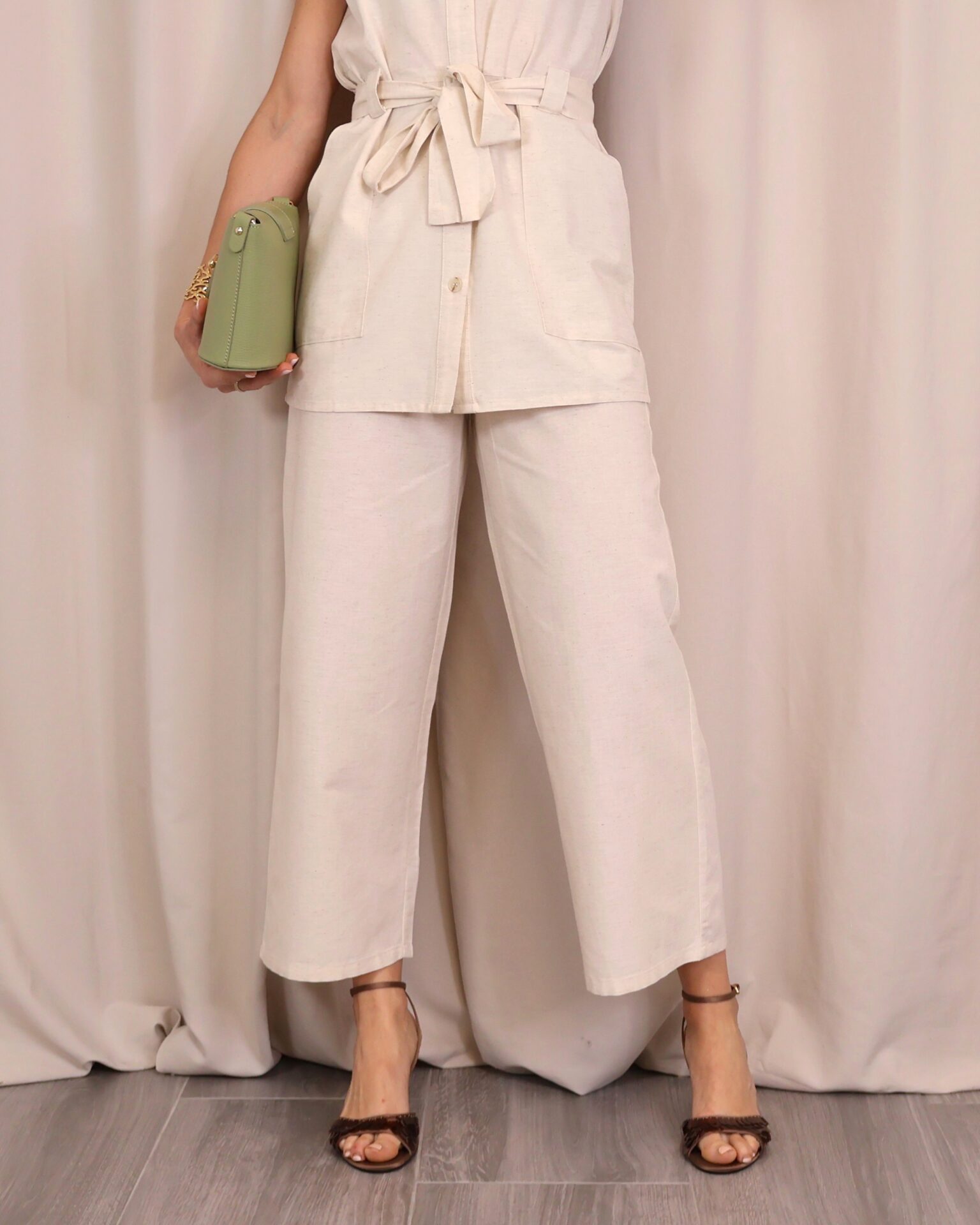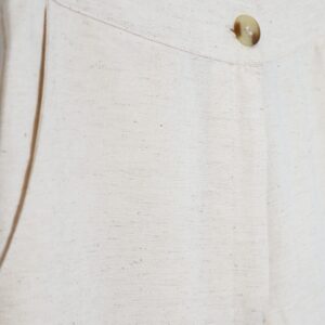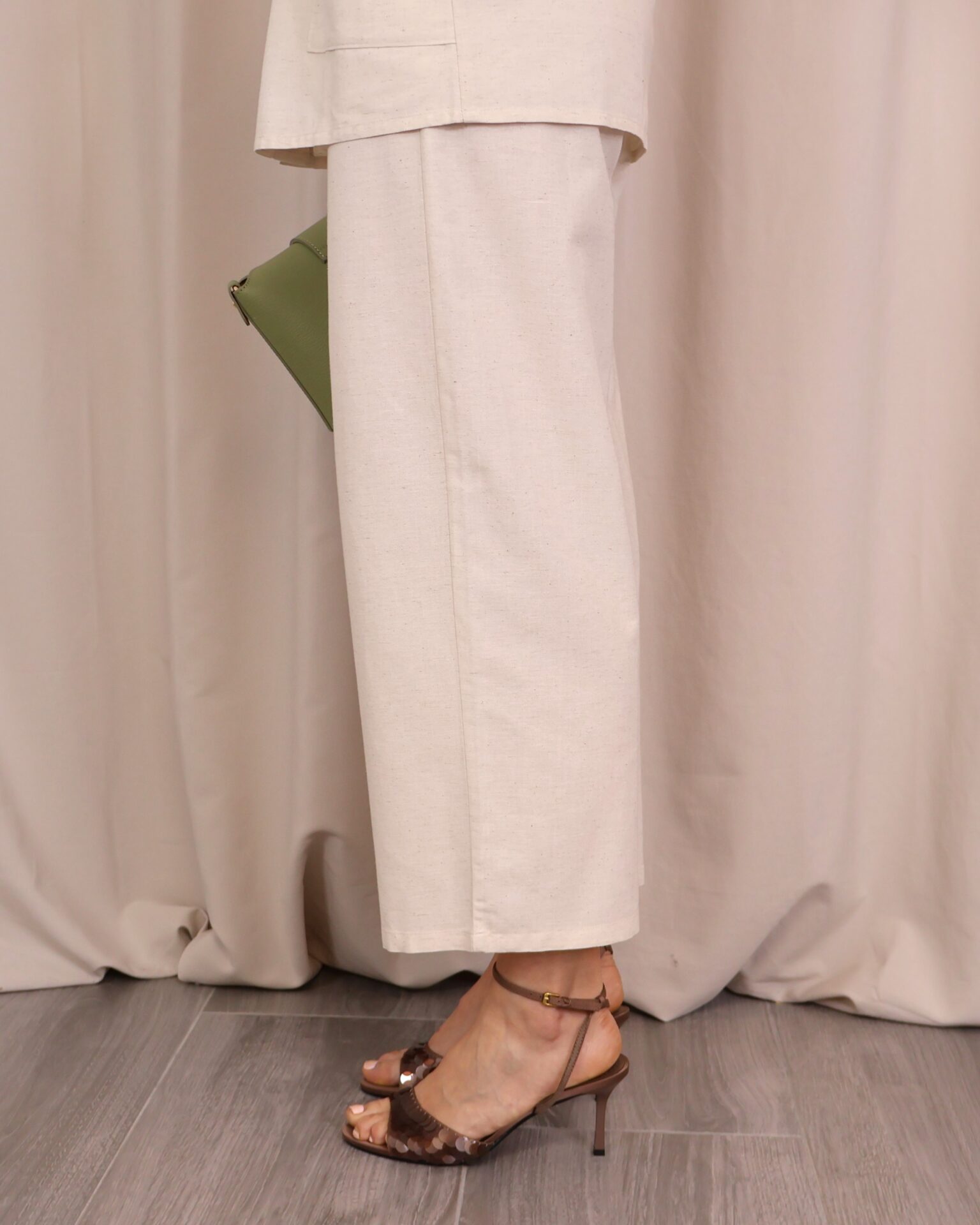 Pantalón de corte recto en tono beige, confeccionado en un tejido cómodo y ligero. Diseño de tiro medio-alto y pernera ancha que aporta fluidez y movimiento. Incorpora bolsillos laterales prácticos y cierre frontal mediante cremallera y botón. Además, cuenta con goma en la parte trasera de la cintura para un ajuste más cómodo y favorecedor. Una prenda versátil y fácil de combinar, perfecta tanto para conjuntos coordinados como para looks más informales.