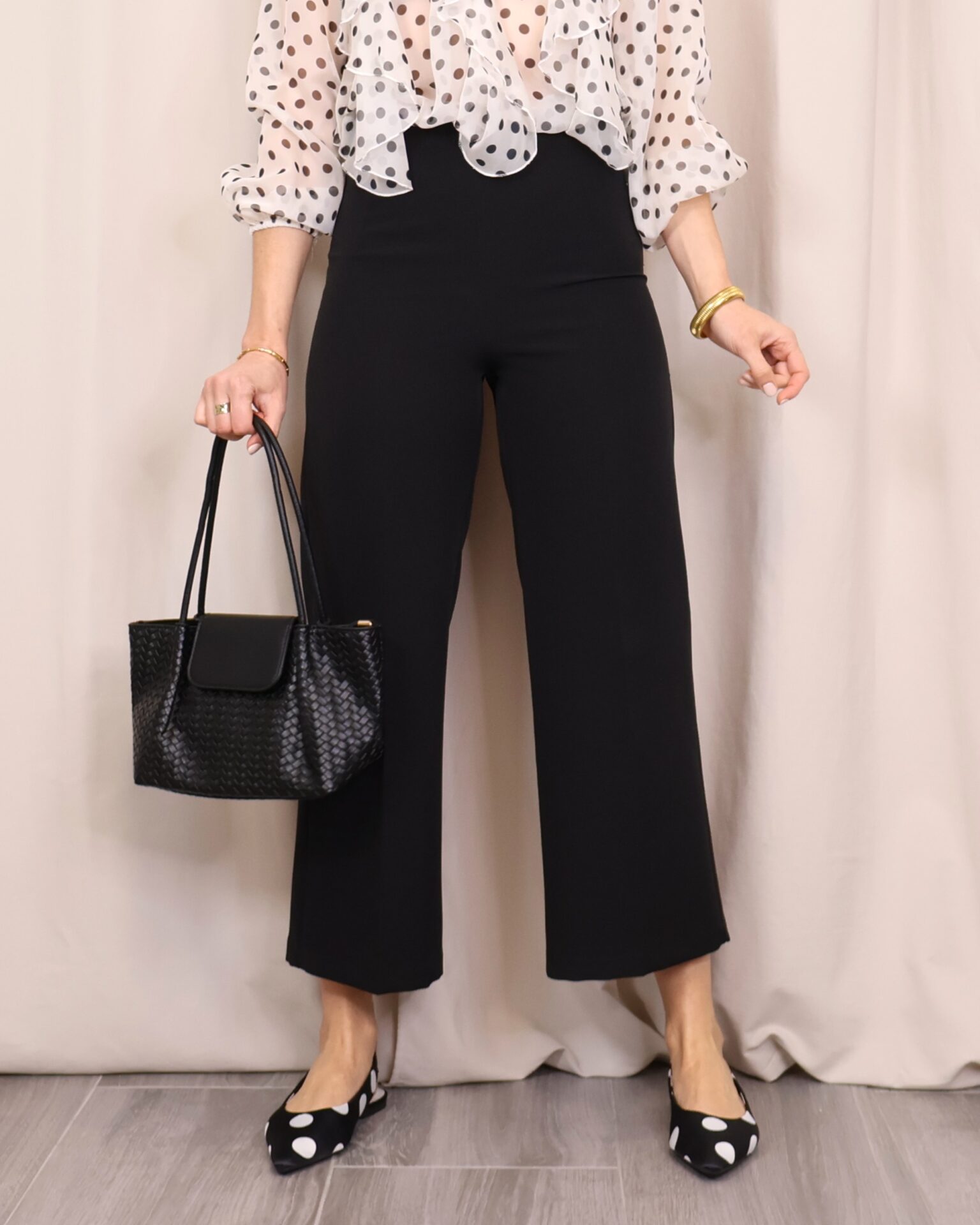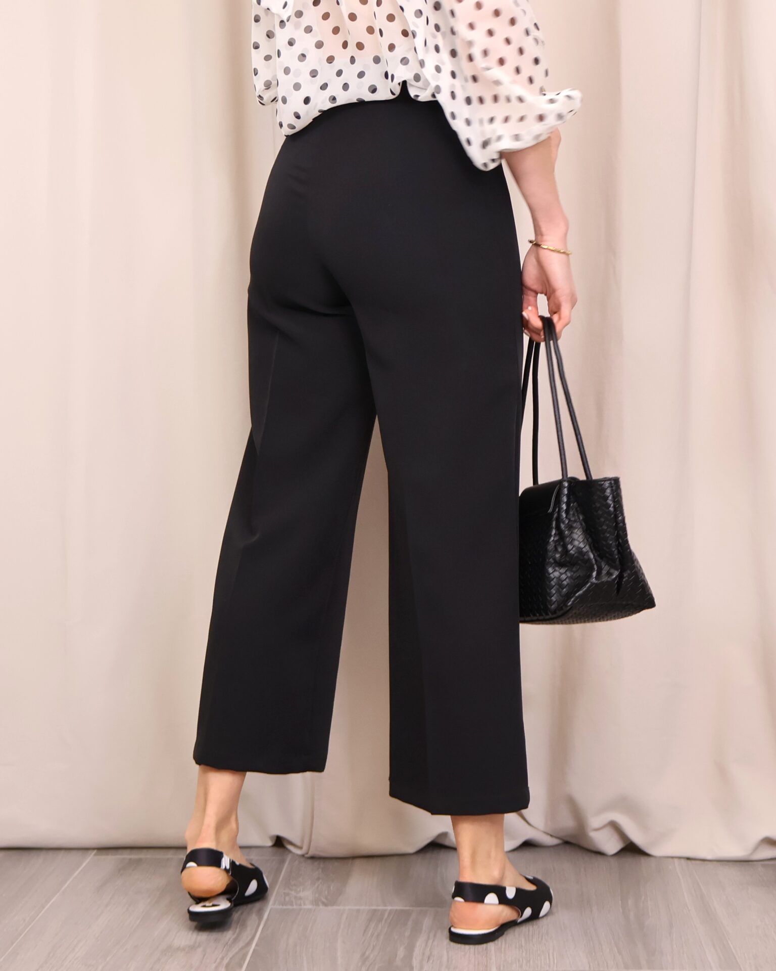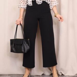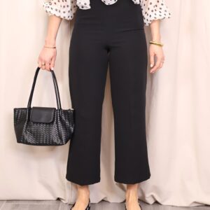 Pantalón negro, elegante y versátil, ideal para looks formales o sofisticados. Diseñado con cierre lateral invisible mediante cremallera, que proporciona un acabado limpio y estilizado.