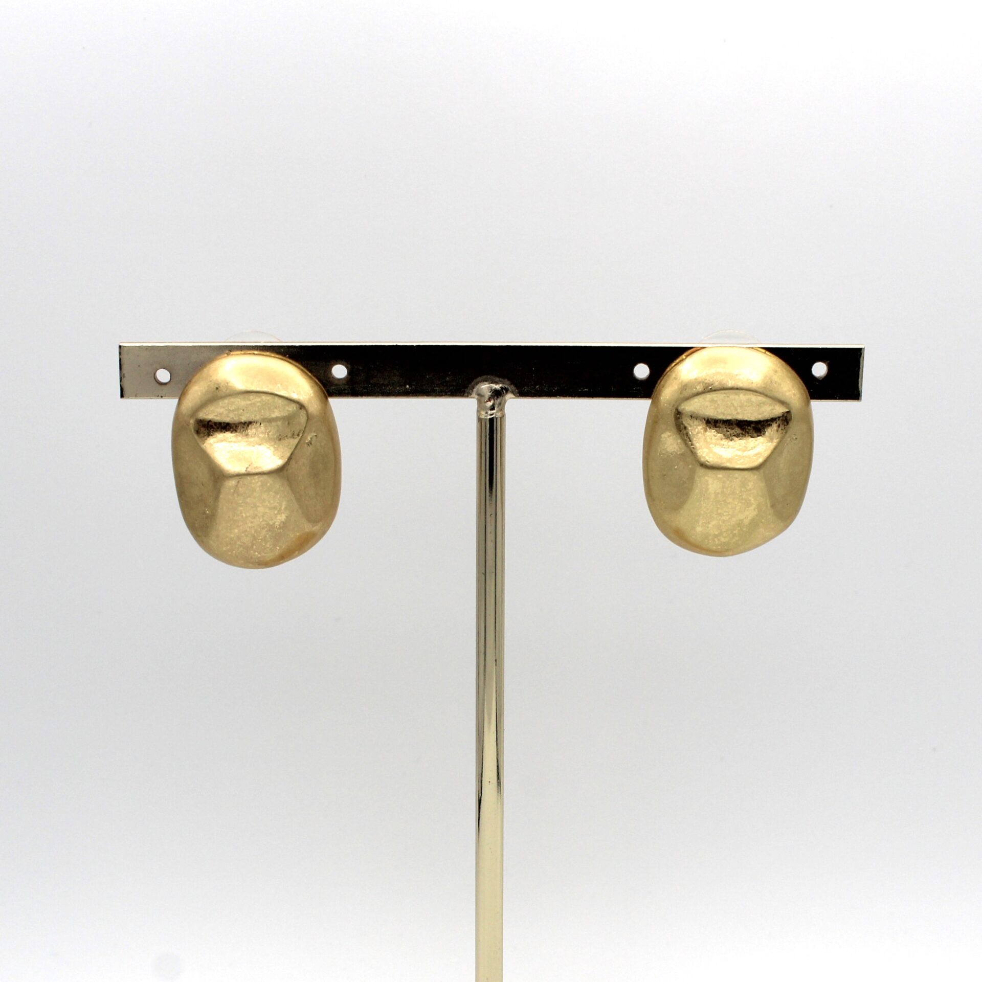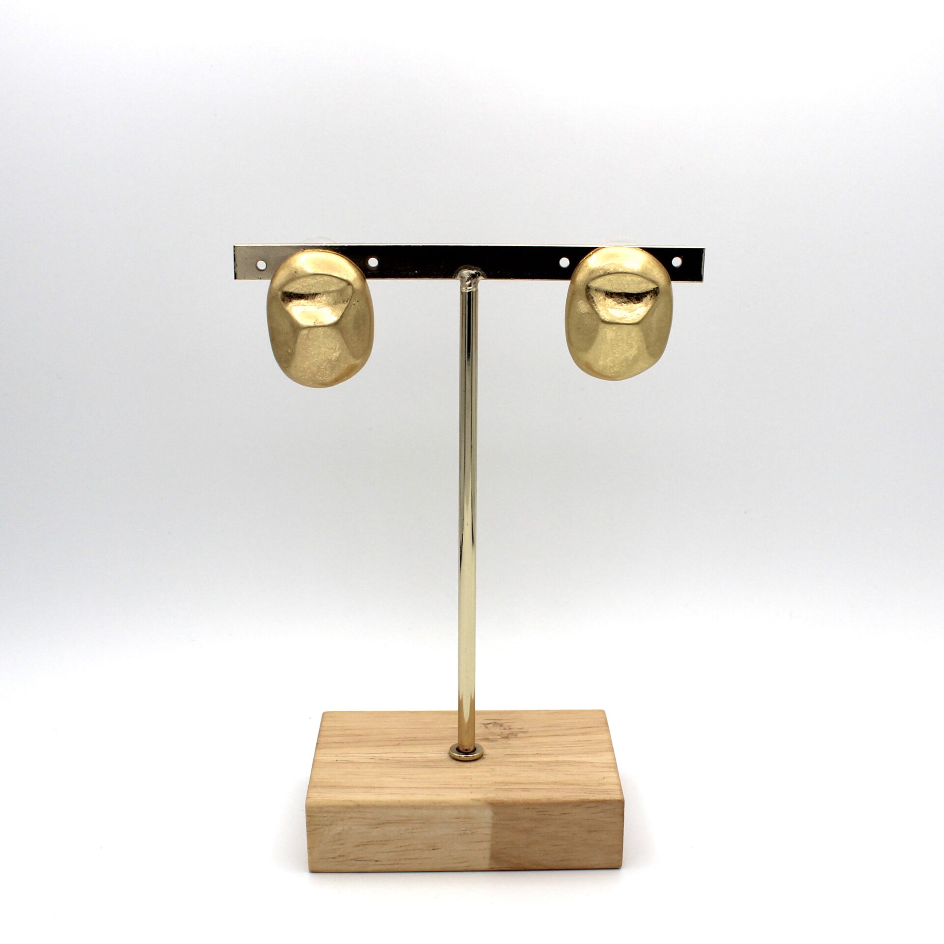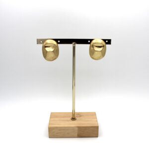 Pendientes en forma circular alargada en tono dorado desgastado. Cierre a presión.