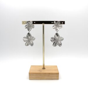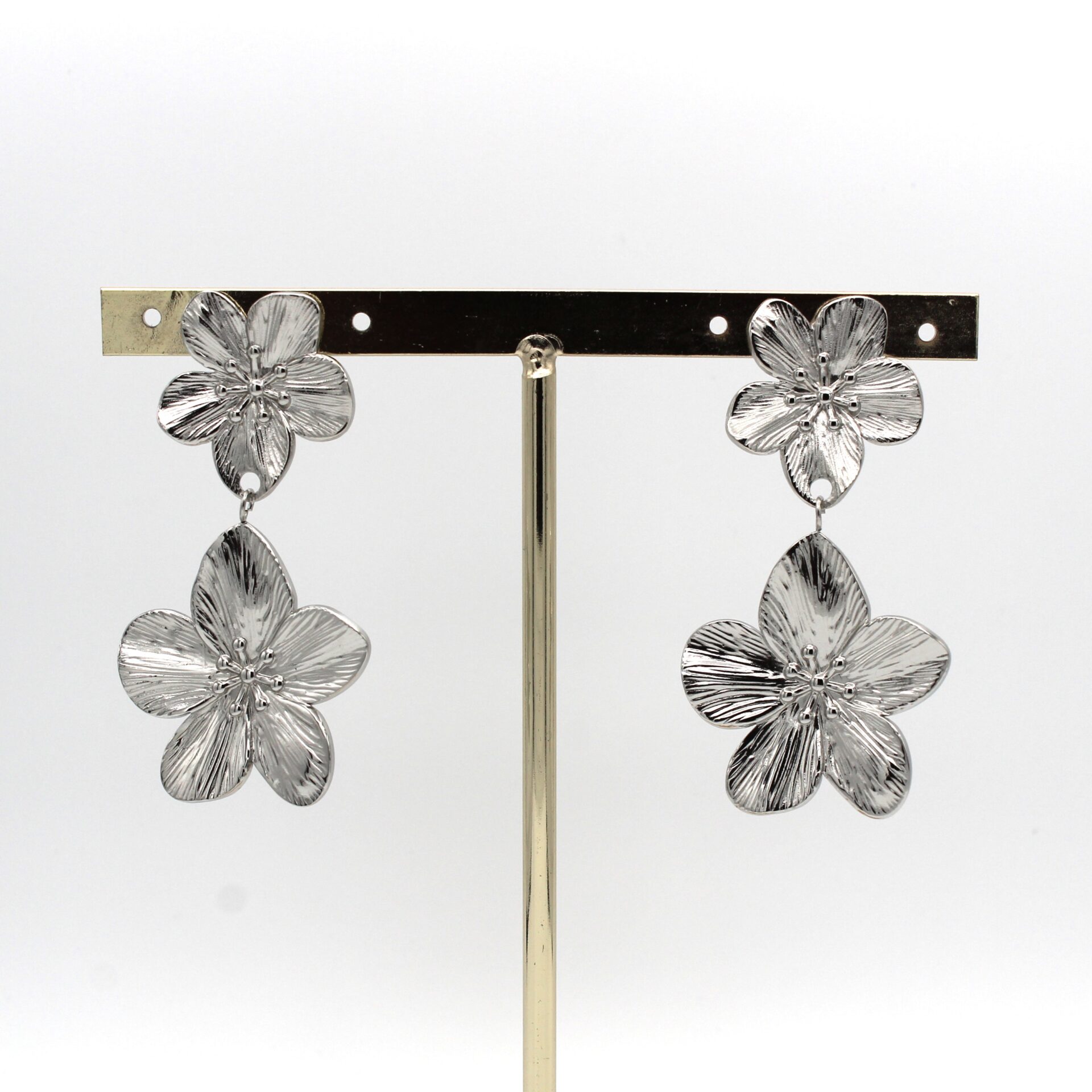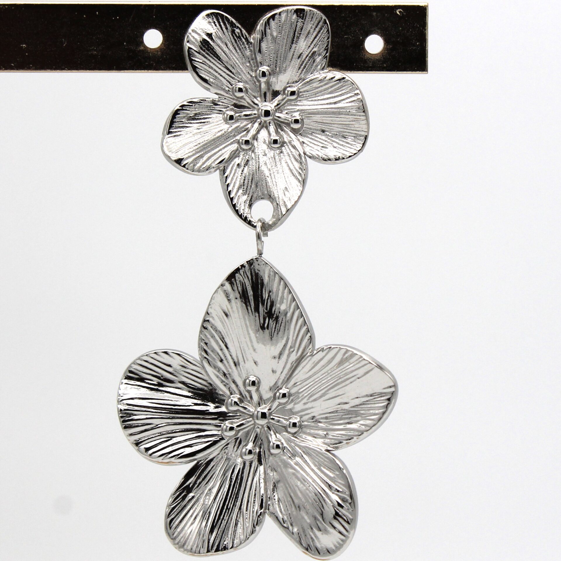Pendientes en forma de flor en dos tamaños unidos en tono plateado con relieve. Cierre a presión.
