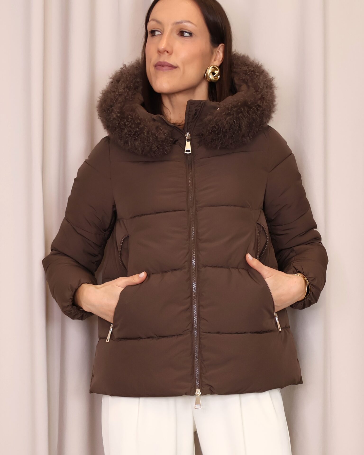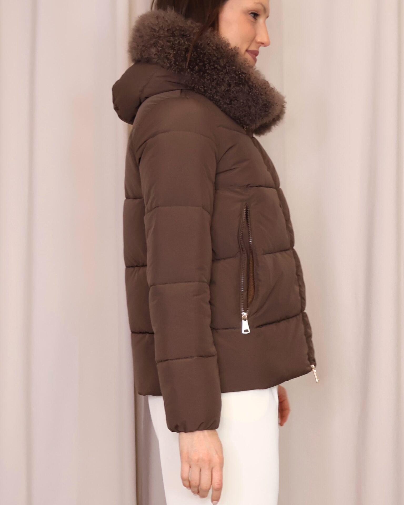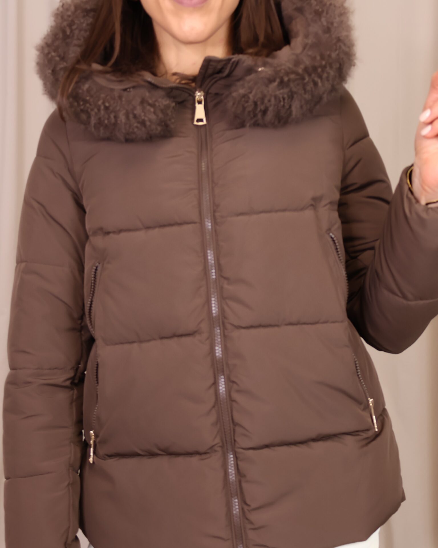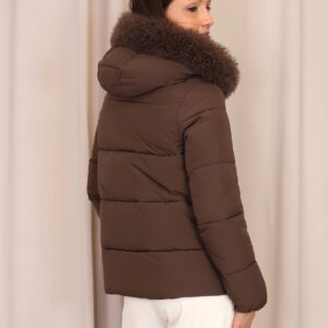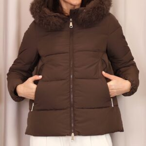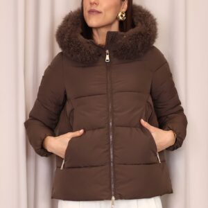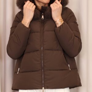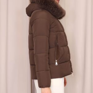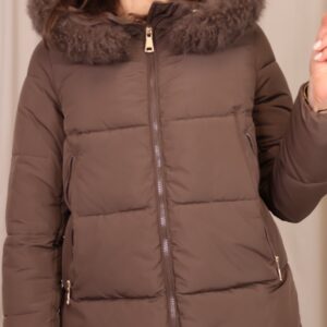 Abrigo plumífero acolchado en un elegante tono marrón chocolate. Dispone de una capucha con pelo desmontable, cierre frontal con cremallera y bolsillos laterales que aportan practicidad y abrigo para las manos. Una prenda que une estilo y confort, ideal para afrontar los días más fríos.
