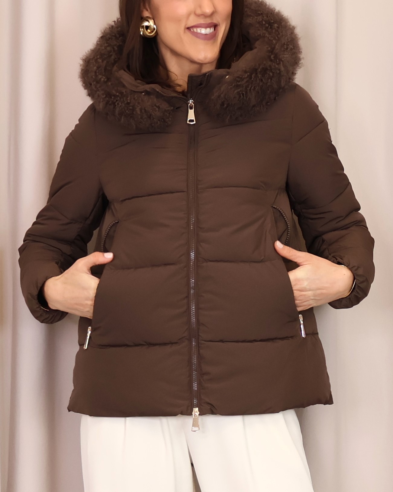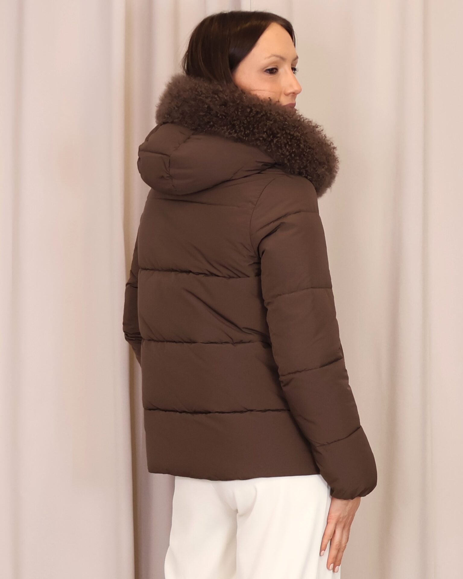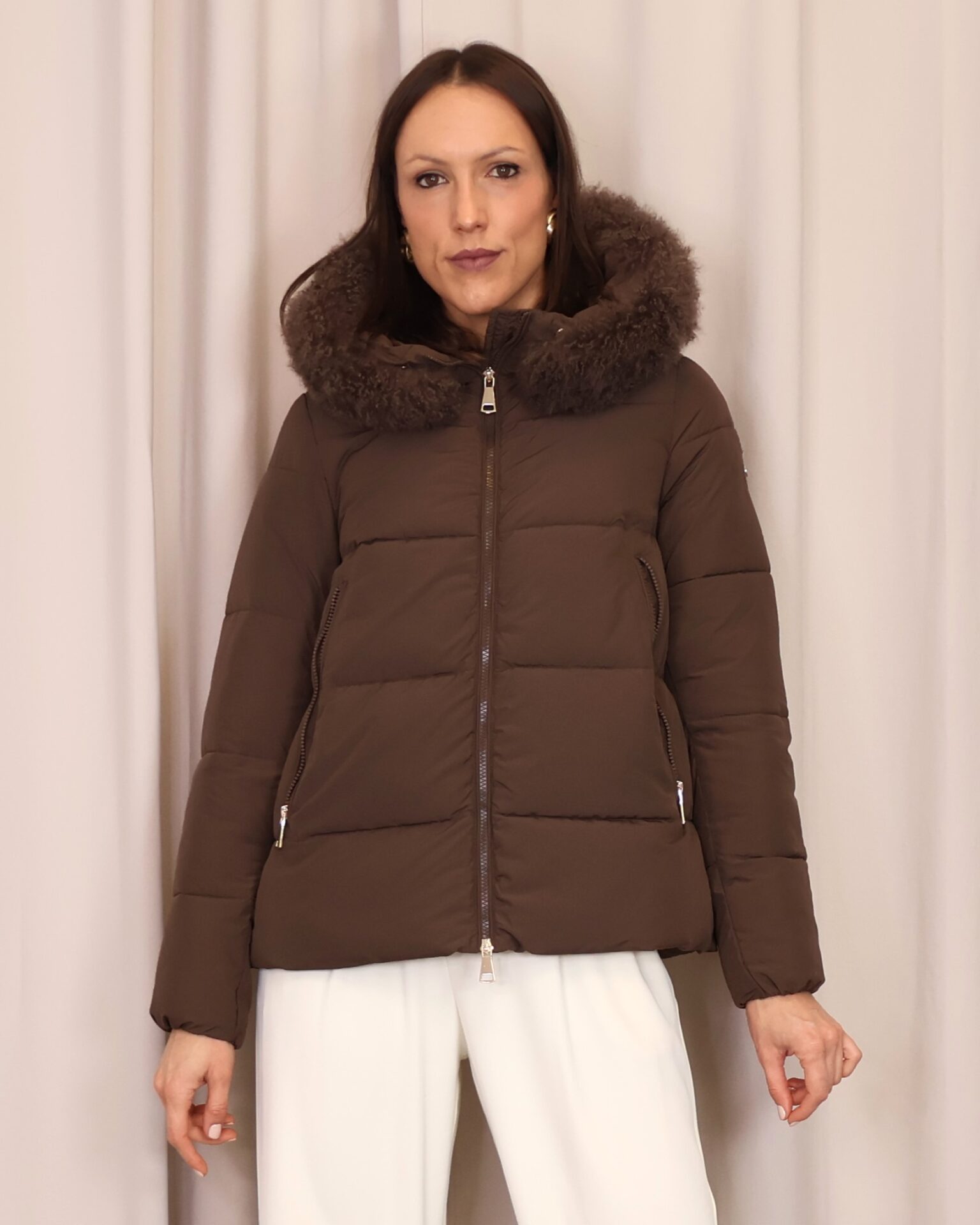 Abrigo plumífero acolchado en un elegante tono marrón chocolate. Dispone de una capucha con pelo desmontable, cierre frontal con cremallera y bolsillos laterales que aportan practicidad y abrigo para las manos. Una prenda que une estilo y confort, ideal para afrontar los días más fríos.