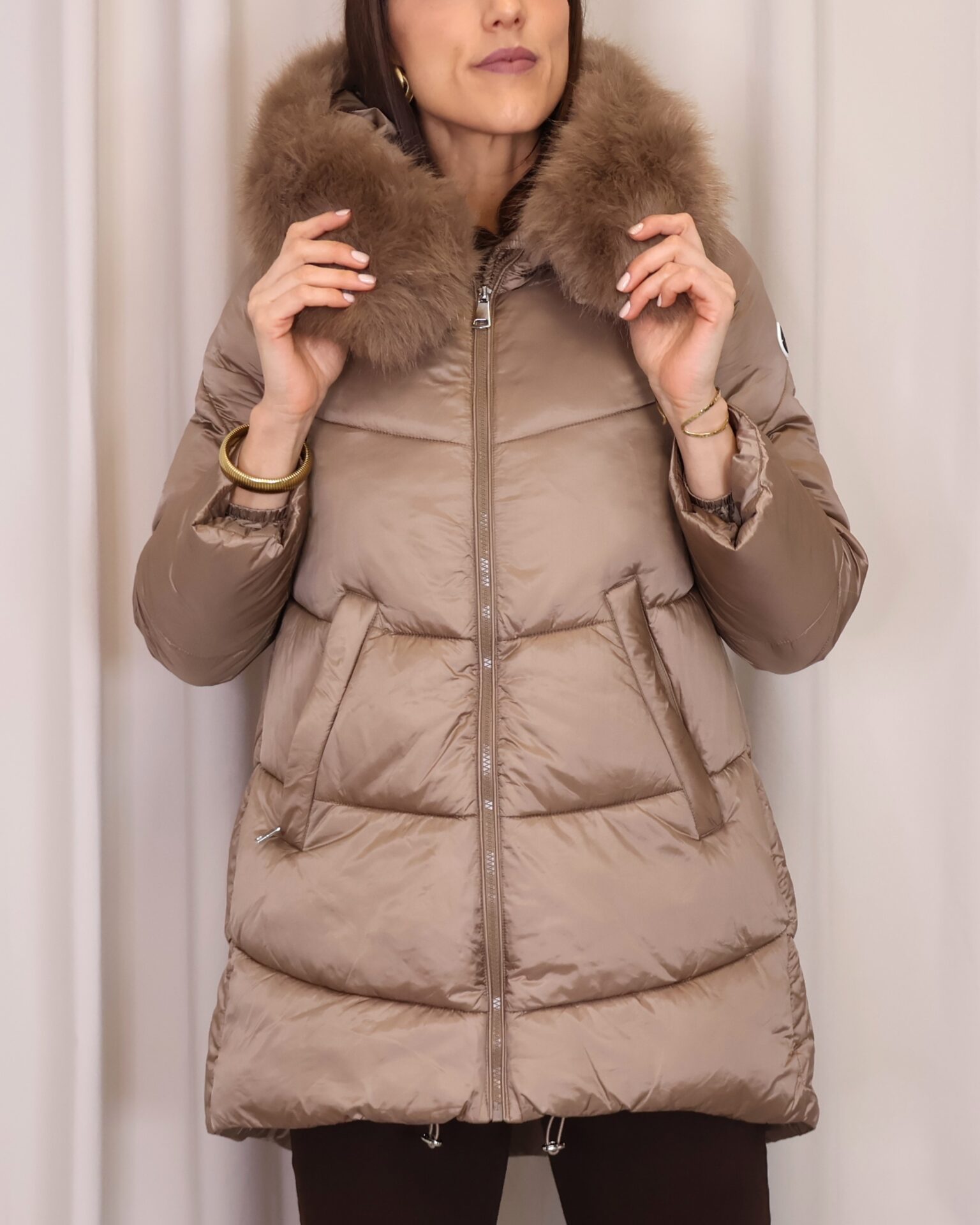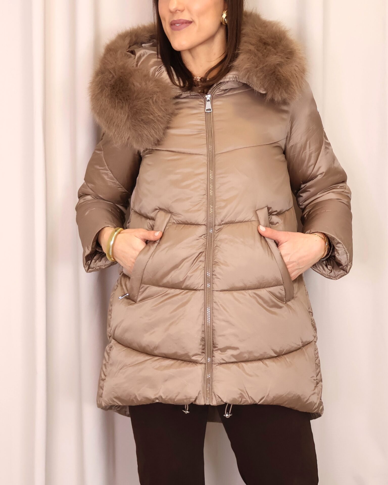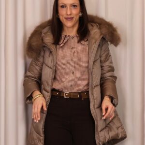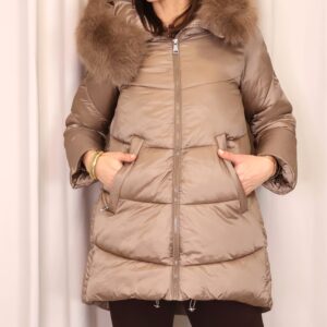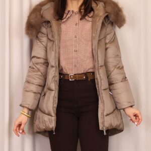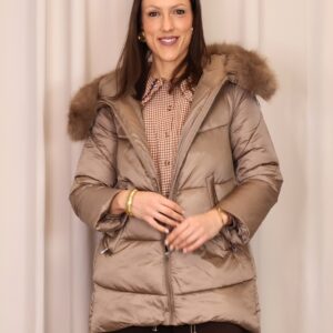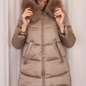 Abrigo plumífero en tono mocca mousse. Cuenta con una capucha con pelo desmontable, cierre frontal con cremallera y bolsillos laterales que ofrecen funcionalidad y calidez para las manos. Una prenda que combina estilo y comodidad para los días fríos.