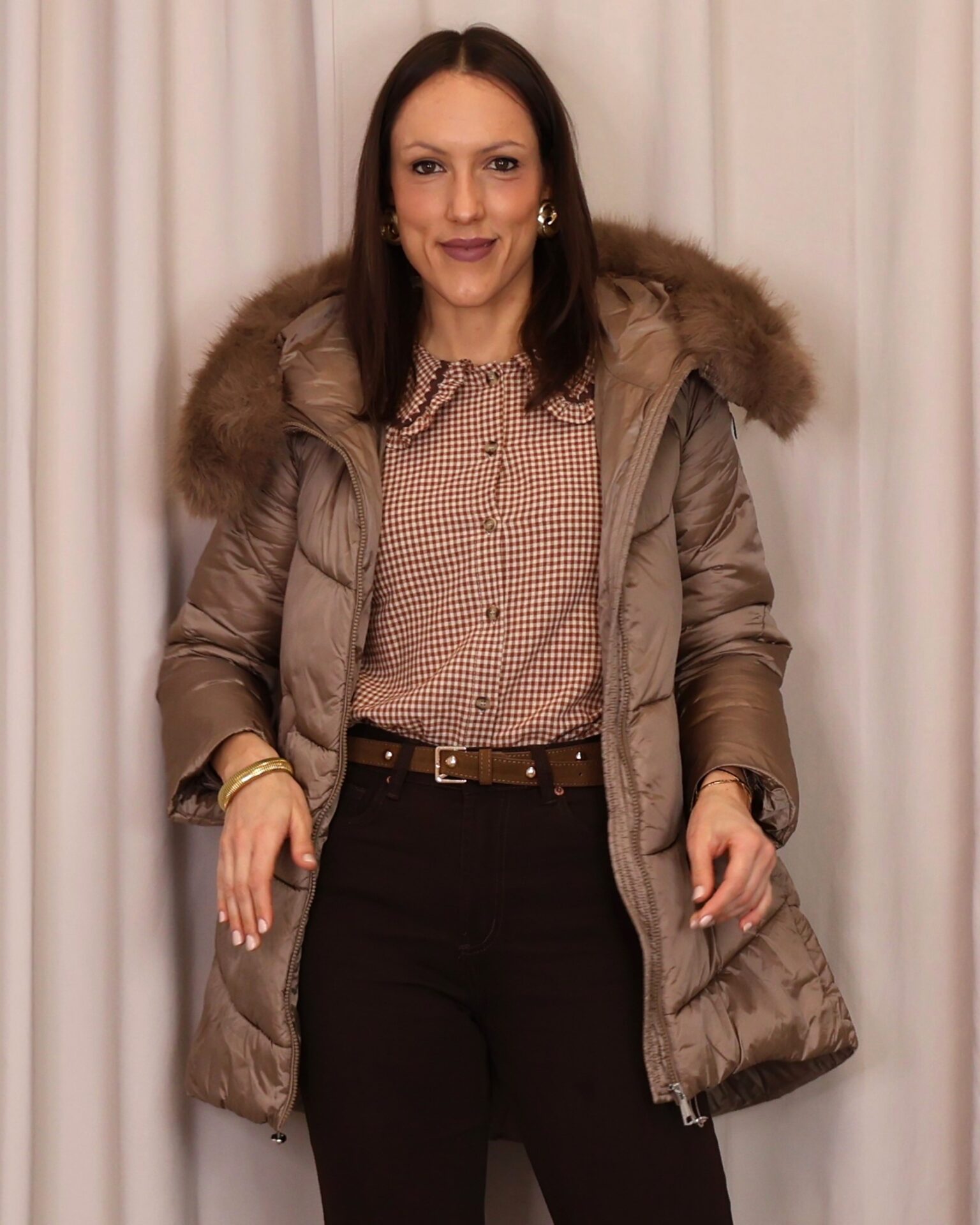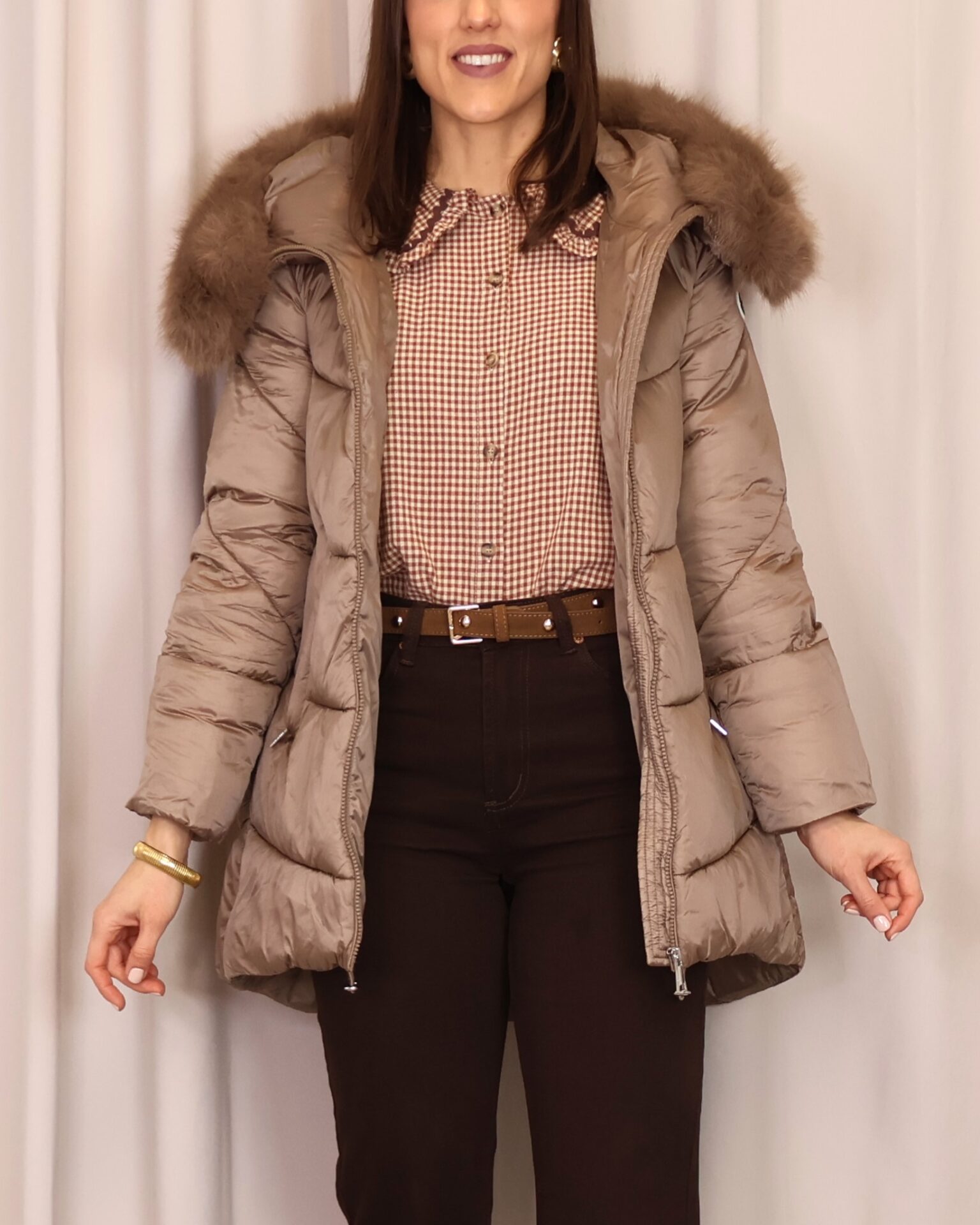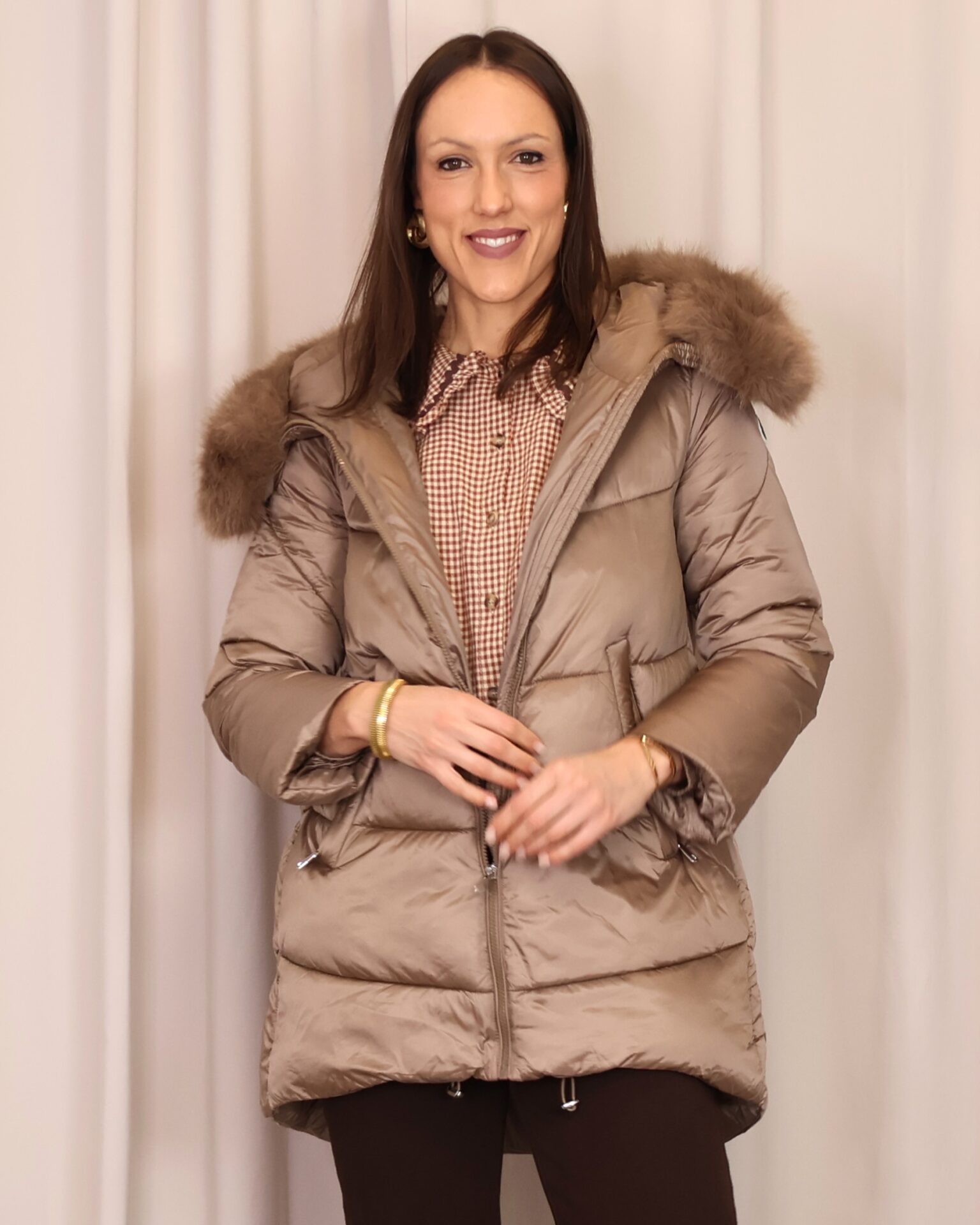Abrigo plumífero en tono mocca mousse. Cuenta con una capucha con pelo desmontable, cierre frontal con cremallera y bolsillos laterales que ofrecen funcionalidad y calidez para las manos. Una prenda que combina estilo y comodidad para los días fríos.