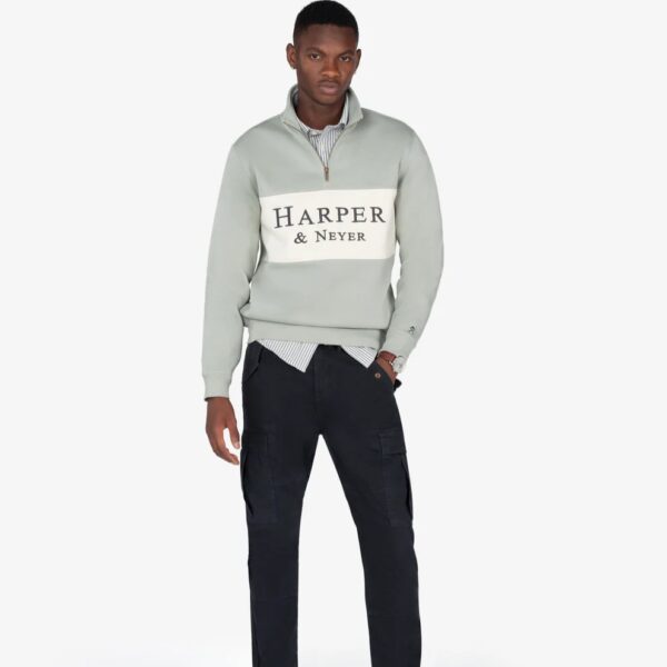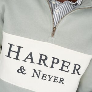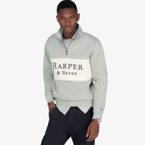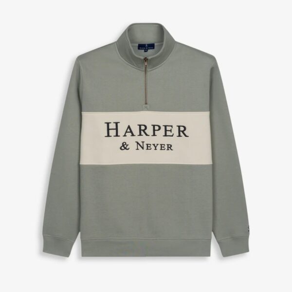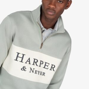 Sudadera con media cremallera y panel frontal en contraste, confeccionada en mezcla de algodón de corte regular fit. Cuenta con cuello alto, puños y bajo acanalados y un diseño limpio rematado con el logotipo “”Harper & Neyer”” serigrafiado en el pecho.