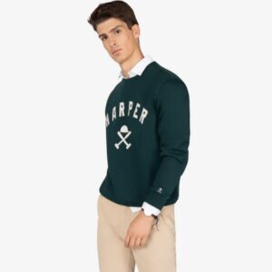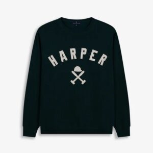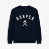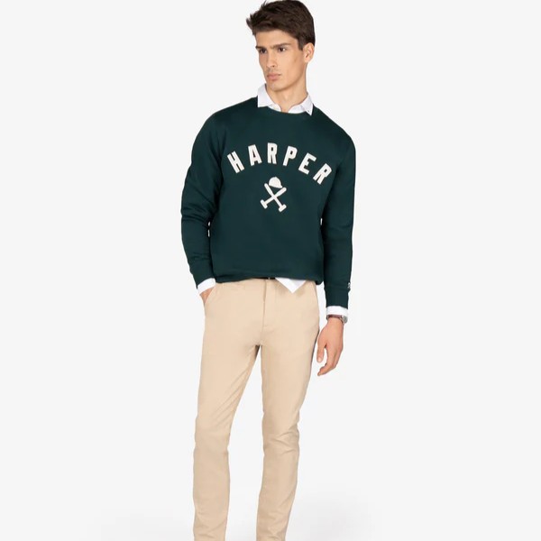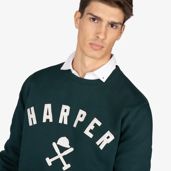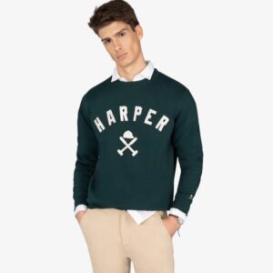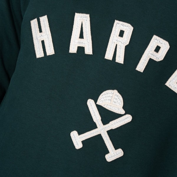 Sudadera tipo college con logo bordado. Inspirada en las universidades del este americano, esta sudadera perchada incorpora el nombre “HARPER” en tipografía varsity y nuestro logo en el centro.