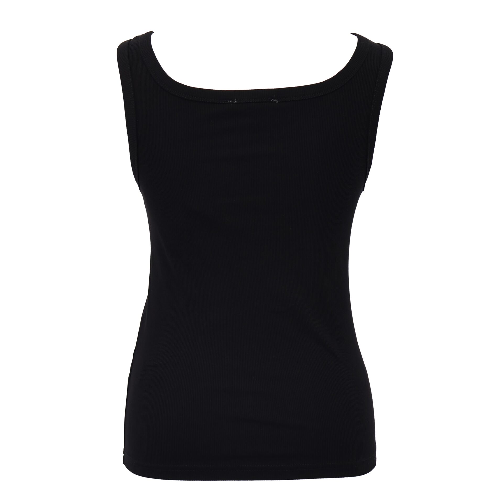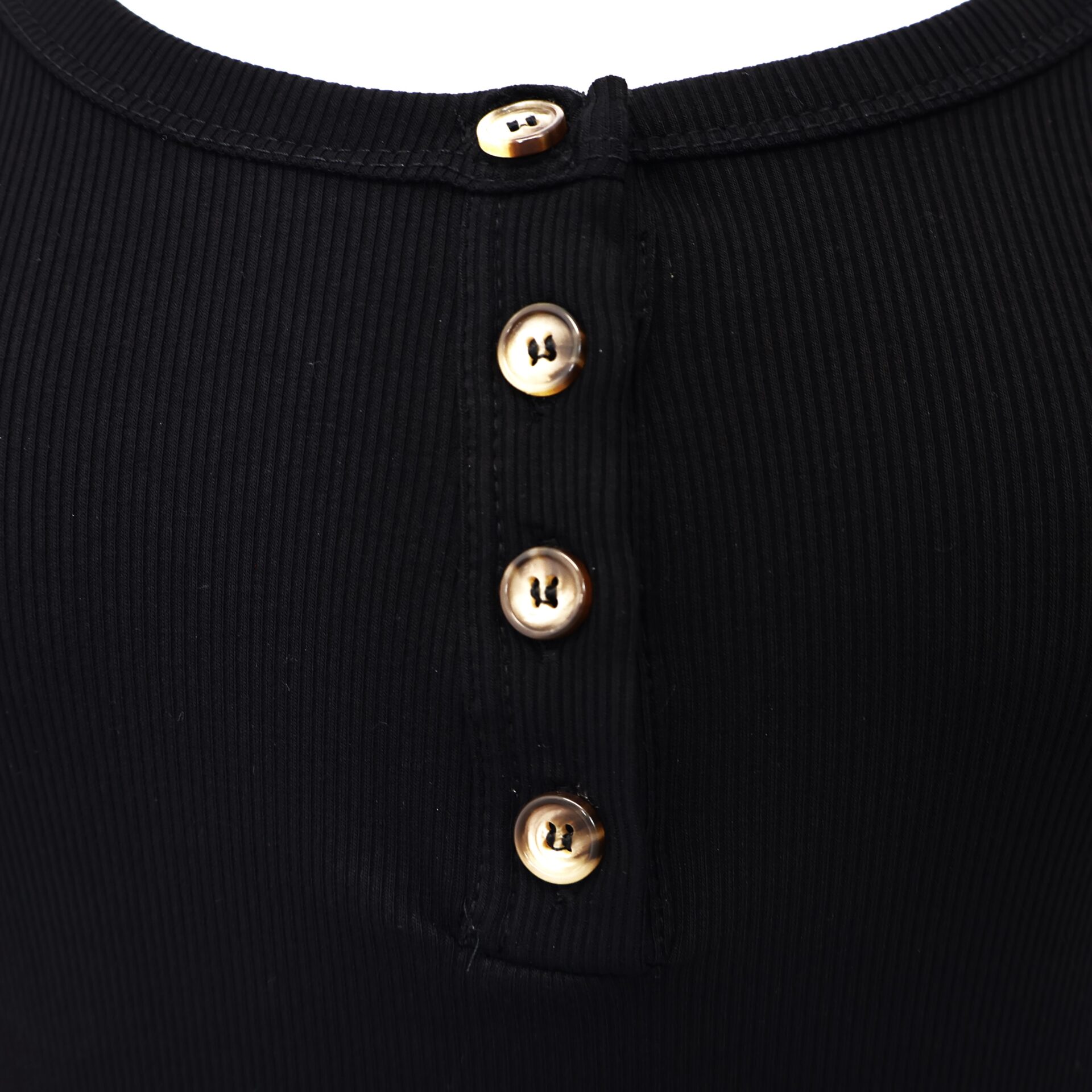 Top negro con tirante ancho. Confeccionado en tejido de punto elástico. Escote redondo acabado con botones.
