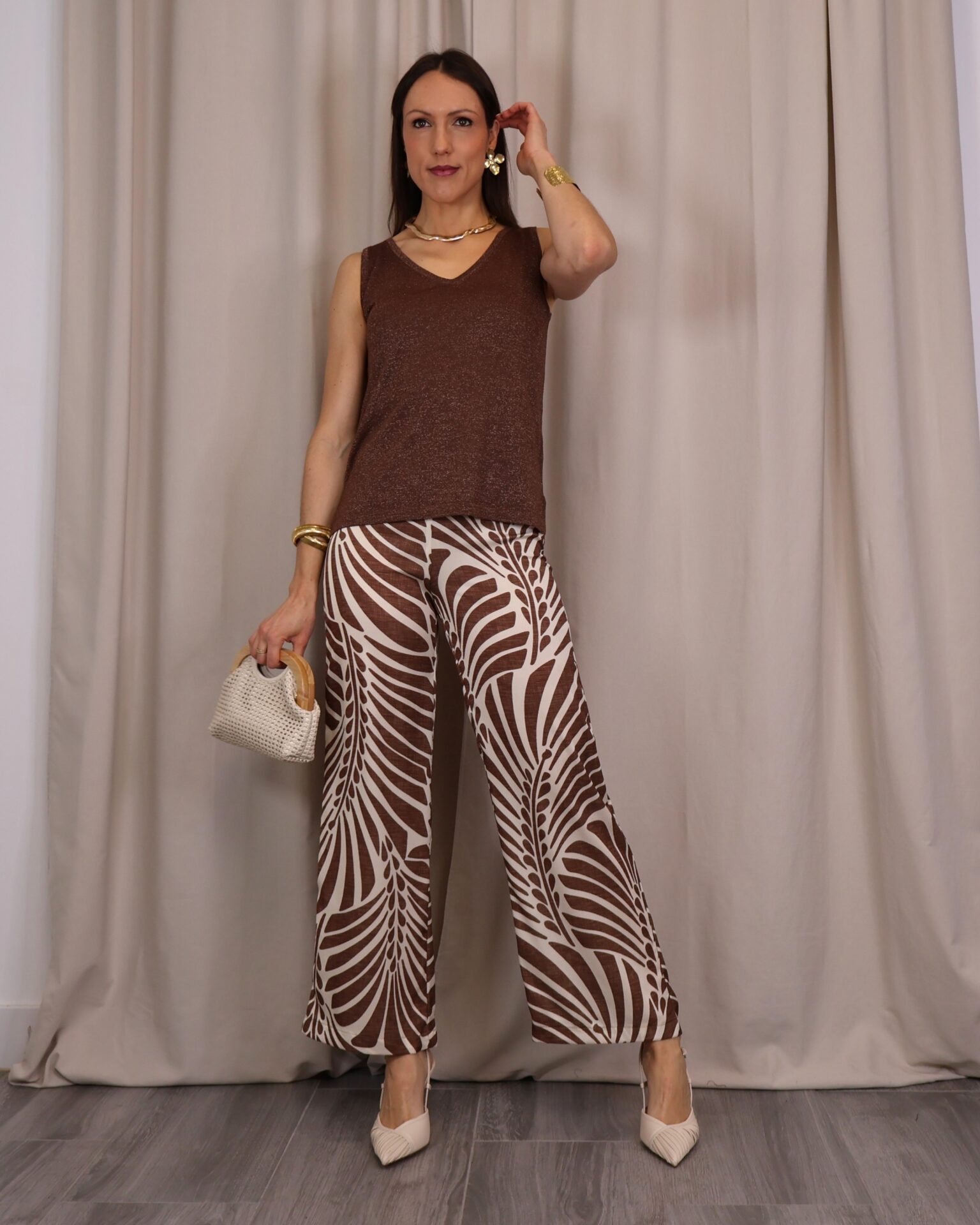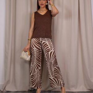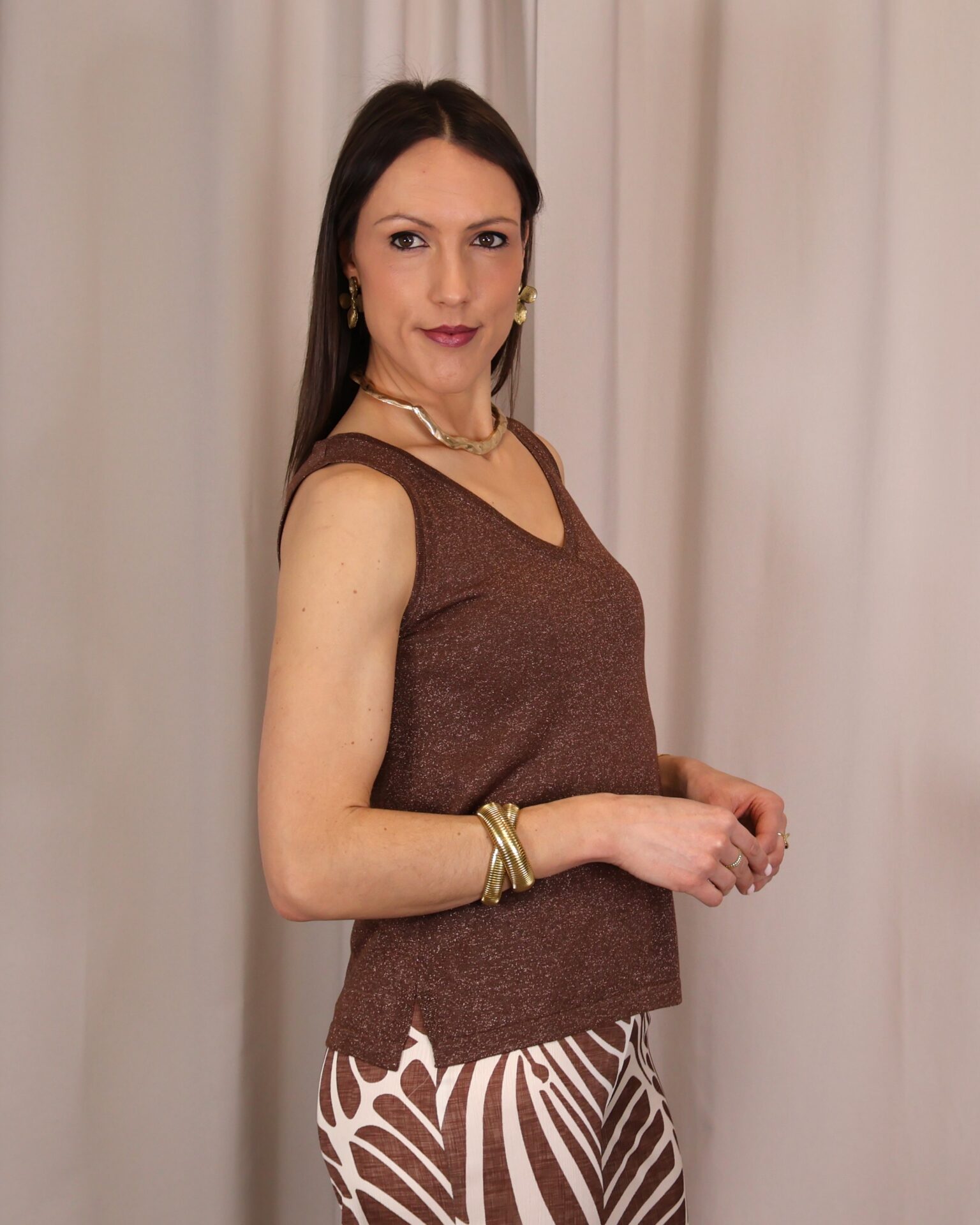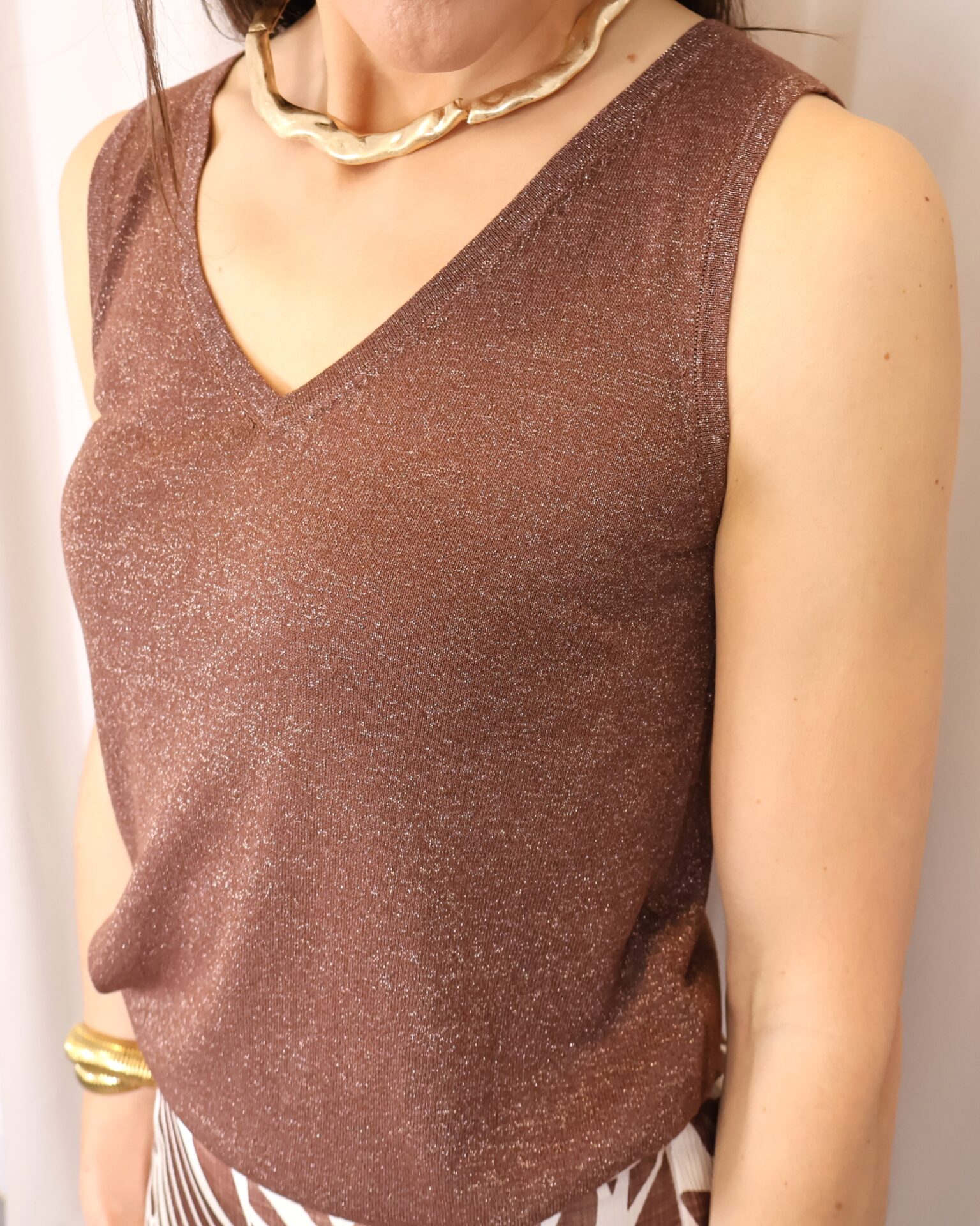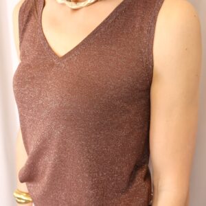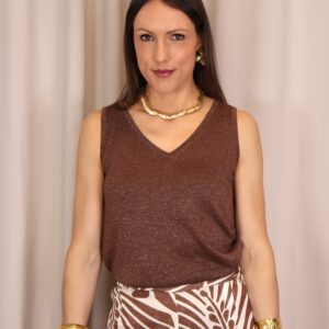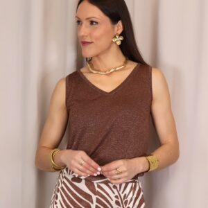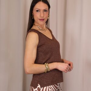 Top de tirantes confeccionado en tejido de punto lurex en un elegante tono chocolate, ideal para aportar un toque sofisticado y luminoso a cualquier look. Su tejido elástico se adapta cómodamente al cuerpo, realzando la silueta sin renunciar al confort. Presenta un favorecedor escote en pico que estiliza el cuello y aporta un aire femenino y versátil, perfecto tanto para ocasiones especiales como para combinar en estilismos más casual.