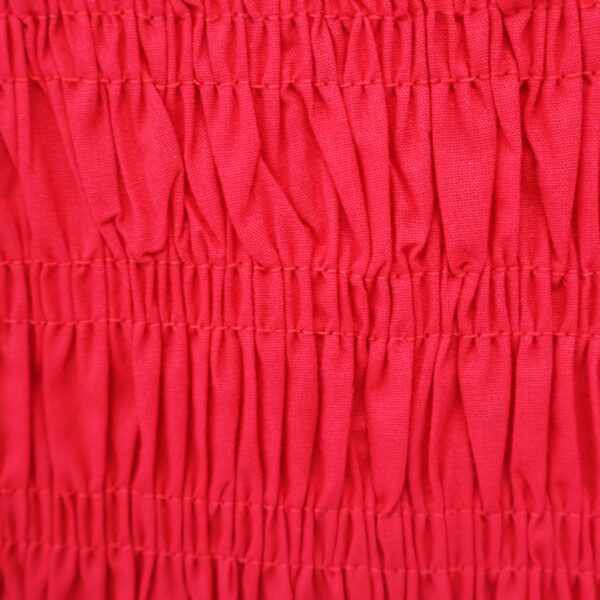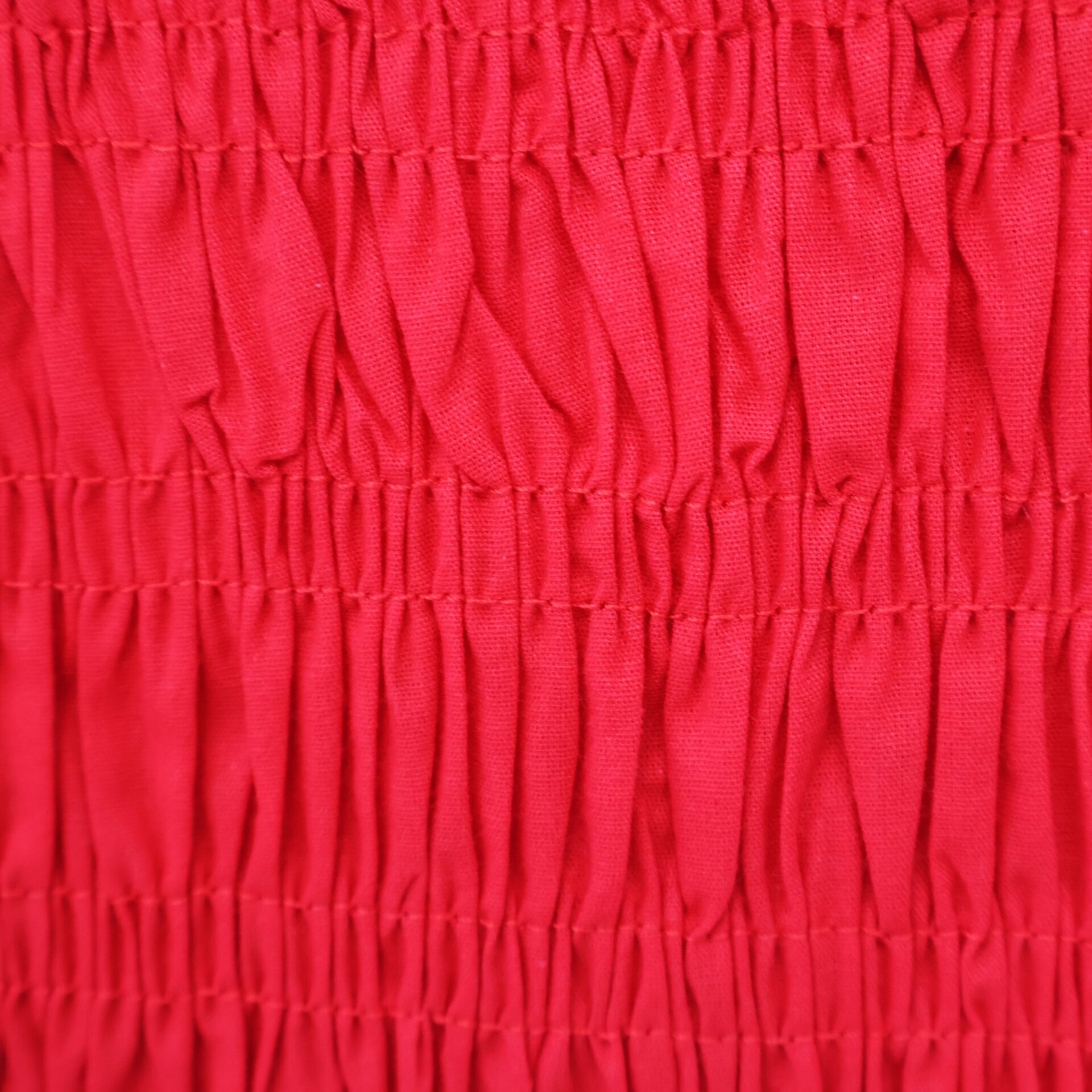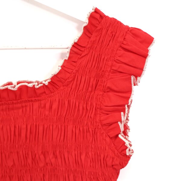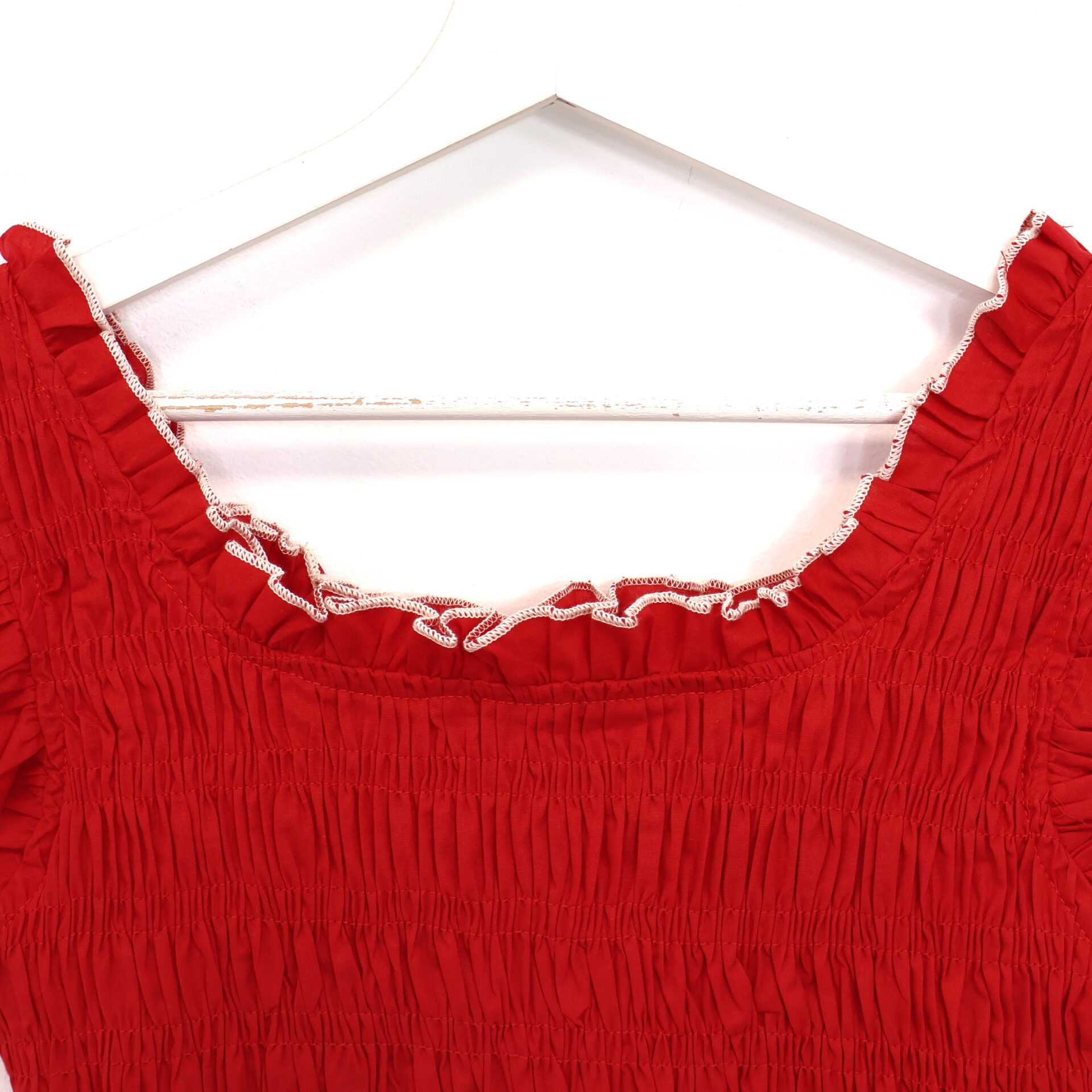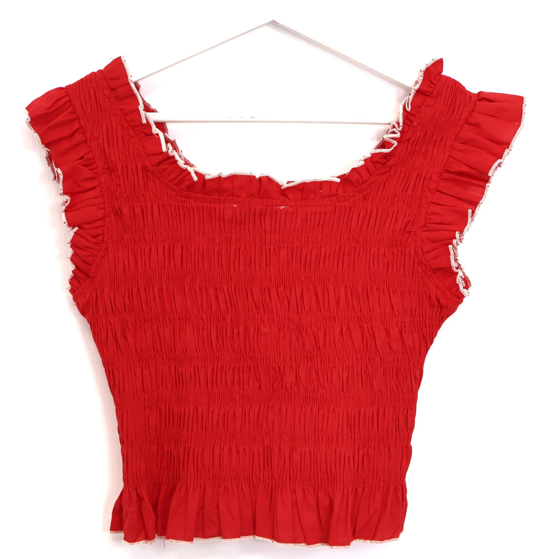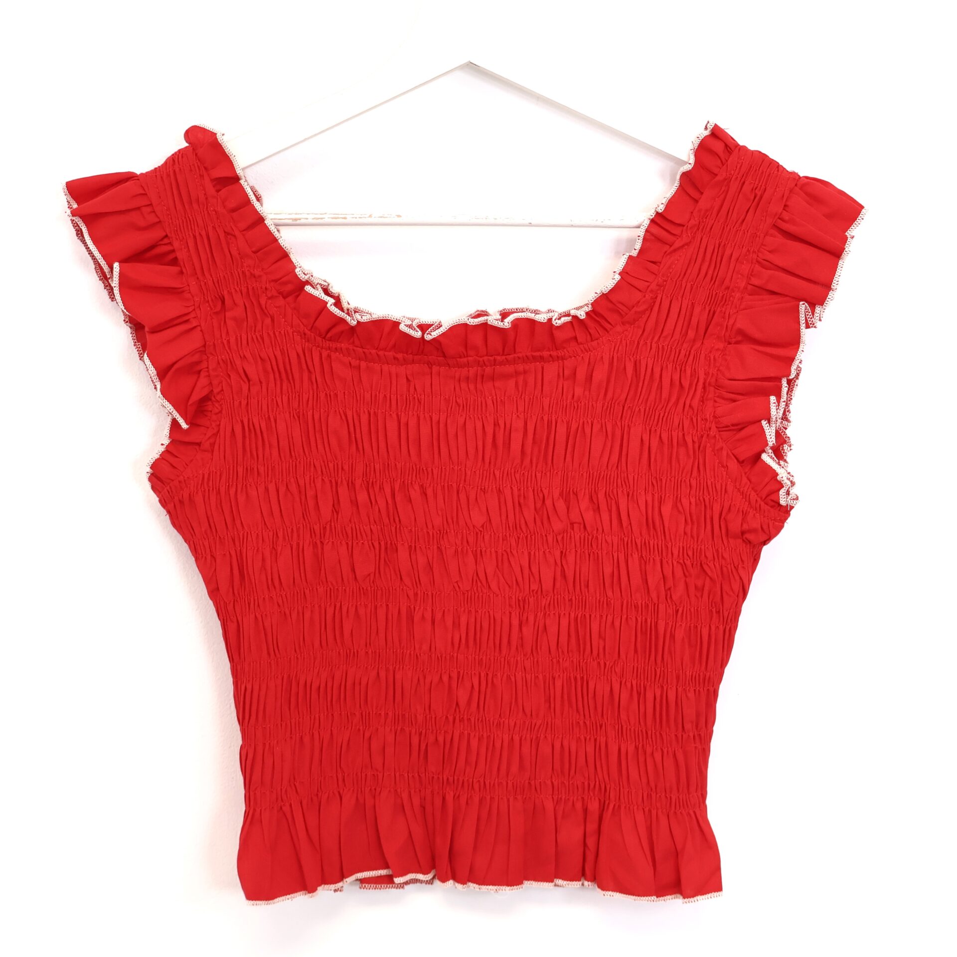 Top rojo de corte cropped y tirante ancho con detalle de bordes bordados a contraste en blanco. Tejido elástico gracias al nido de abeja. Escotes delantero y trasero cuadrados. Detalle de pequeño volante en hombro.