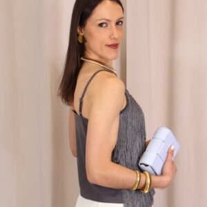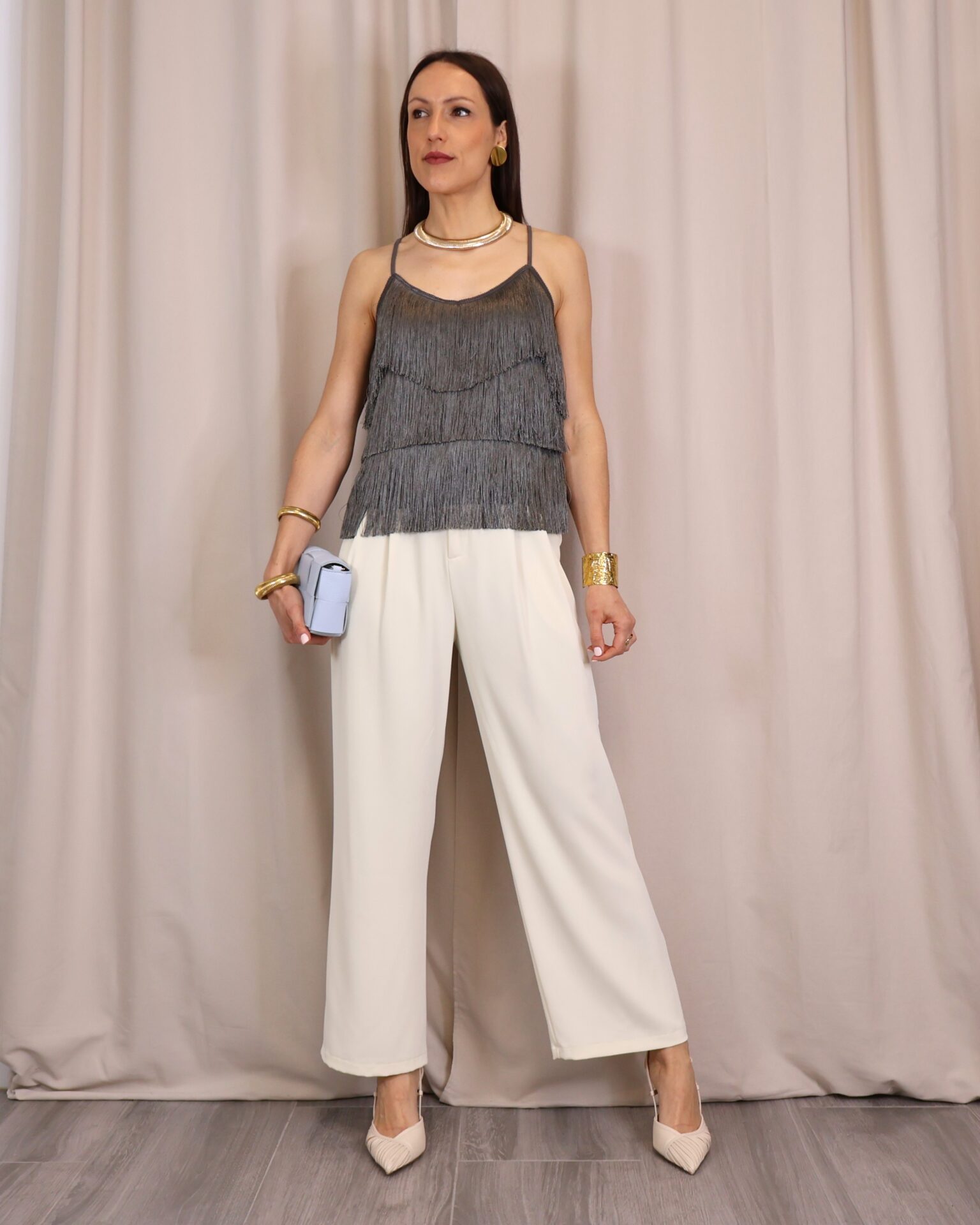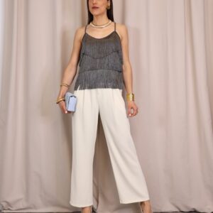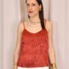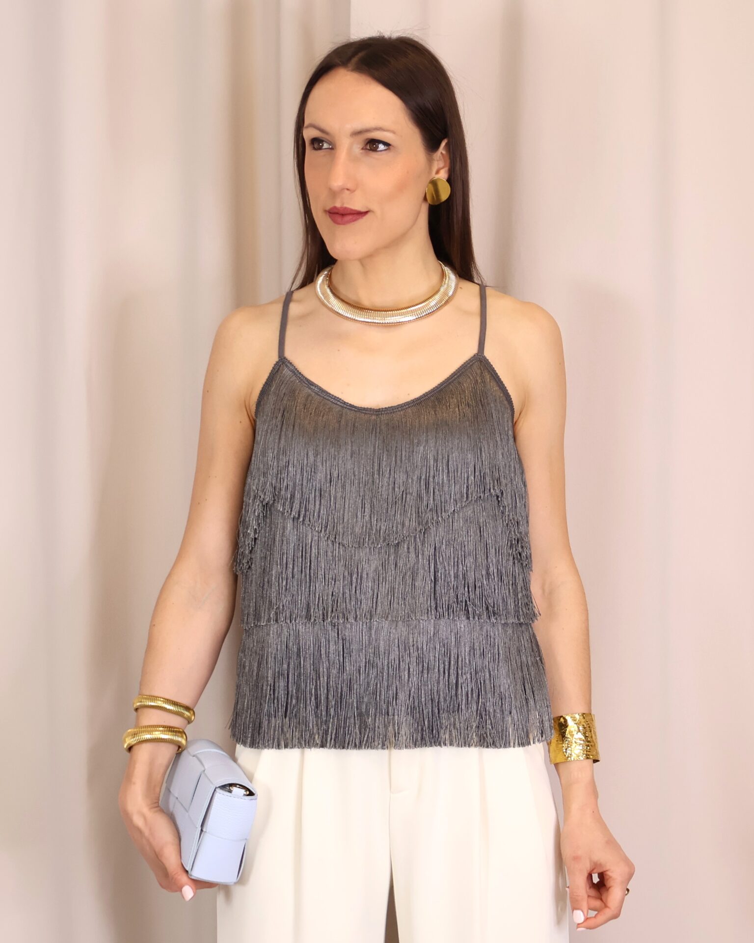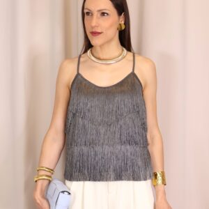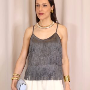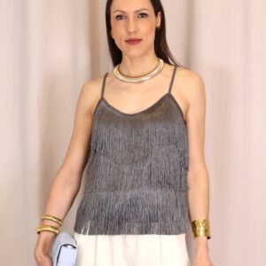 Top en color gris confeccionado en suave ante, con un acabado elegante y atemporal. Presenta un favorecedor escote en pico y flecos en la parte delantera que aportan movimiento y un aire boho. Incorpora tirantes finos regulables para un ajuste cómodo. Una prenda versátil y con personalidad, perfecta para completar cualquier look con estilo.