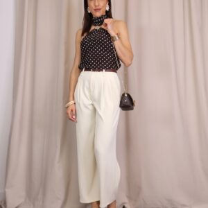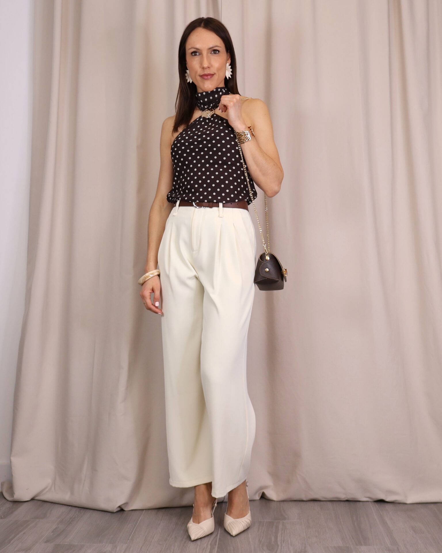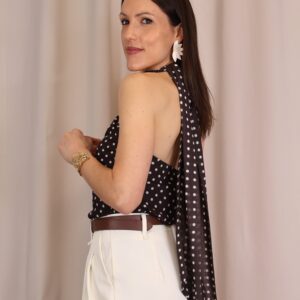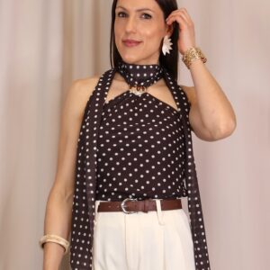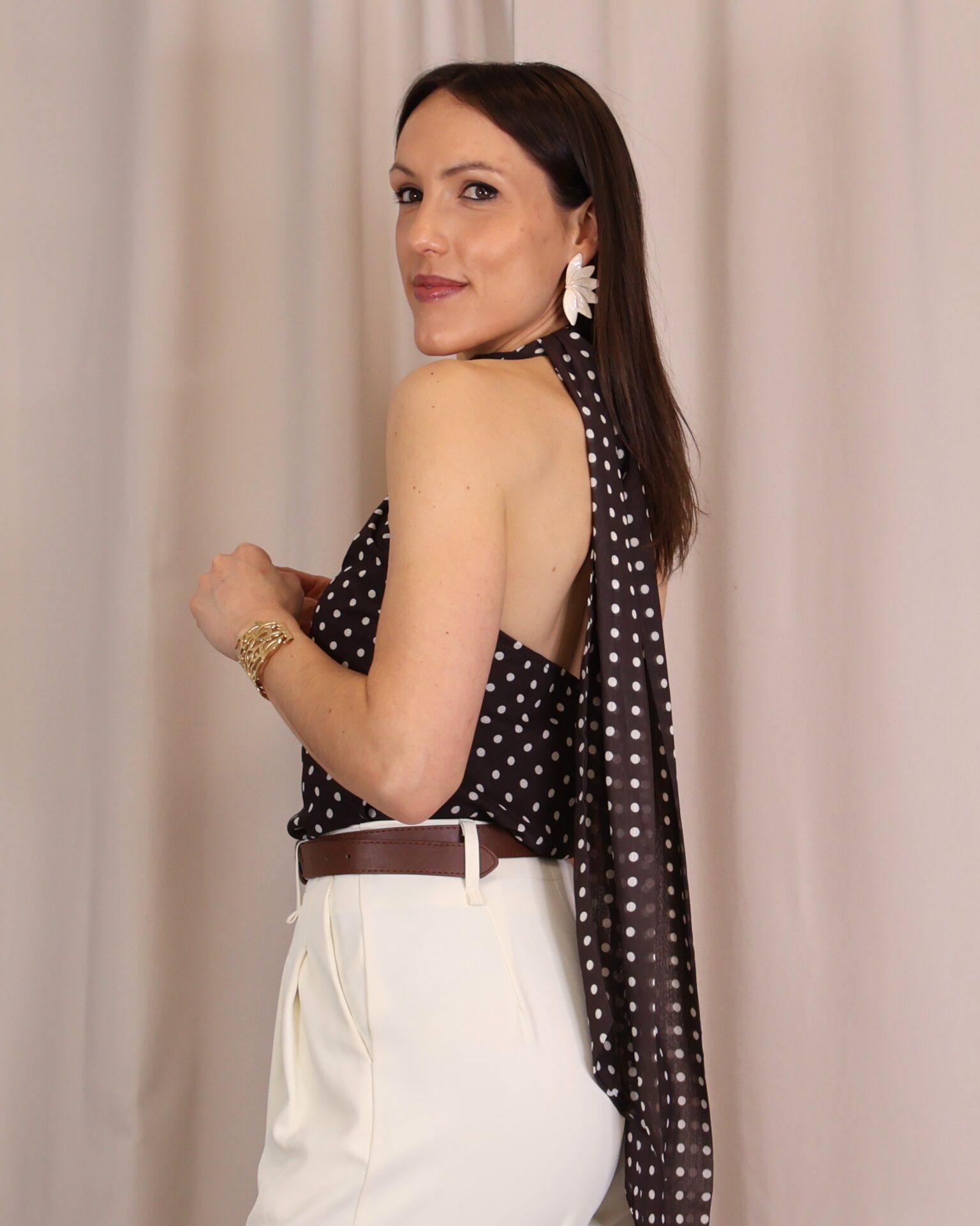 Top marrón chocolate con elegante estampado de lunares blancos, una combinación atemporal que aporta estilo y personalidad a cualquier look. Su diseño incorpora un favorecedor cuello halter con detalle de joya dorada, que añade un toque sofisticado y distintivo.