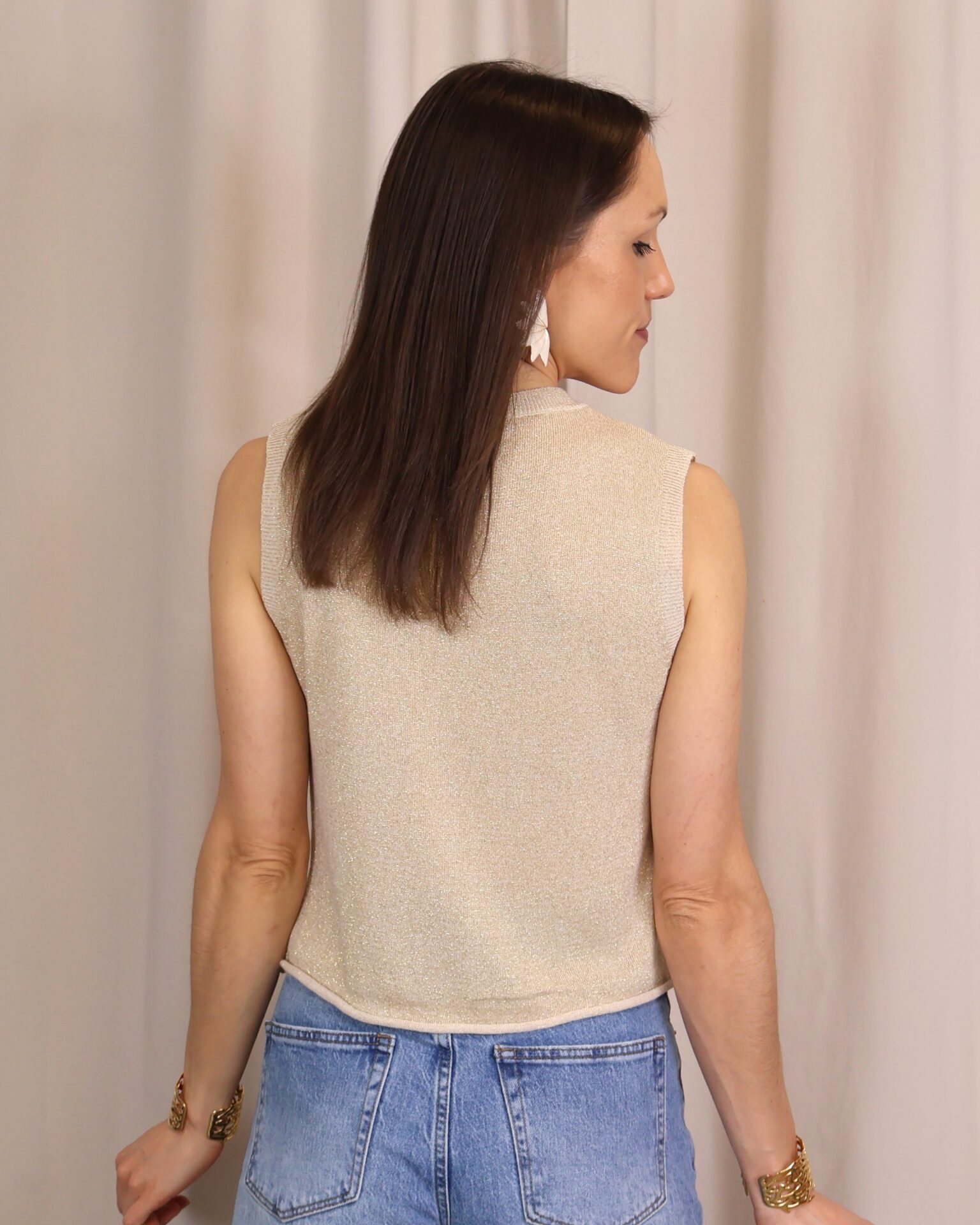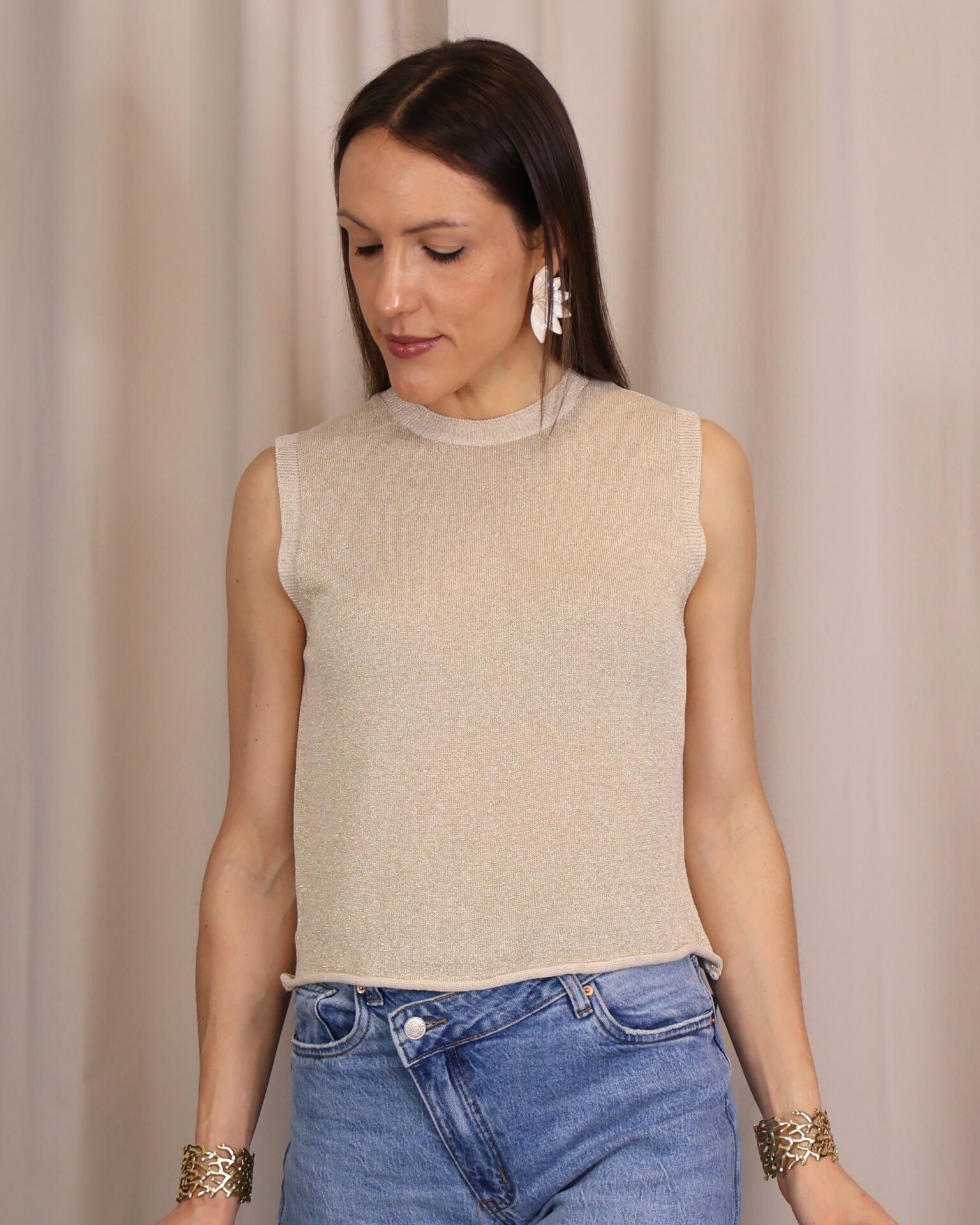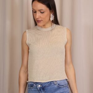 Top en color champagne de punto confeccionado en tejido lurex con delicado hilo metalizado que aporta un sutil brillo. Su diseño sin mangas y con cuello redondo lo convierte en una prenda versátil y cómoda, ideal para elevar cualquier look.