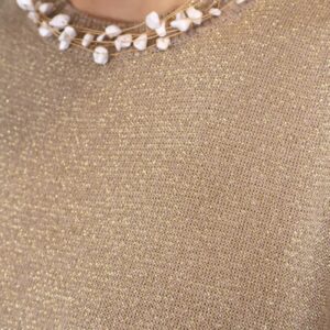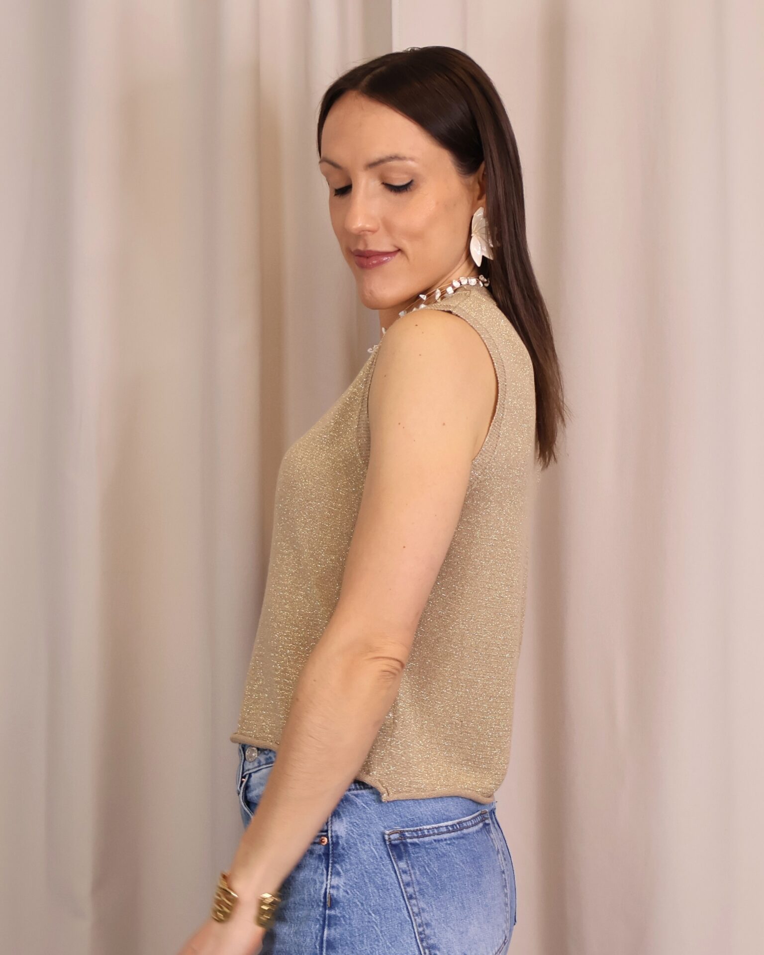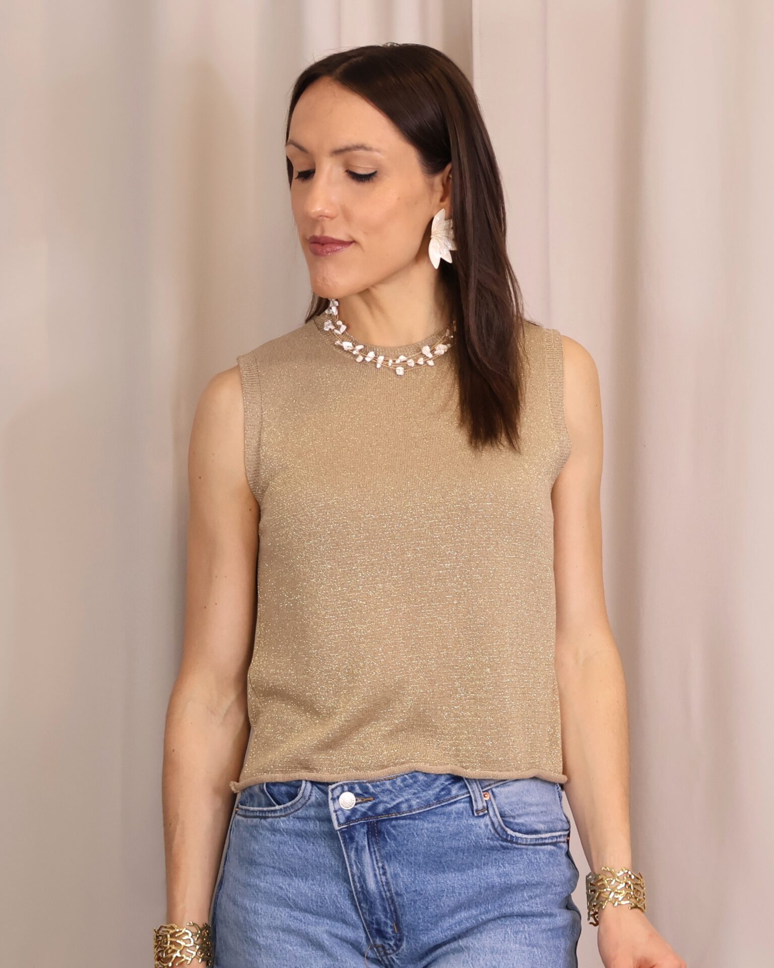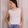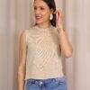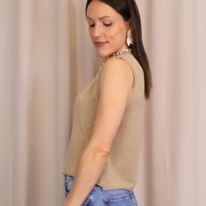 Top en color dorado de punto confeccionado en tejido lurex con delicado hilo metalizado que aporta un sutil brillo. Su diseño sin mangas y con cuello redondo lo convierte en una prenda versátil y cómoda, ideal para elevar cualquier look.