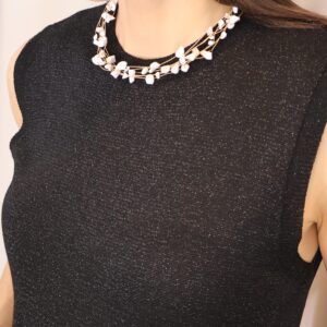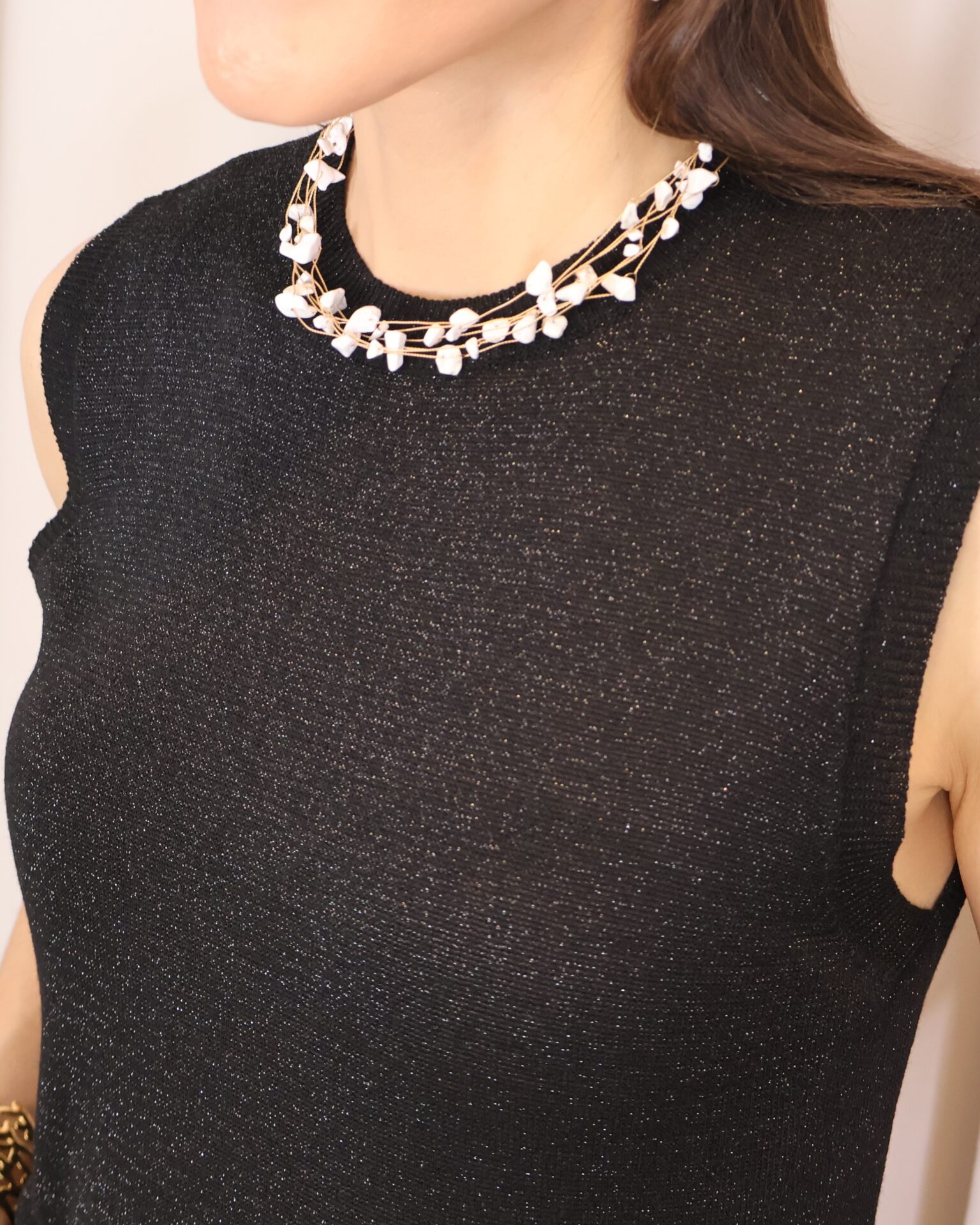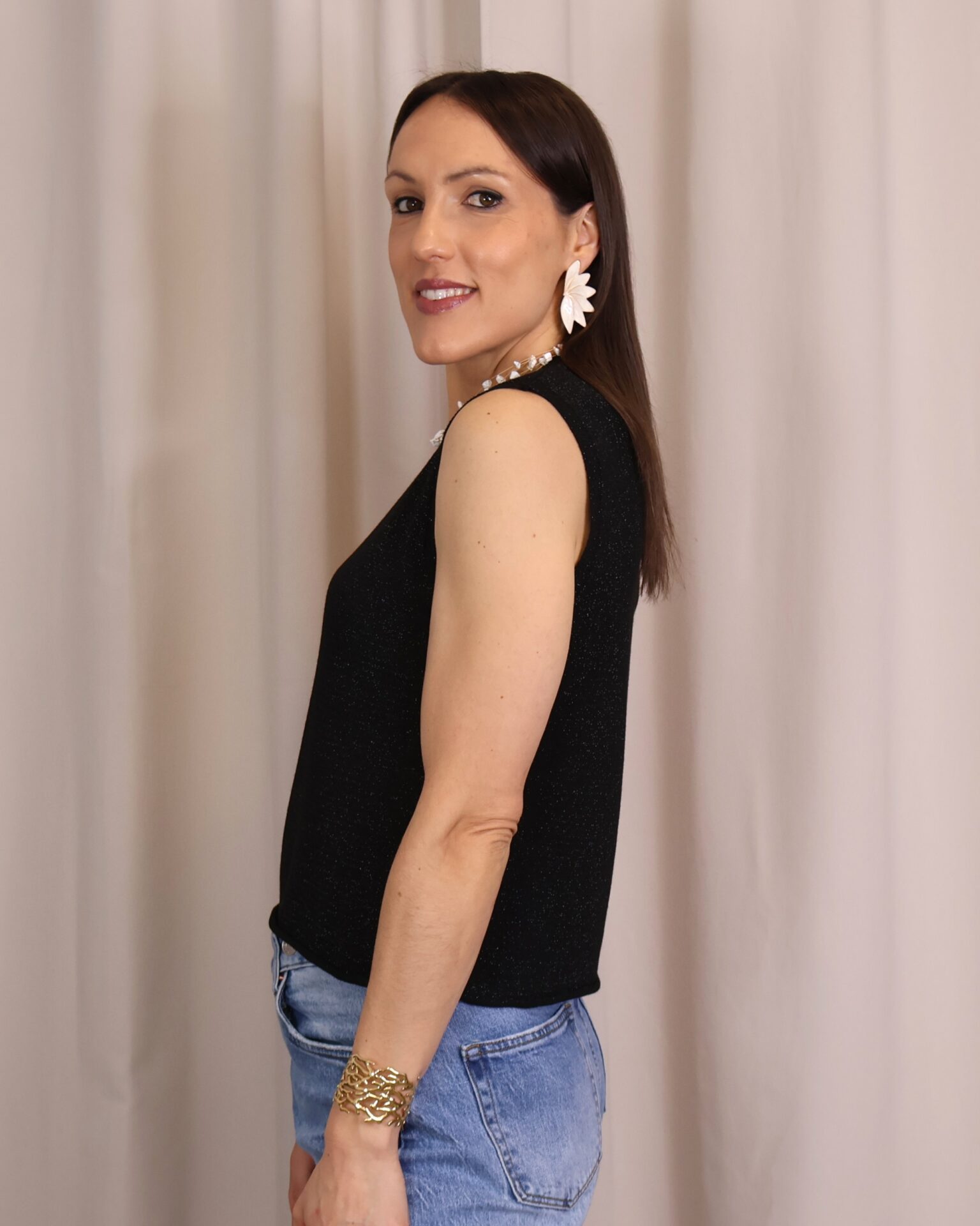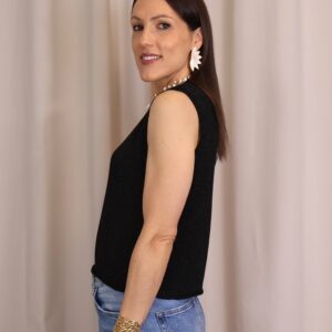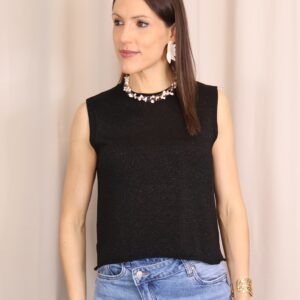 Top en color negro de punto confeccionado en tejido lurex con delicado hilo metalizado que aporta un sutil brillo. Su diseño sin mangas y con cuello redondo lo convierte en una prenda versátil y cómoda, ideal para elevar cualquier look.