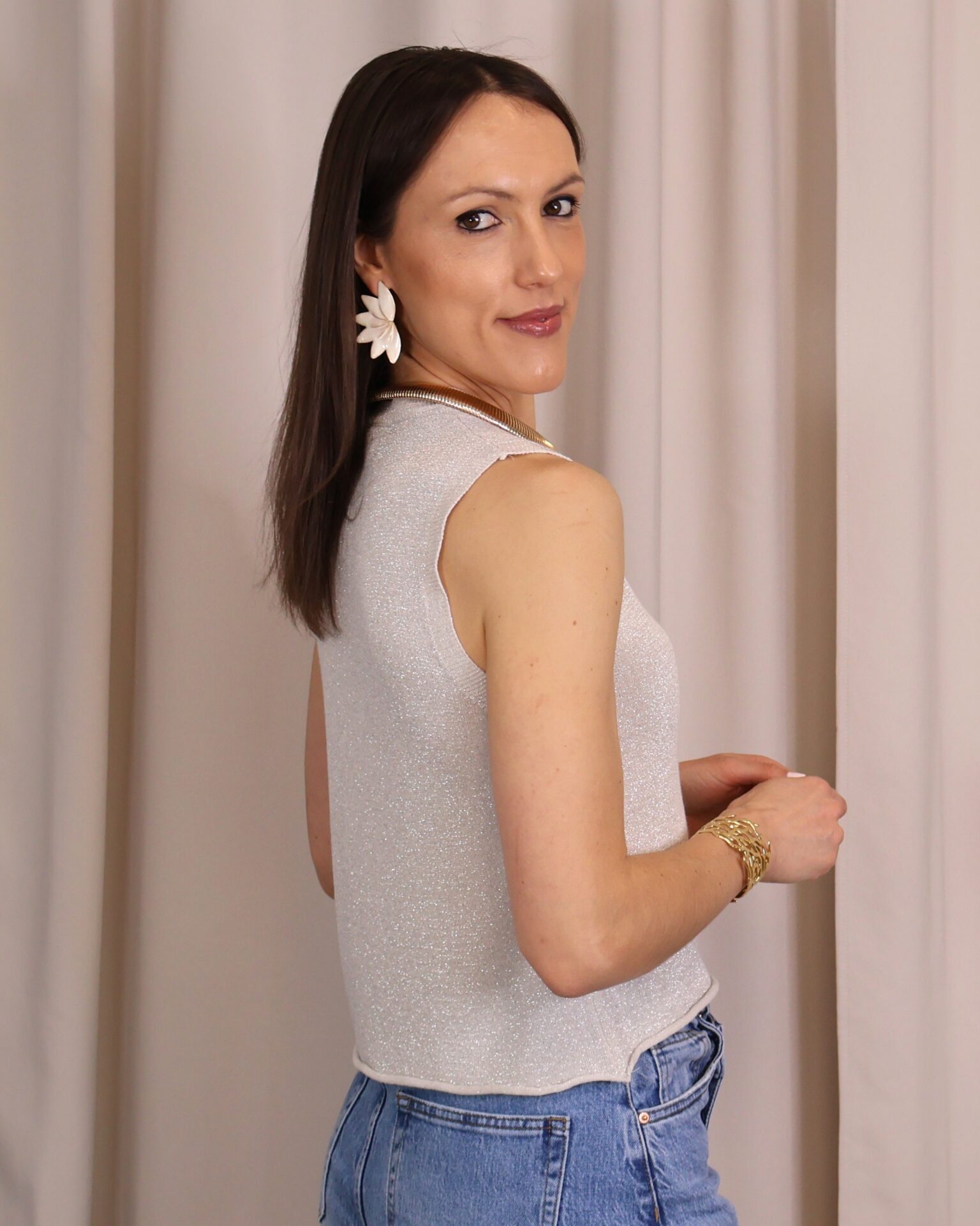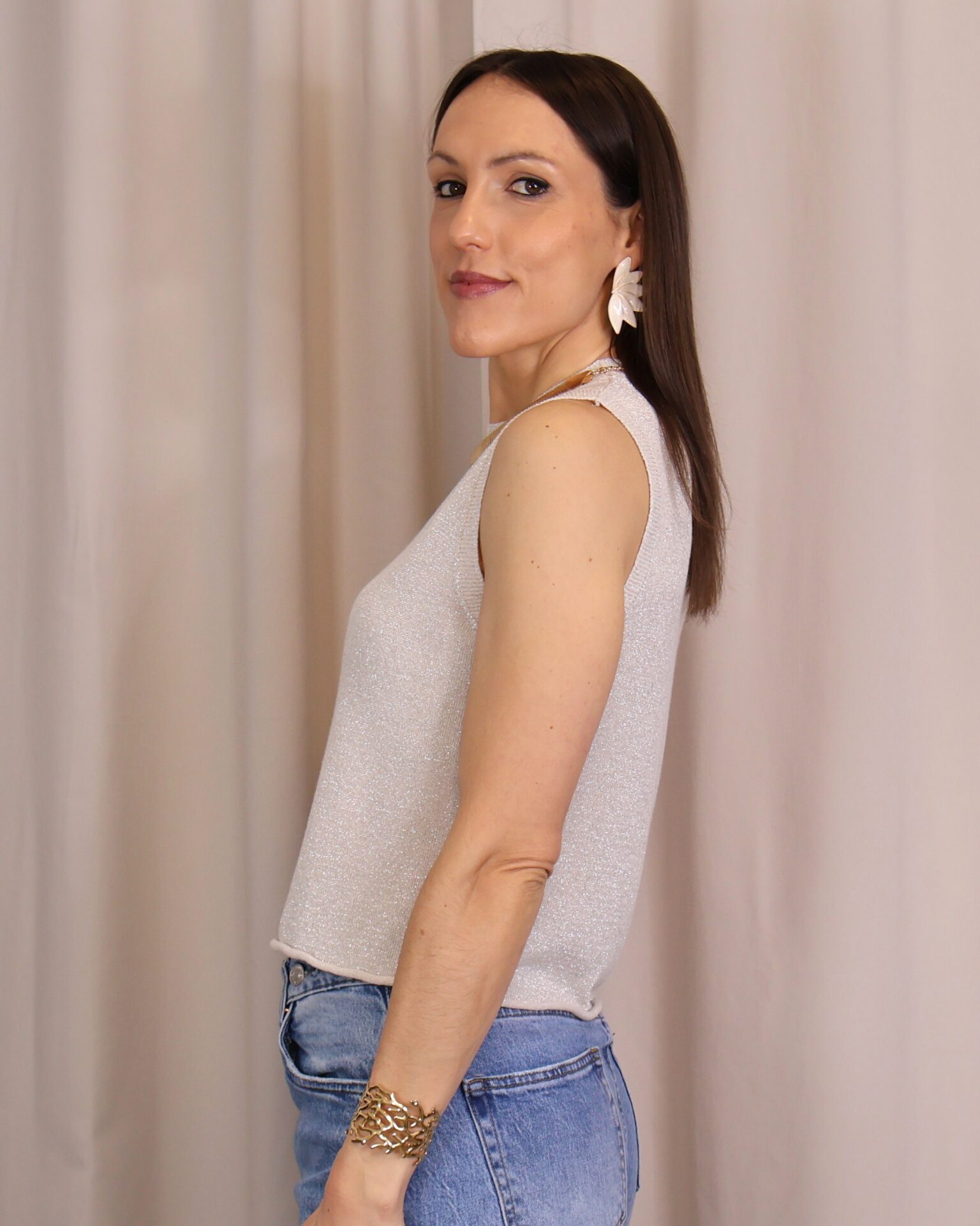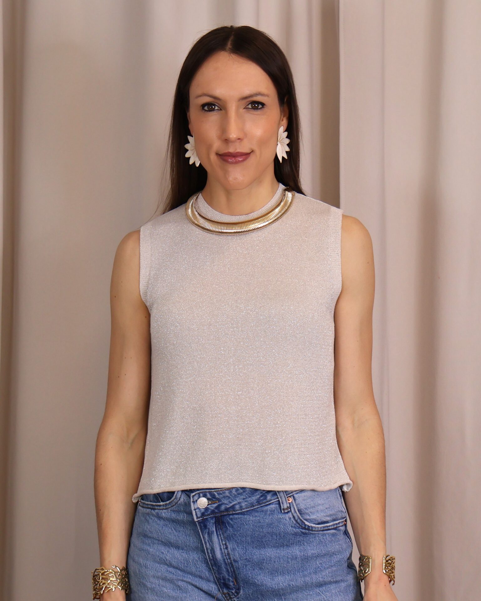 Top en color plata de punto confeccionado en tejido lurex con delicado hilo metalizado que aporta un sutil brillo. Su diseño sin mangas y con cuello redondo lo convierte en una prenda versátil y cómoda, ideal para elevar cualquier look.