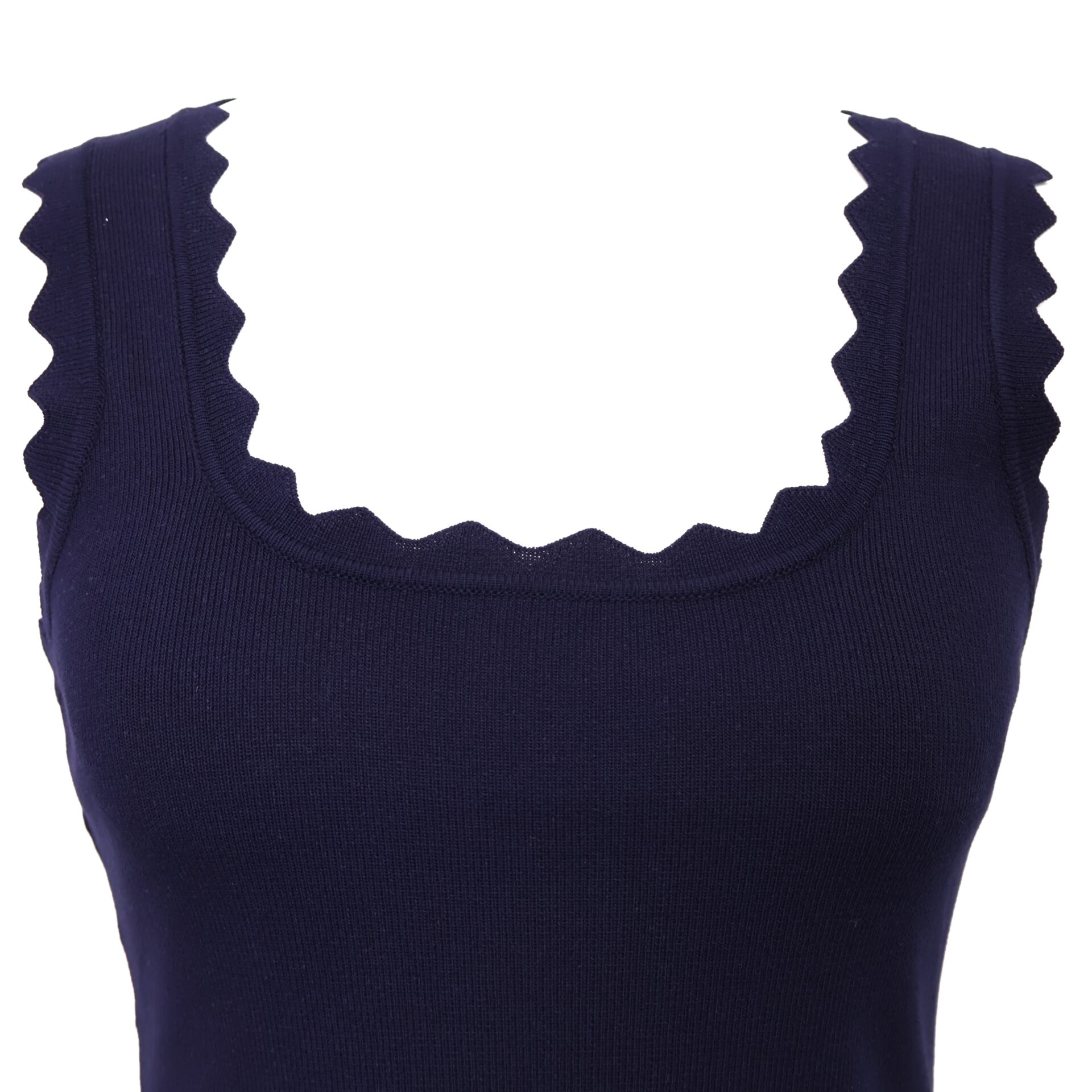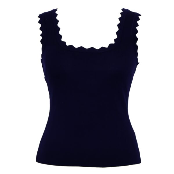 Top confeccionado en tejido elástico en color azul marino de tirantes con escote redondo. Detalle con terminación ondulada en cuello y hombros.