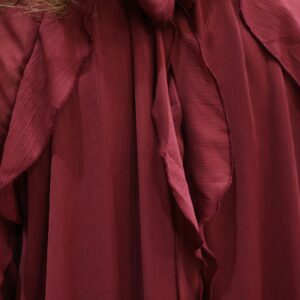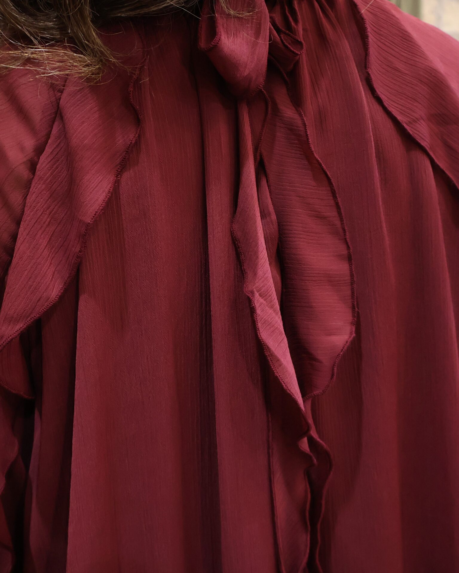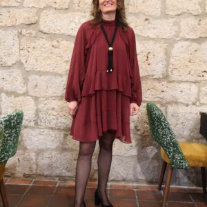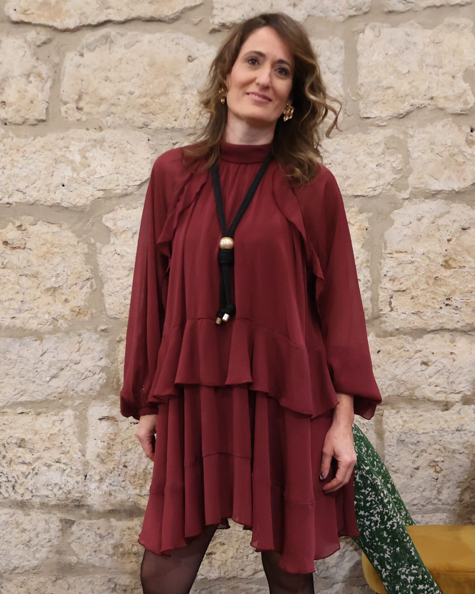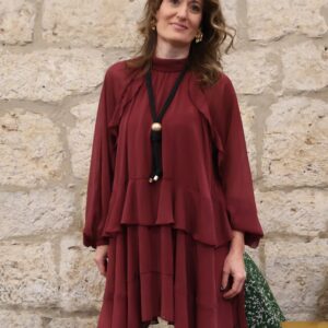 Vestido corto estilo boho de color burdeos con un diseño fluido y femenino, presenta capas de volantes que aportan movimiento y un estilo romántico, mientras que su cuello alto fruncido añade un toque sofisticado, el cual se cierra con una lazada decorativa en la parte de atrás el cuello.