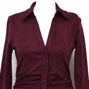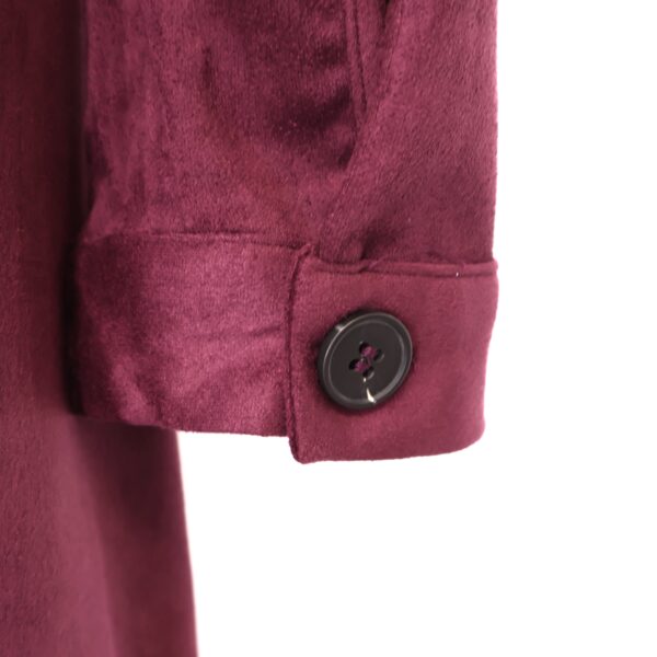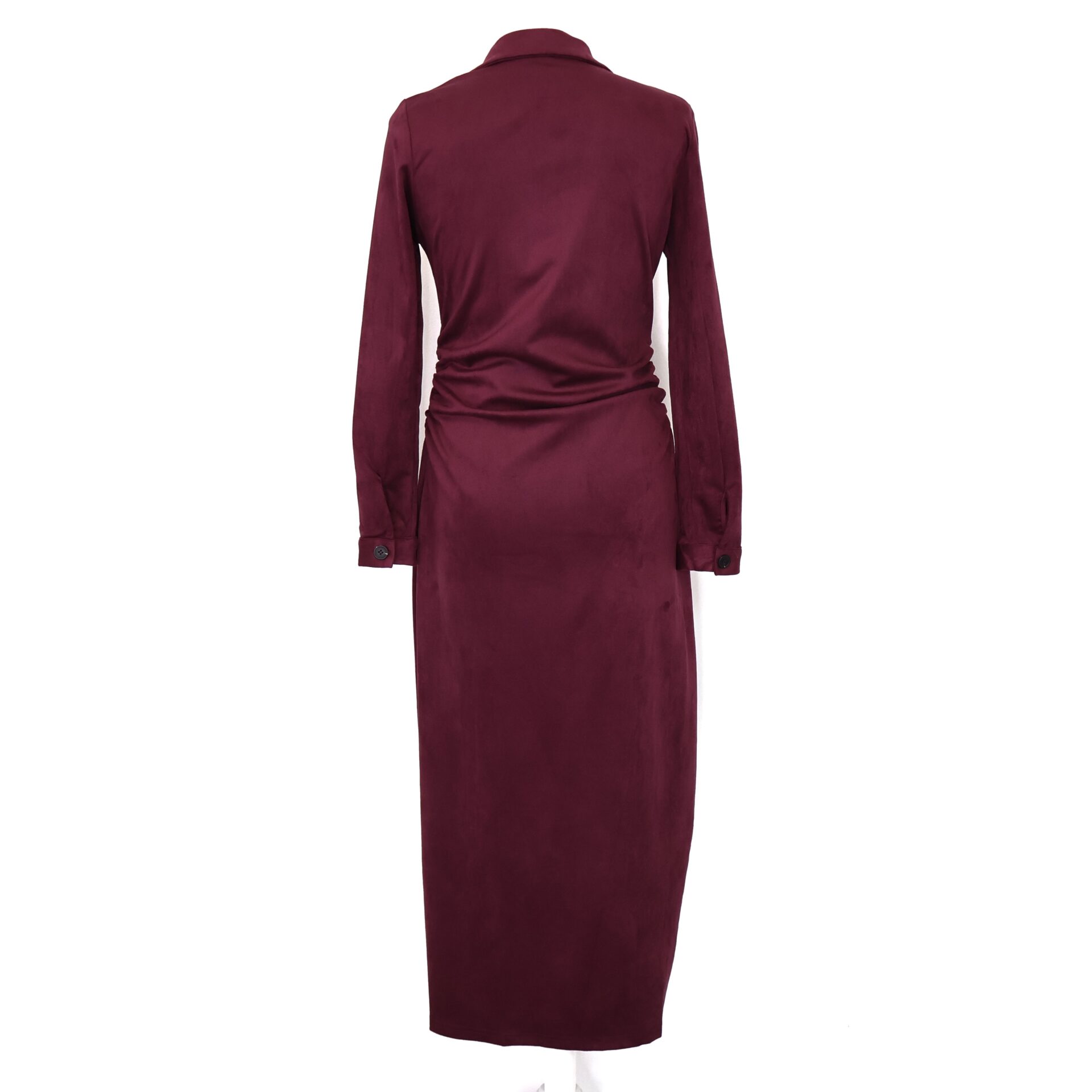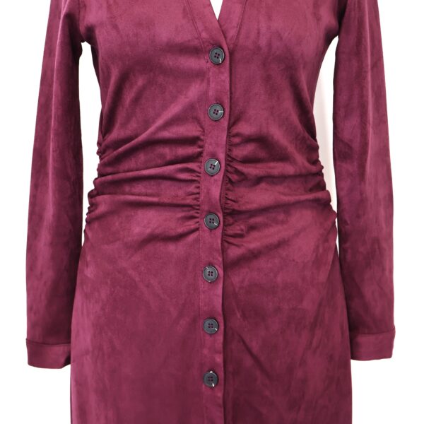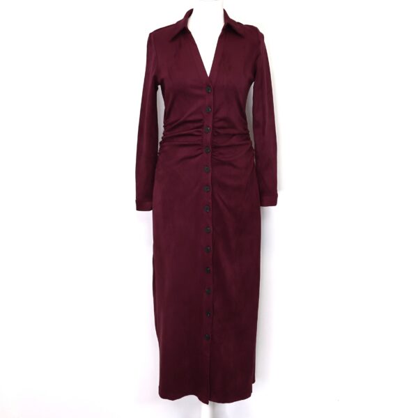 Vestido largo confeccionado en ante de color burdeos. Escote en pico con cuello camisa. Abotonado de arriba a abajo. Efecto drapeado en la parte de la cintura. Con manga larga y botón en los puños.