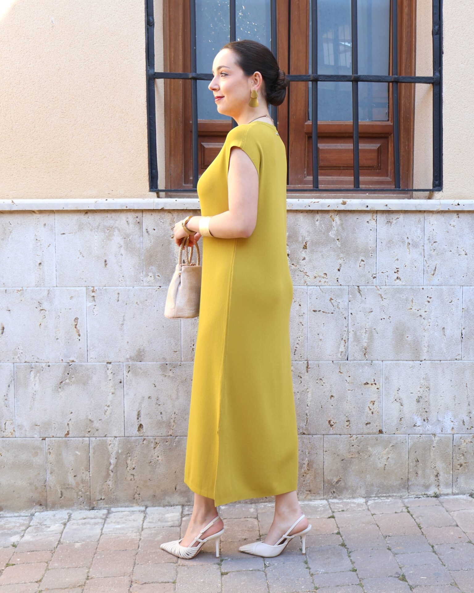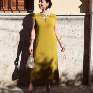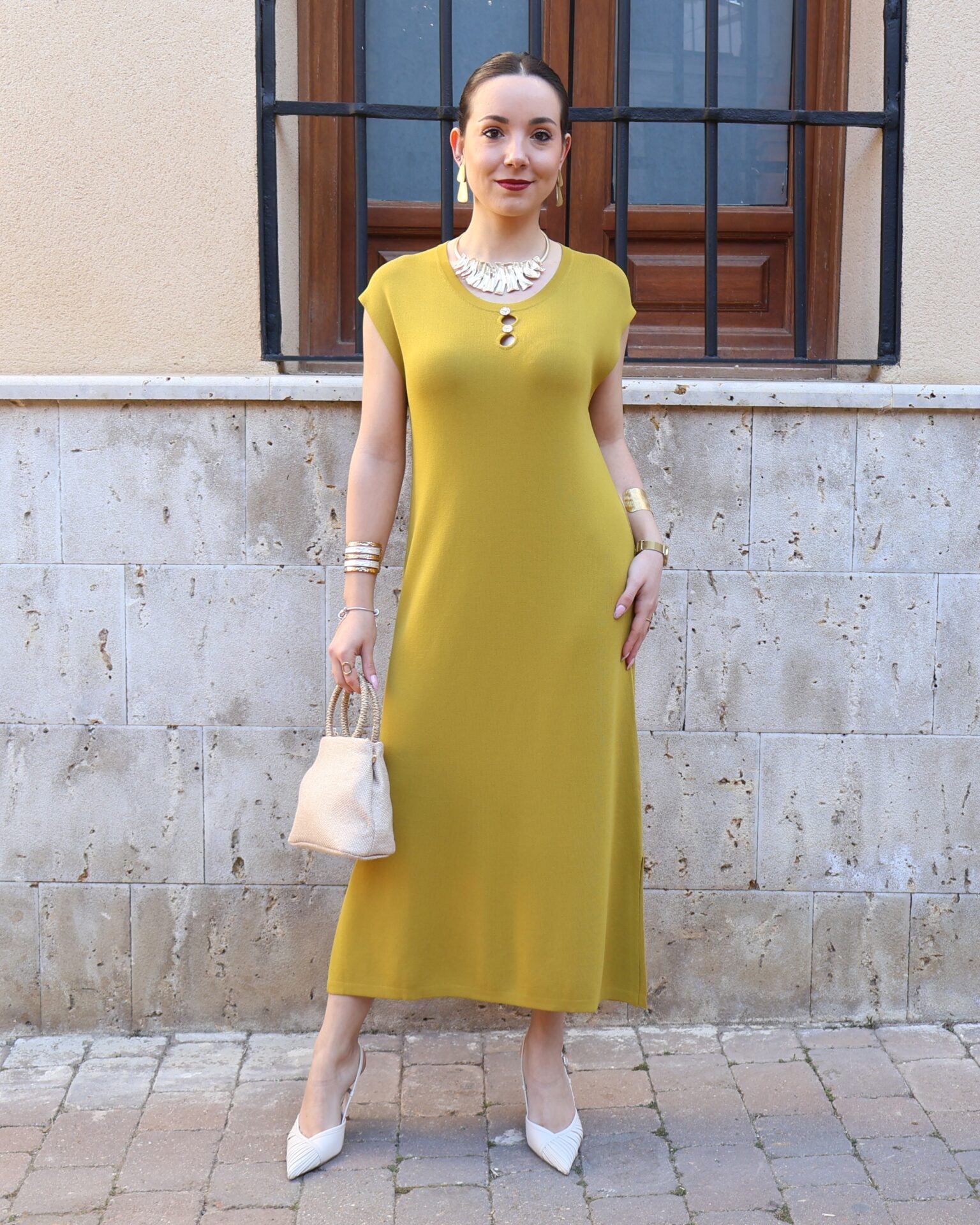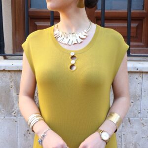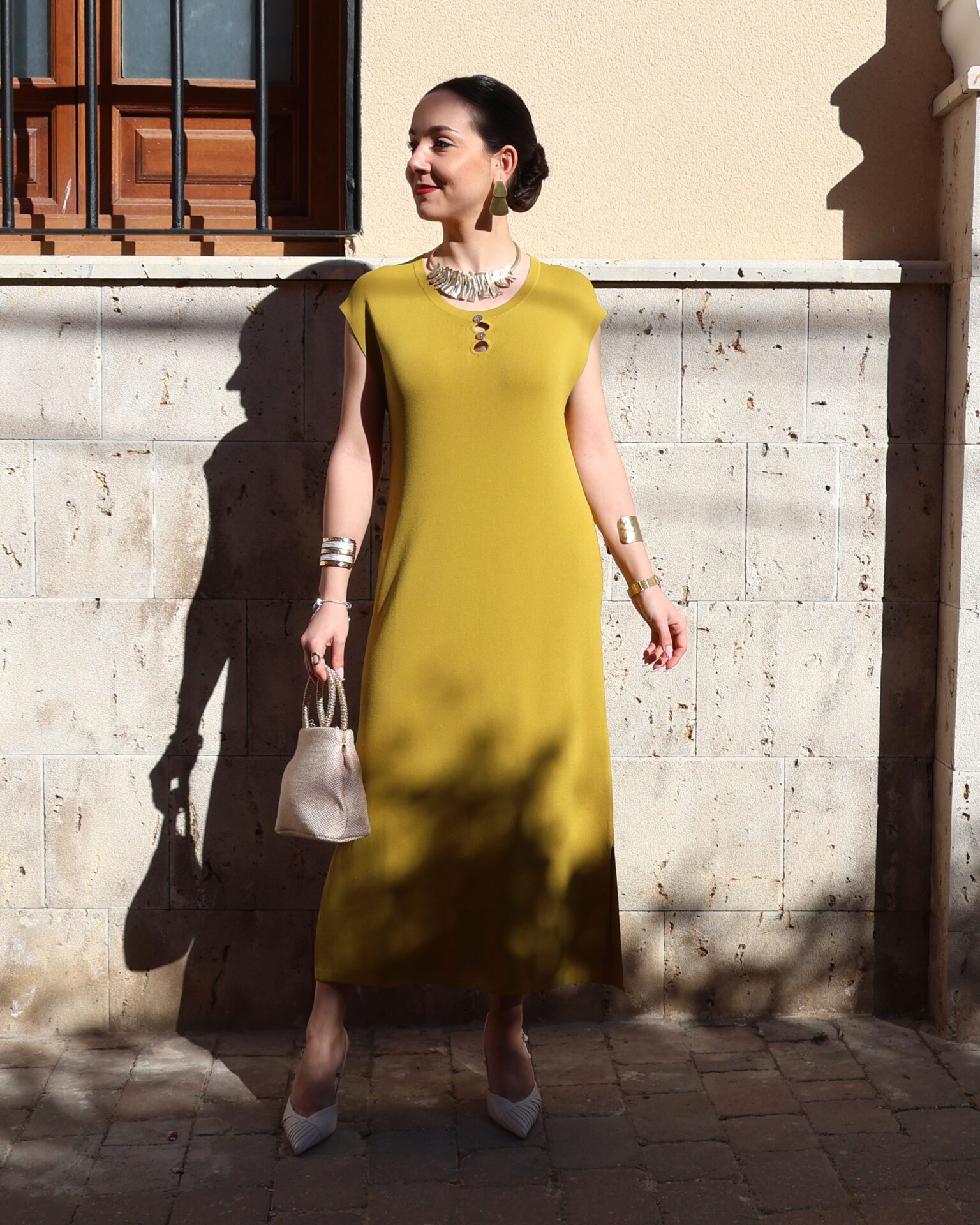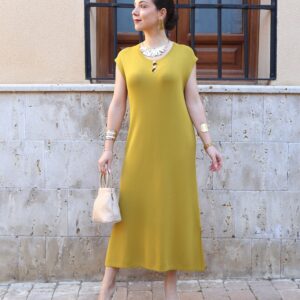 Vestido de punto fino en color verde lima, confeccionado en tejido suave que se adapta a la silueta proporcionando comodidad y una caída elegante. Diseño sin mangas con cuello redondo y botones en disposición vertical, que aportan luz y crean sutiles aberturas tipo cut-out para un toque moderno y femenino. Incluye aberturas laterales en el bajo que favorecen el movimiento y estilizan la figura.