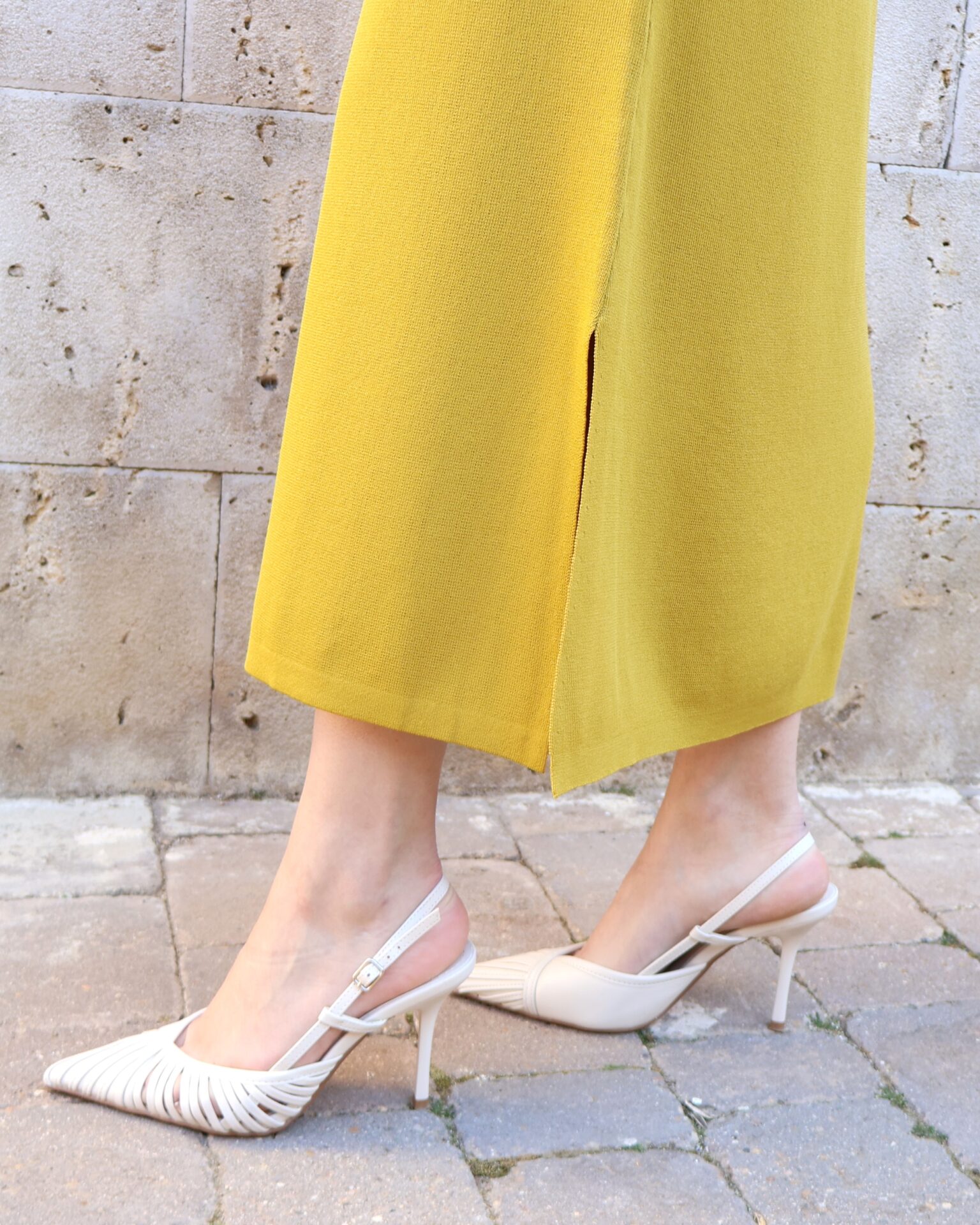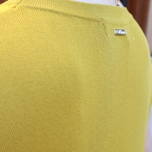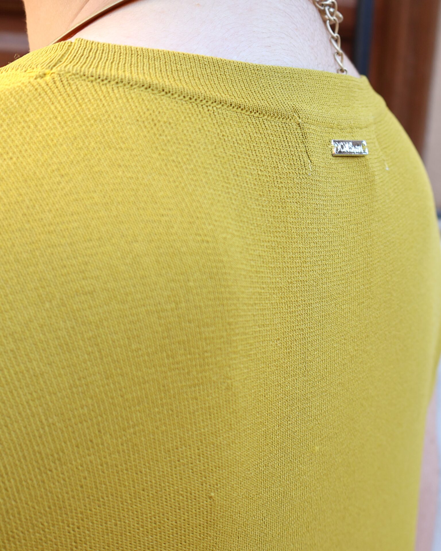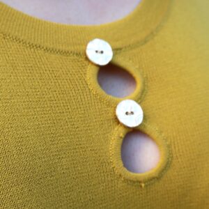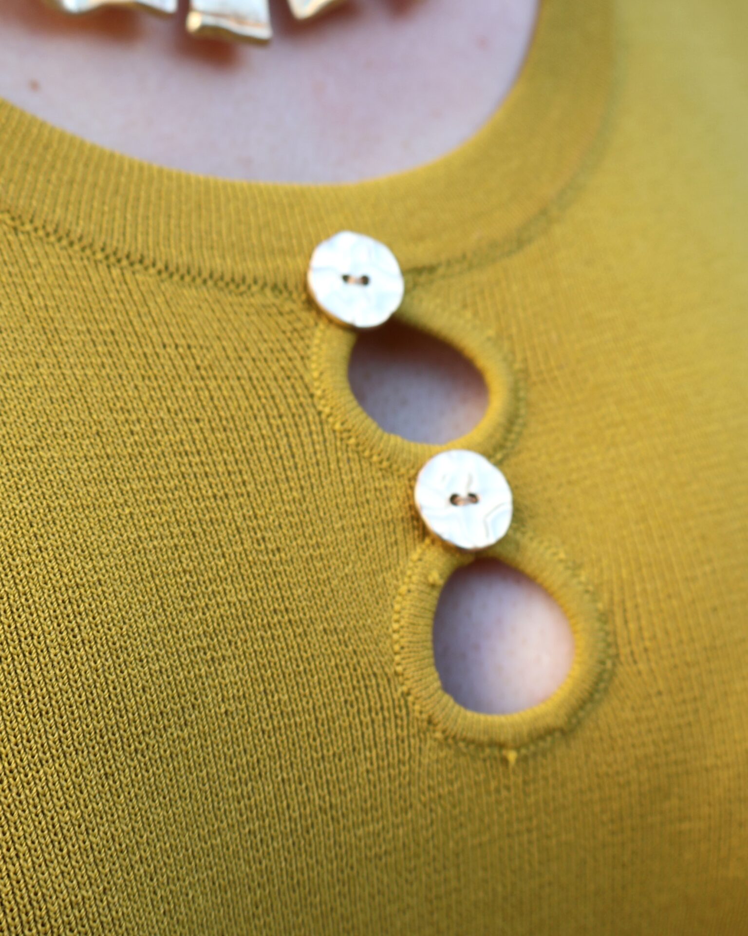 Vestido de punto fino en color verde lima, confeccionado en tejido suave que se adapta a la silueta proporcionando comodidad y una caída elegante. Diseño sin mangas con cuello redondo y botones en disposición vertical, que aportan luz y crean sutiles aberturas tipo cut-out para un toque moderno y femenino. Incluye aberturas laterales en el bajo que favorecen el movimiento y estilizan la figura.