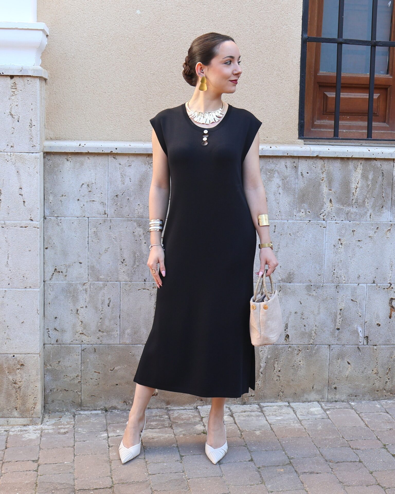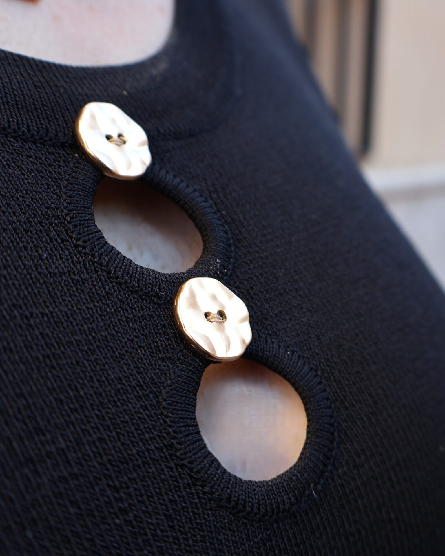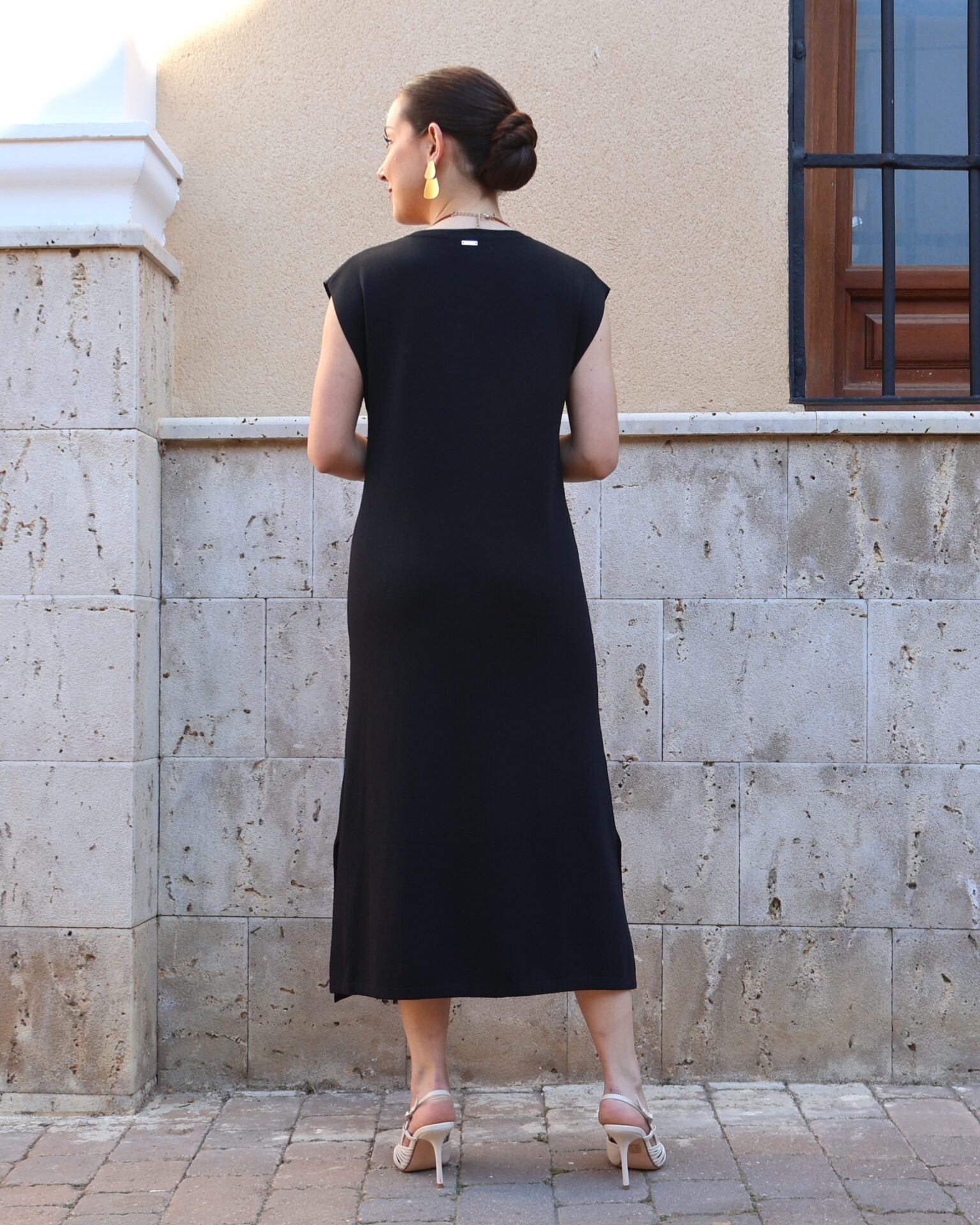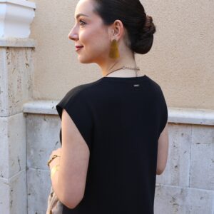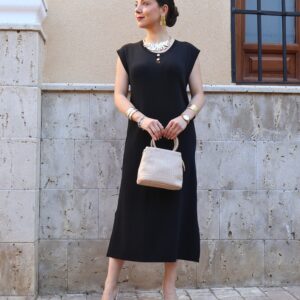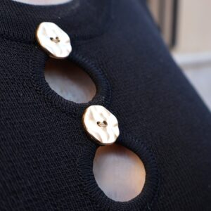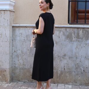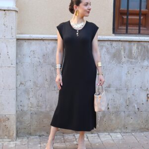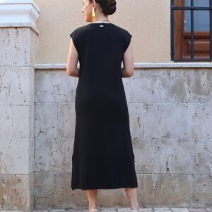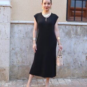 Vestido de punto fino en color negro, confeccionado en tejido suave que se adapta a la silueta proporcionando comodidad y una caída elegante. Diseño sin mangas con cuello redondo y botones en disposición vertical, que aportan luz y crean sutiles aberturas tipo cut-out para un toque moderno y femenino. Incluye aberturas laterales en el bajo que favorecen el movimiento y estilizan la figura.