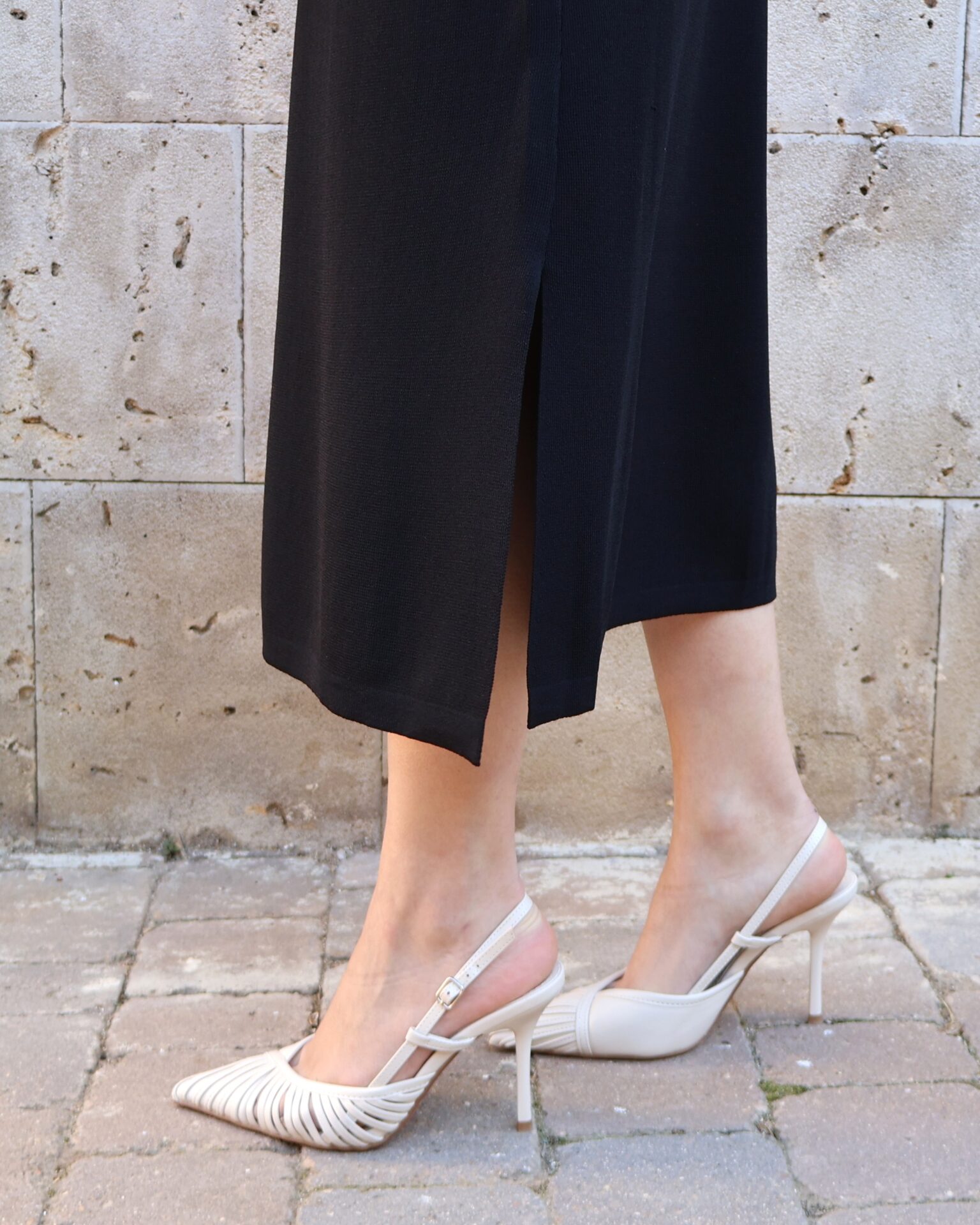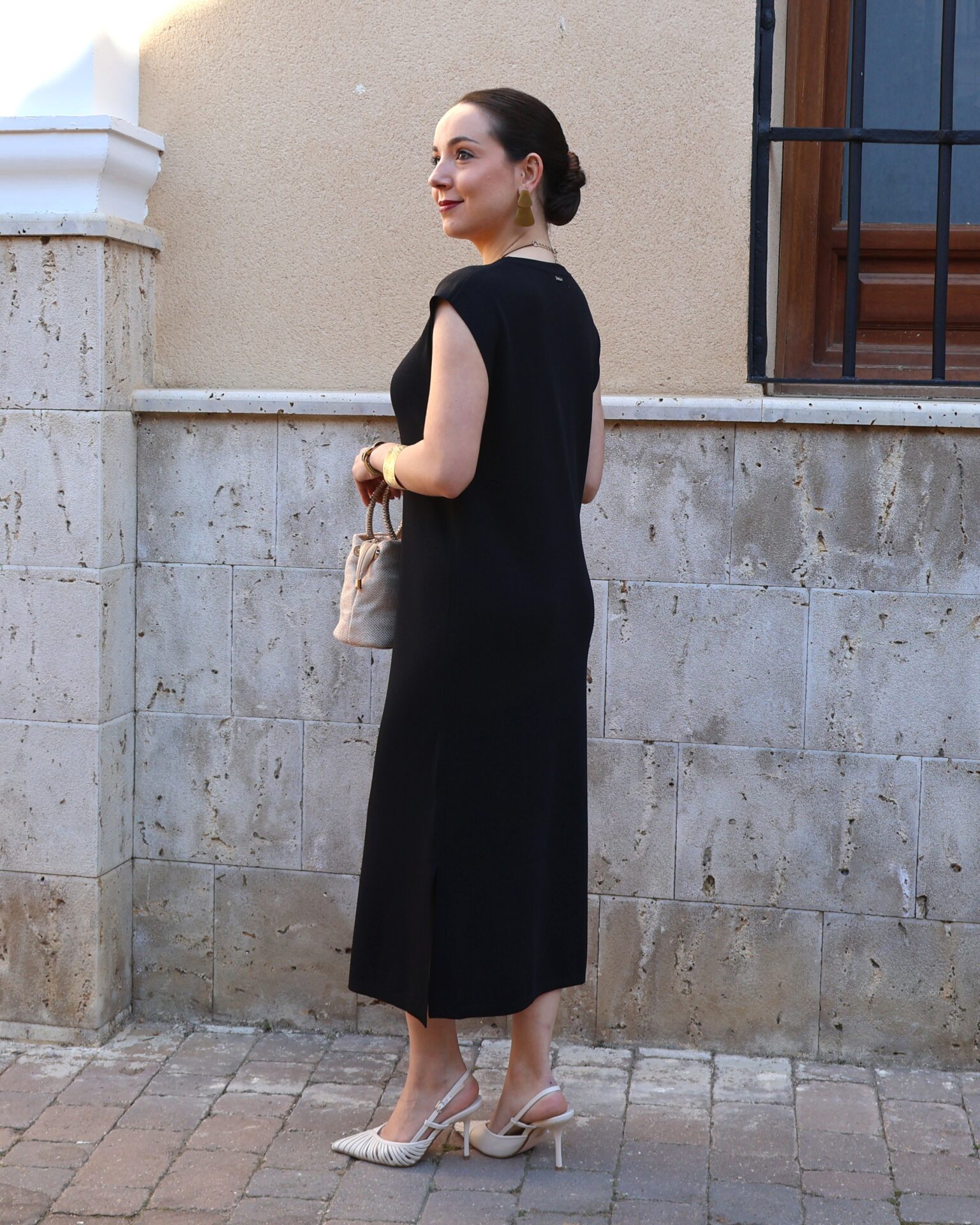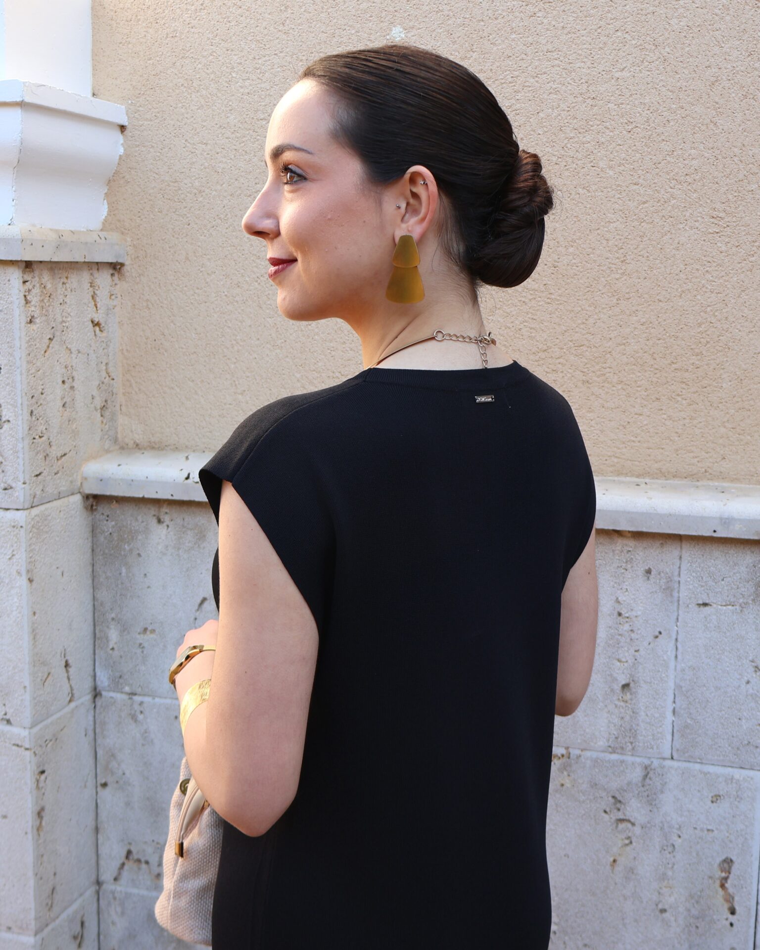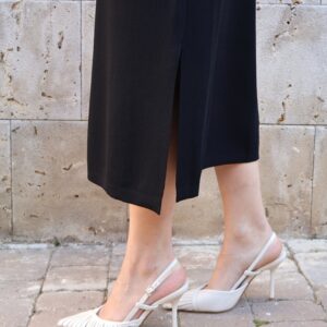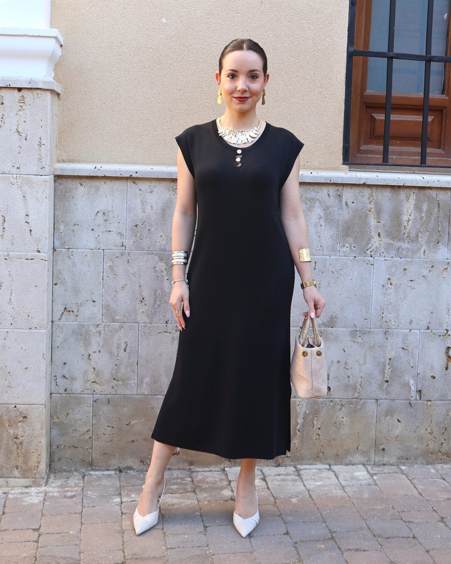 Vestido de punto fino en color negro, confeccionado en tejido suave que se adapta a la silueta proporcionando comodidad y una caída elegante. Diseño sin mangas con cuello redondo y botones en disposición vertical, que aportan luz y crean sutiles aberturas tipo cut-out para un toque moderno y femenino. Incluye aberturas laterales en el bajo que favorecen el movimiento y estilizan la figura.