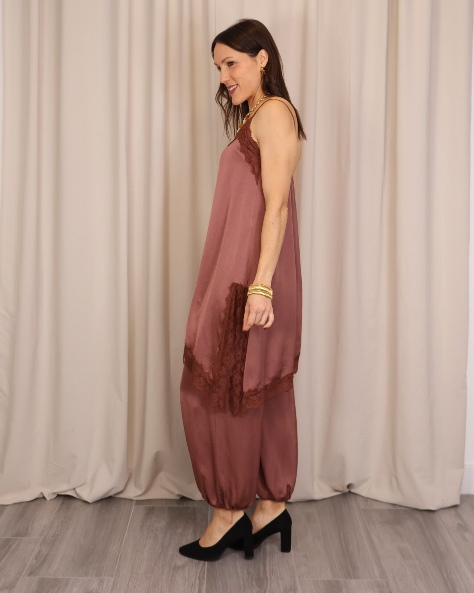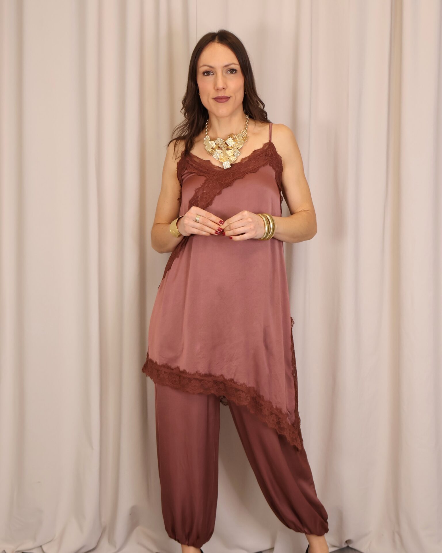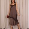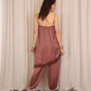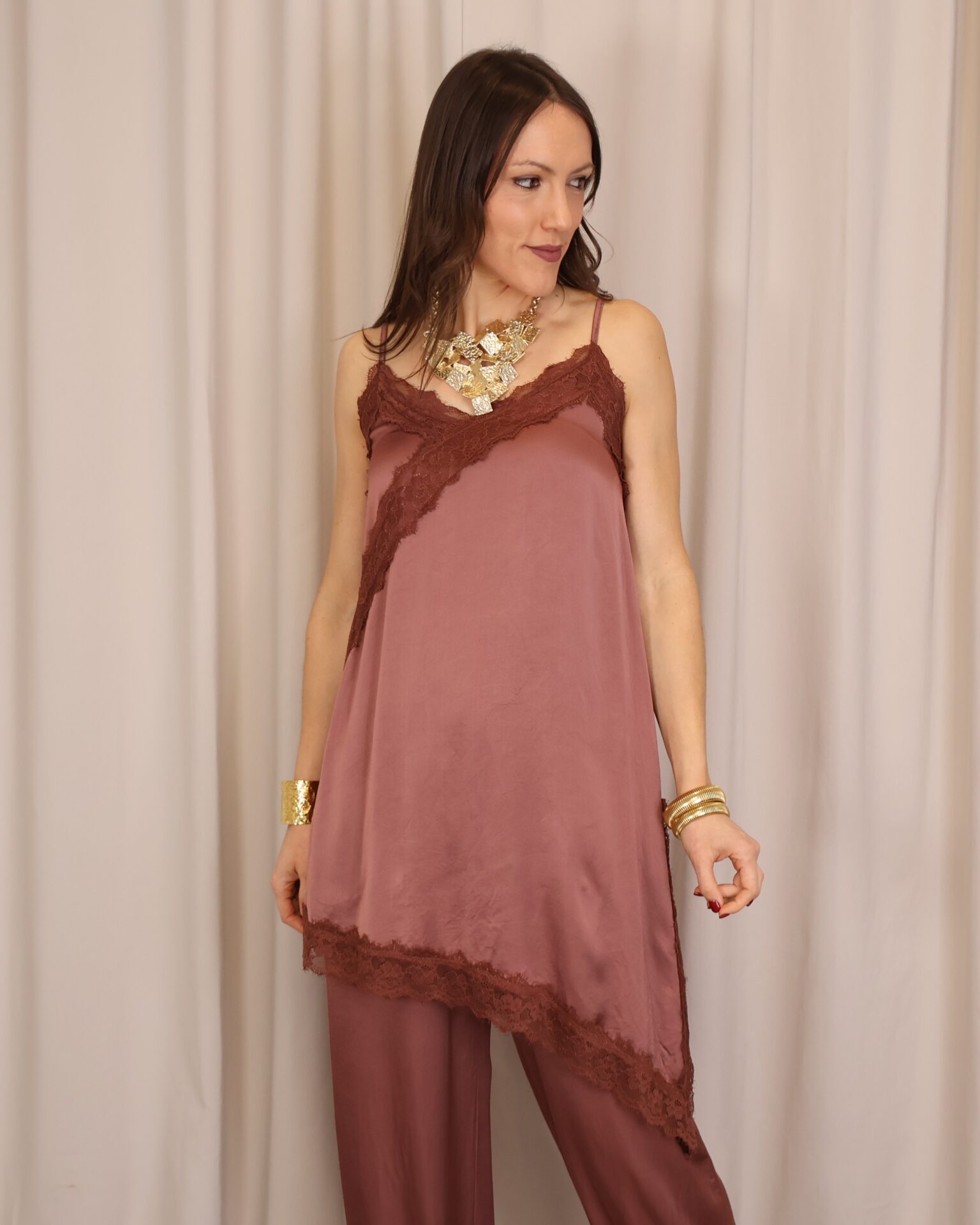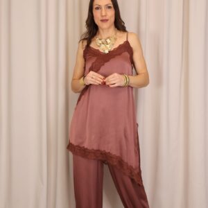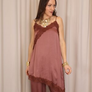Vestido lencero de corte asimétrico en color teja, con tirantes regulables que permiten un ajuste cómodo y favorecedor. Incorpora puntilla decorativa en el pecho y en la parte inferior con acabado asimétrico, aportando un toque romántico y sofisticado. Cuenta con abertura lateral que añade movimiento y un punto sensual al diseño, además de goma elástica en la parte trasera de la espalda para una mayor adaptabilidad y confort.
