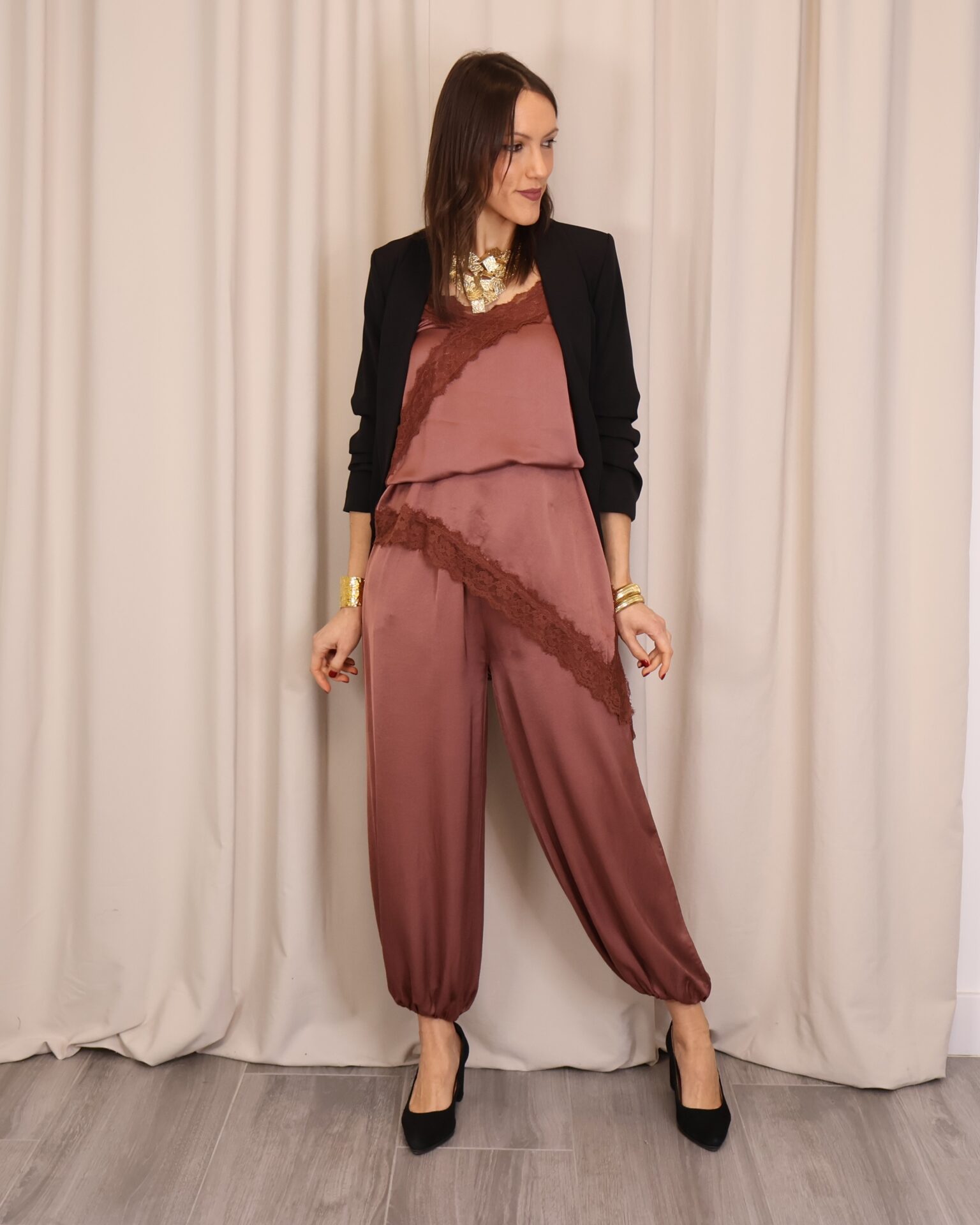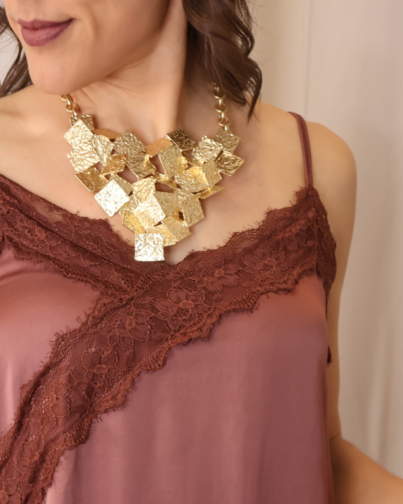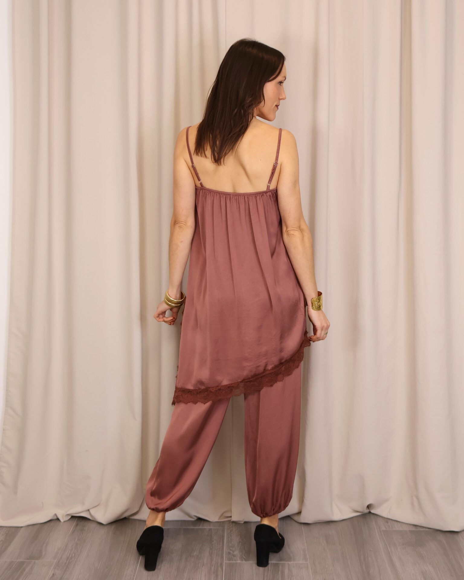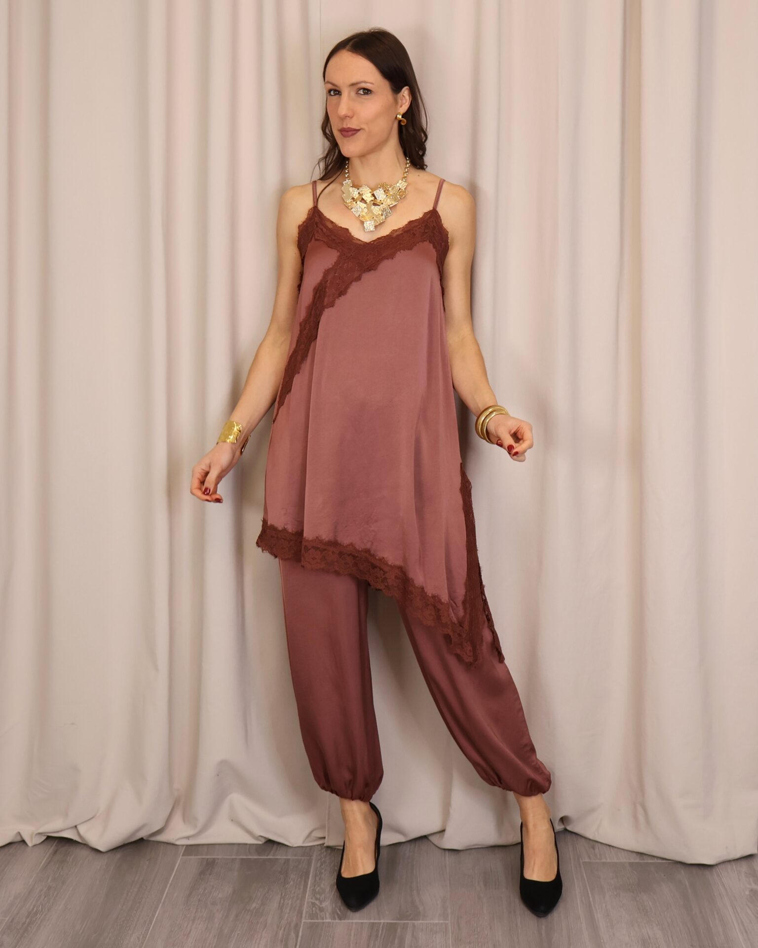 Vestido lencero de corte asimétrico en color teja, con tirantes regulables que permiten un ajuste cómodo y favorecedor. Incorpora puntilla decorativa en el pecho y en la parte inferior con acabado asimétrico, aportando un toque romántico y sofisticado. Cuenta con abertura lateral que añade movimiento y un punto sensual al diseño, además de goma elástica en la parte trasera de la espalda para una mayor adaptabilidad y confort.
