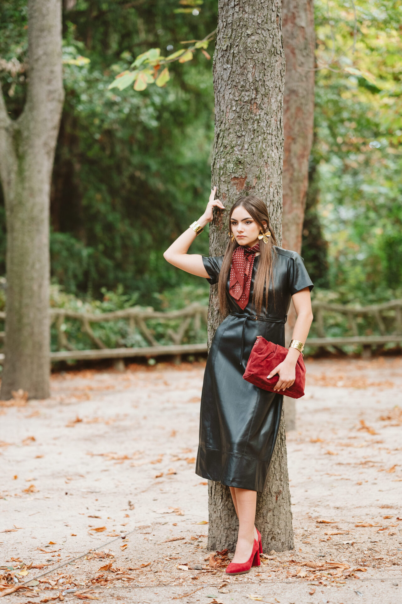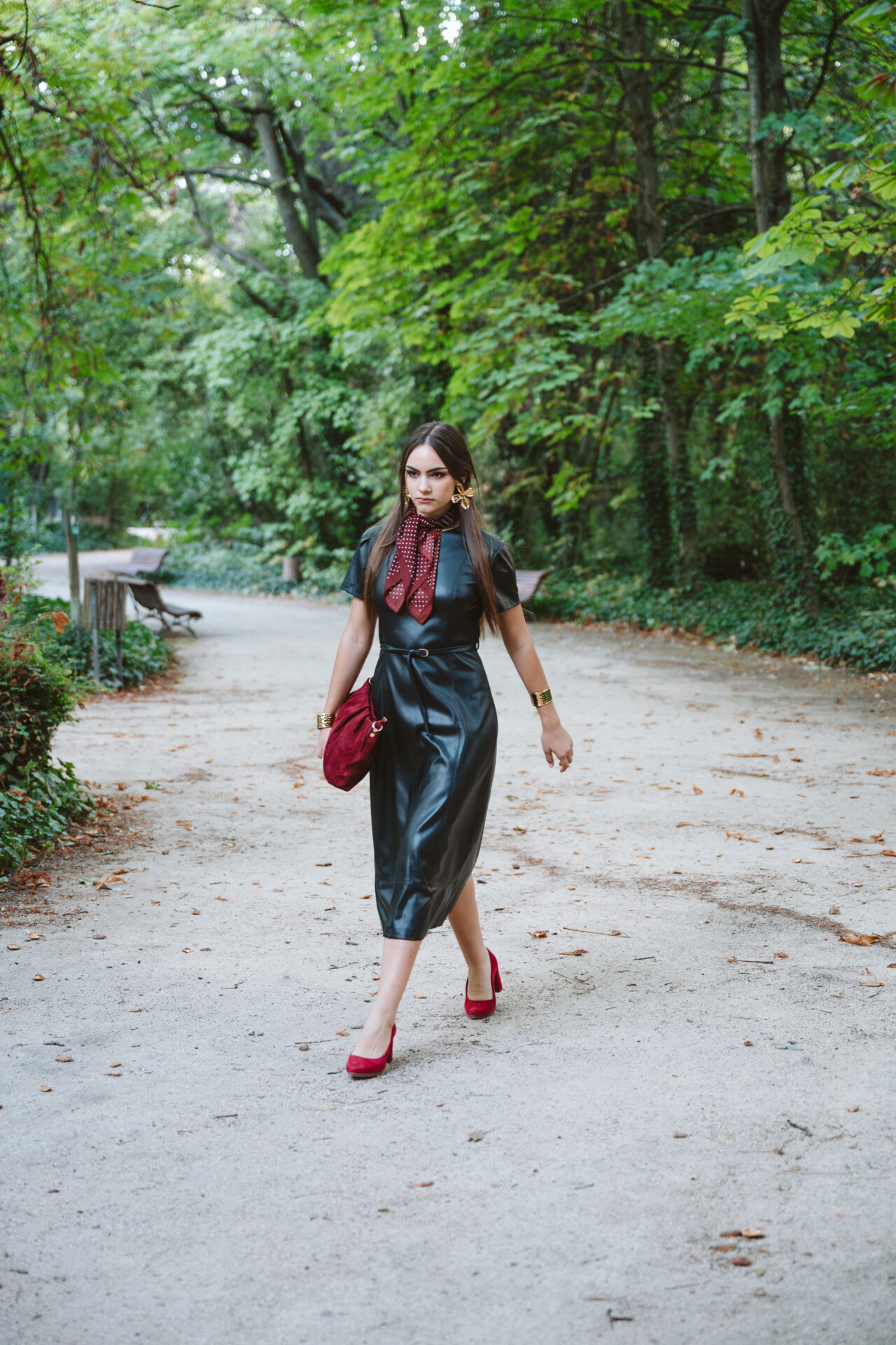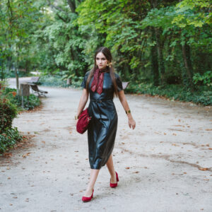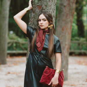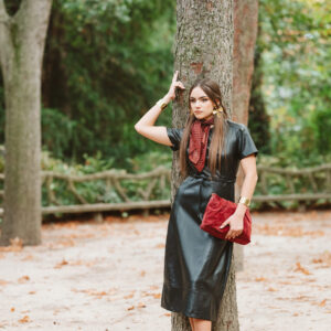 Vestido de manga corta y corte midi confeccionado en piel sintética en color negro. Cinturón incluido, el cual permite ajustar un poquito la cintura. Cierre trasero con cremallera invisible.